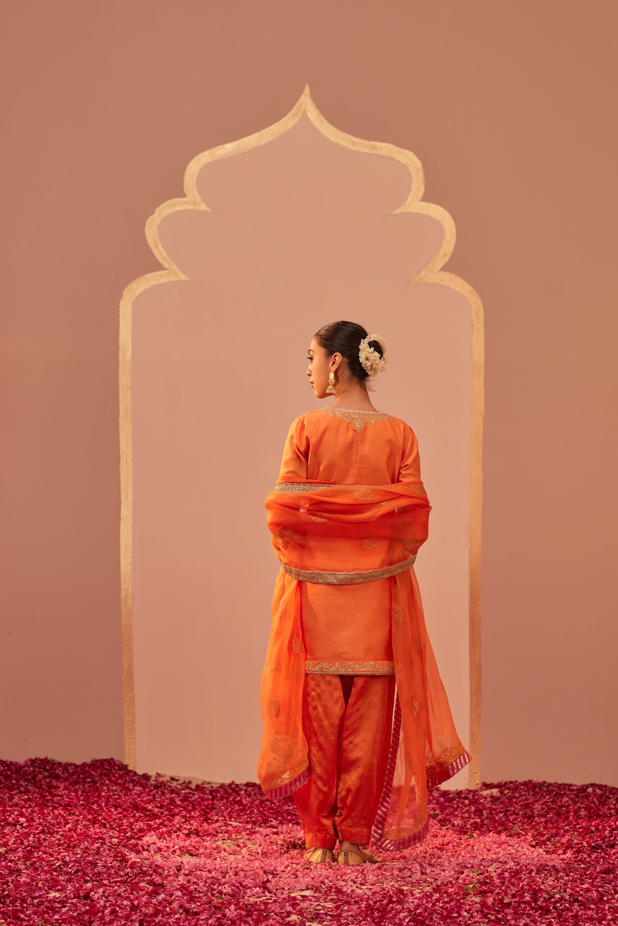 This ensemble is made in pure silk chanderi, a bamberg satin salwar teamed up with a silk organza dupatta. The kurta has a zero neck with a placket and three-quarter sleeves. The outfit is adorned with a signature block print and is highlighted with tilla and patra embroidery. It is finished with a pure benarsi fabric and gota detailing.