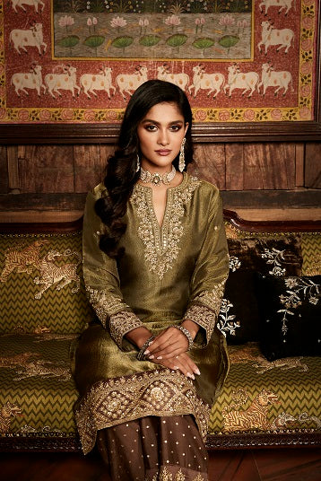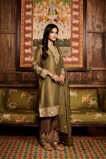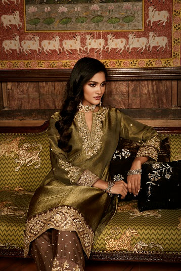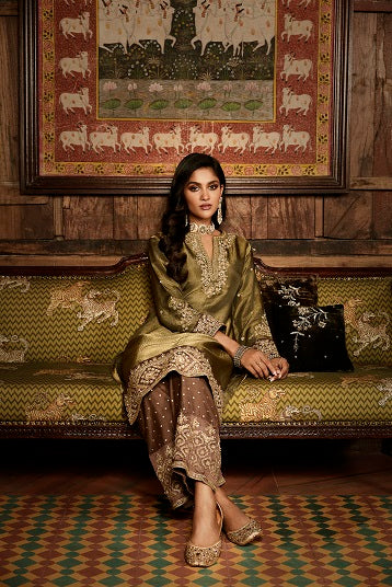 | The Heritage Suit set is a symbol of Matsya's intimate relationship with traditions, the past & its craft. The base is a georgette tissue hand dyed in a tarnished olive colour. The embroidery is a subtle kasab ari delicately decorated with the most vintage zardozi work. The artwork is inspired by indian Heritage and the piece brings a classic minimal opulence. The pants feature a beautiful border in the same craft on a rocky brown. The old world glamour in the colours is unmatched. |