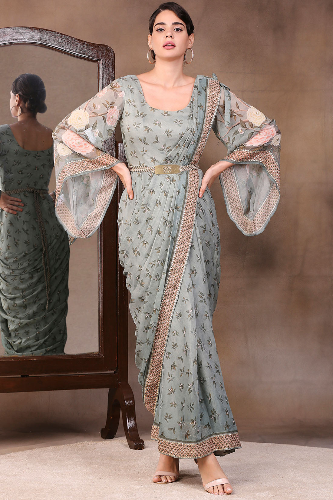 Green vintage trails printed pre-stitched saree dress with metal belt