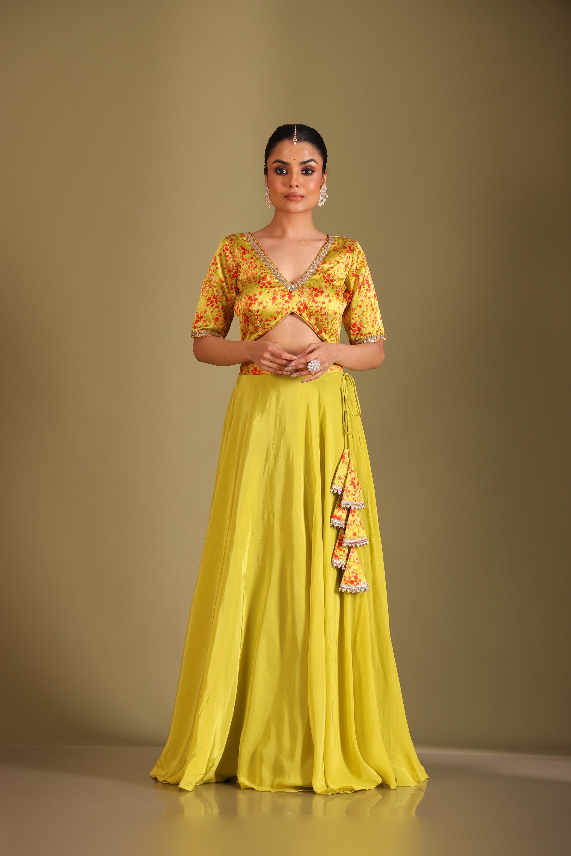 Gulzar lime printed blouse with lehenga and dupatta