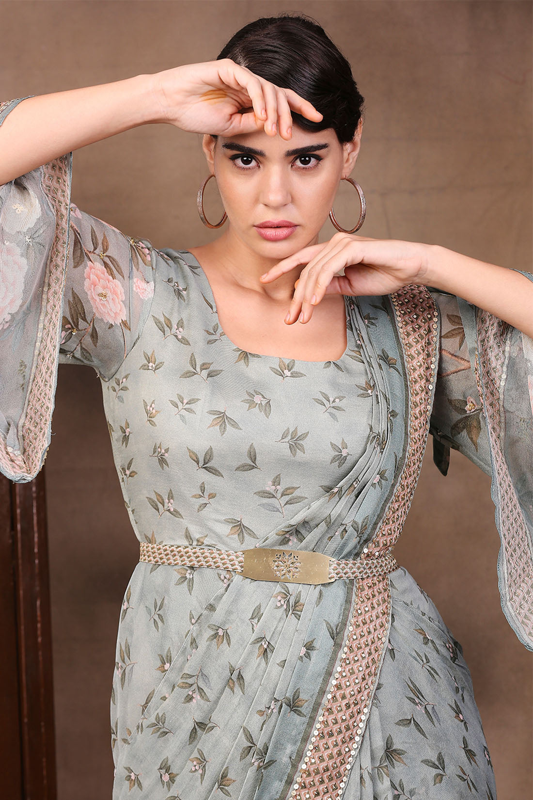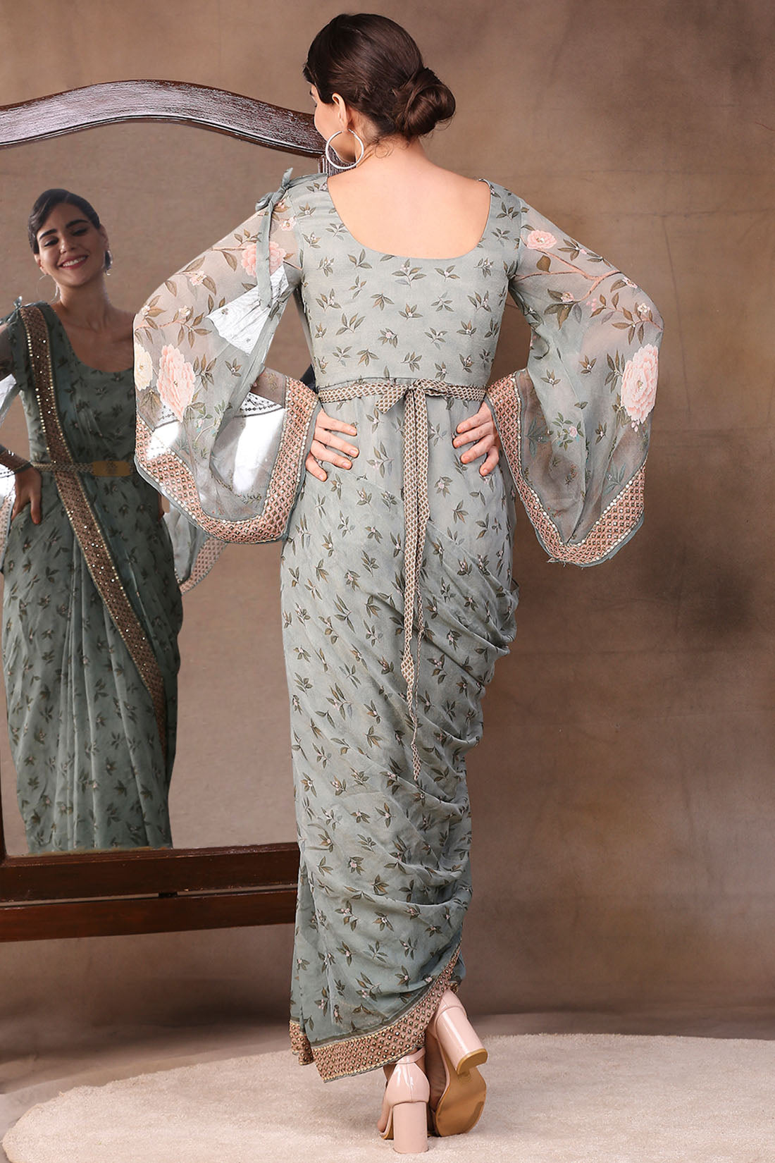 Green vintage trails printed pre-stitched saree dress with metal belt