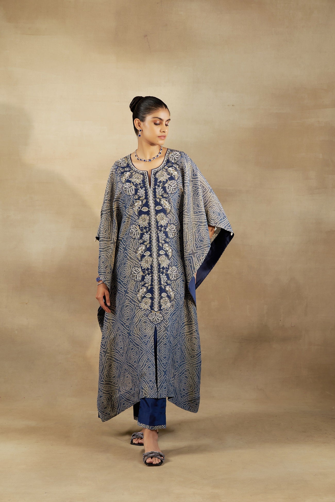 Featuring blue bandhani tissue kaftan which has delicate, gossamer like quality which adds a touch of opulence. Paired with silk pants.