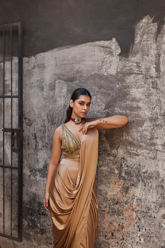 Featuring with Antique gold Colour Drapee Saree set with Embroided Blouse paired in 2 of set.