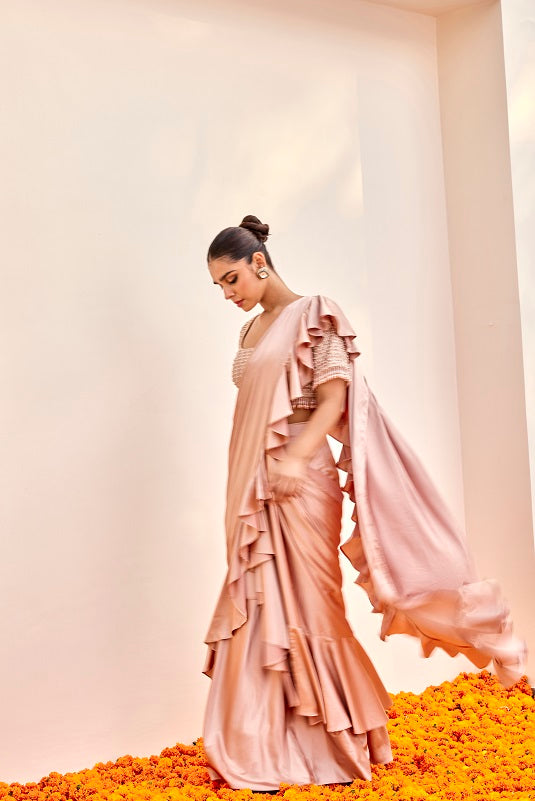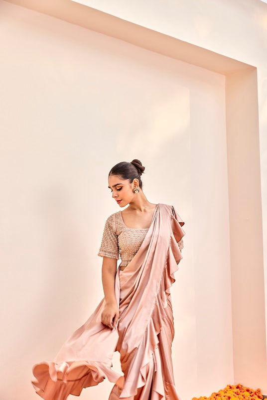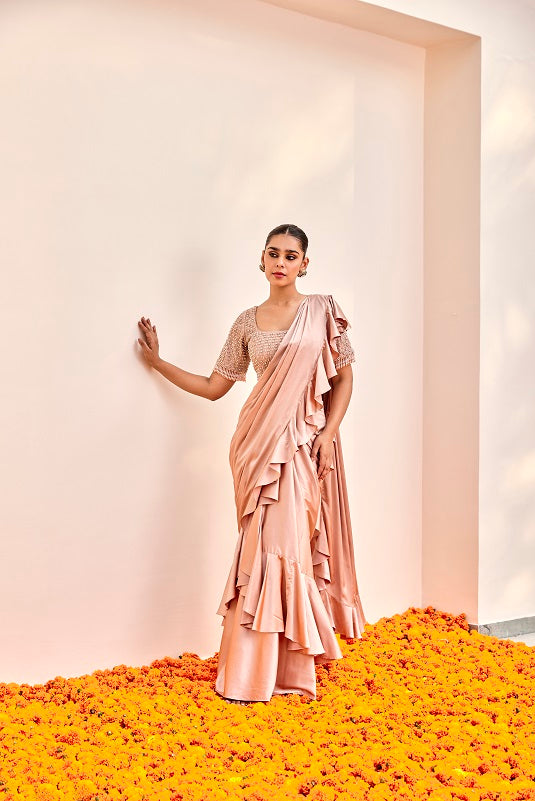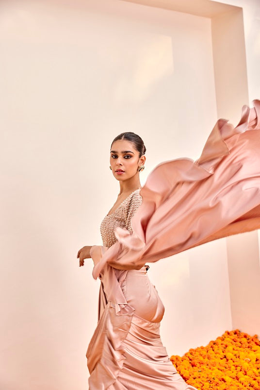 Featuring with Nude Pink Colour Drape Saree set it is paired with saree and Blouse.