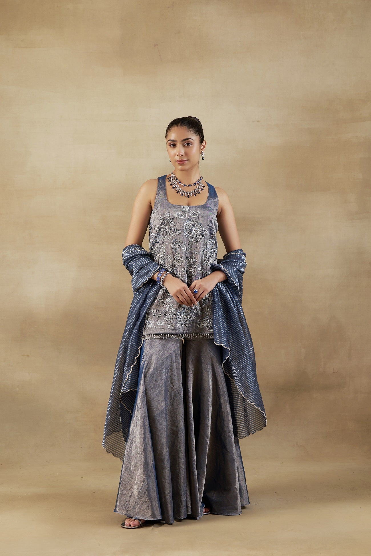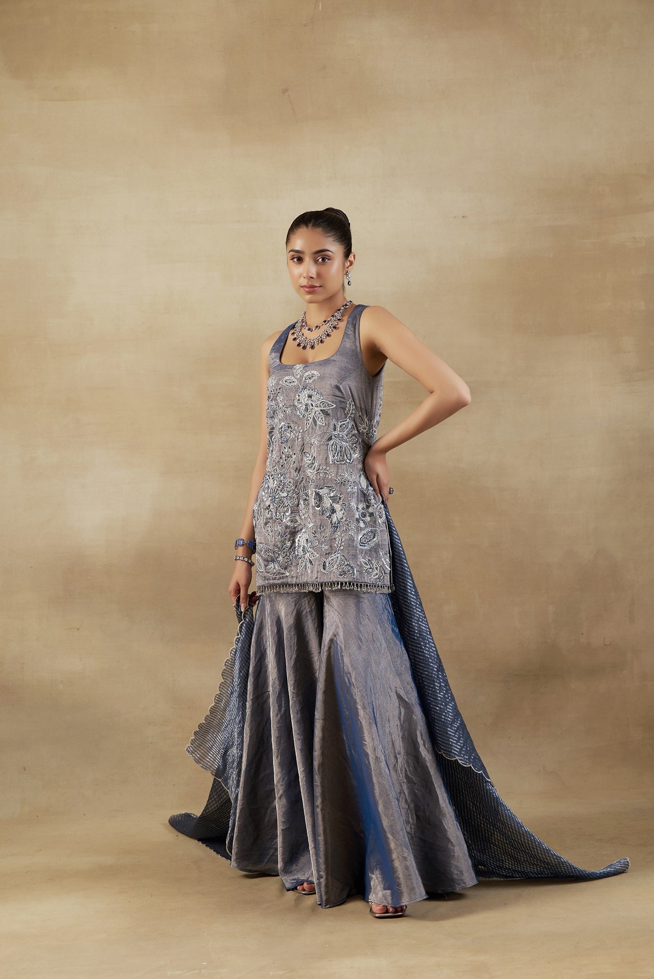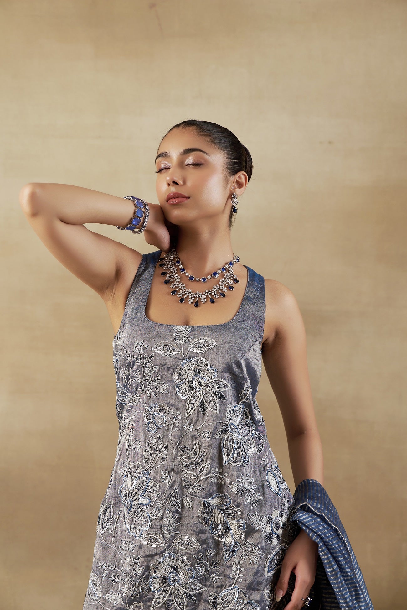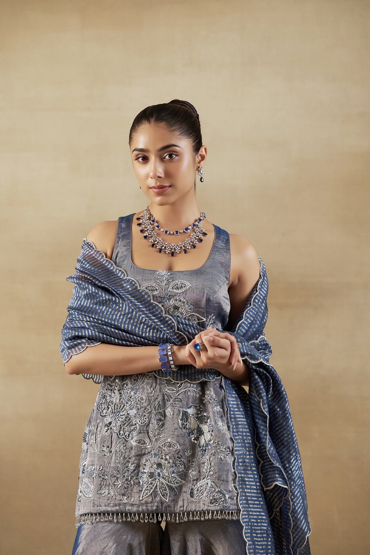 Crafted with love, featurng our blue embroidered shirt inspired by garden theme with cutdana, zardasi, pearl. Paired with tissue garara and banarasi dupatta
