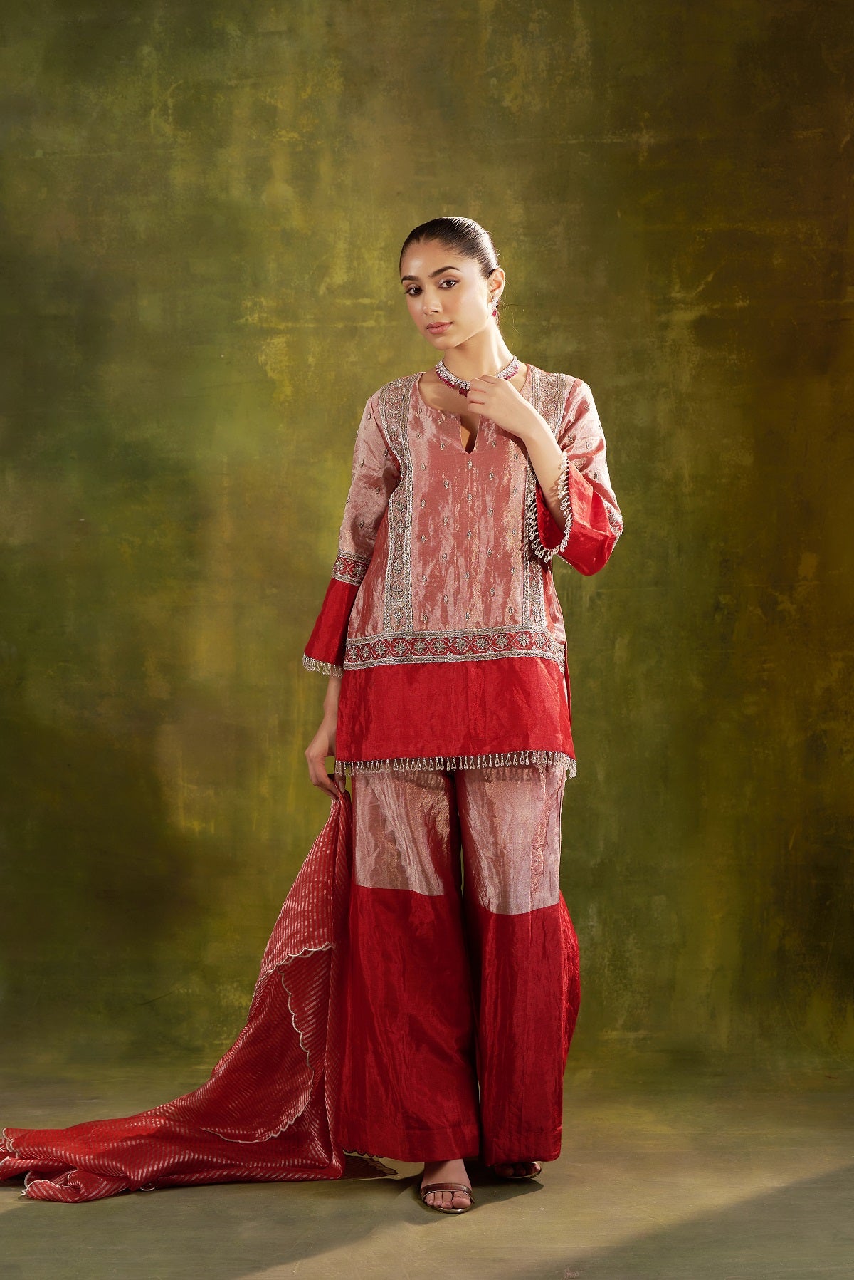 Featured our red embroidered short kurta inspired with garden theme embroidery. Paired with tissue pants and banarasi dupatta.