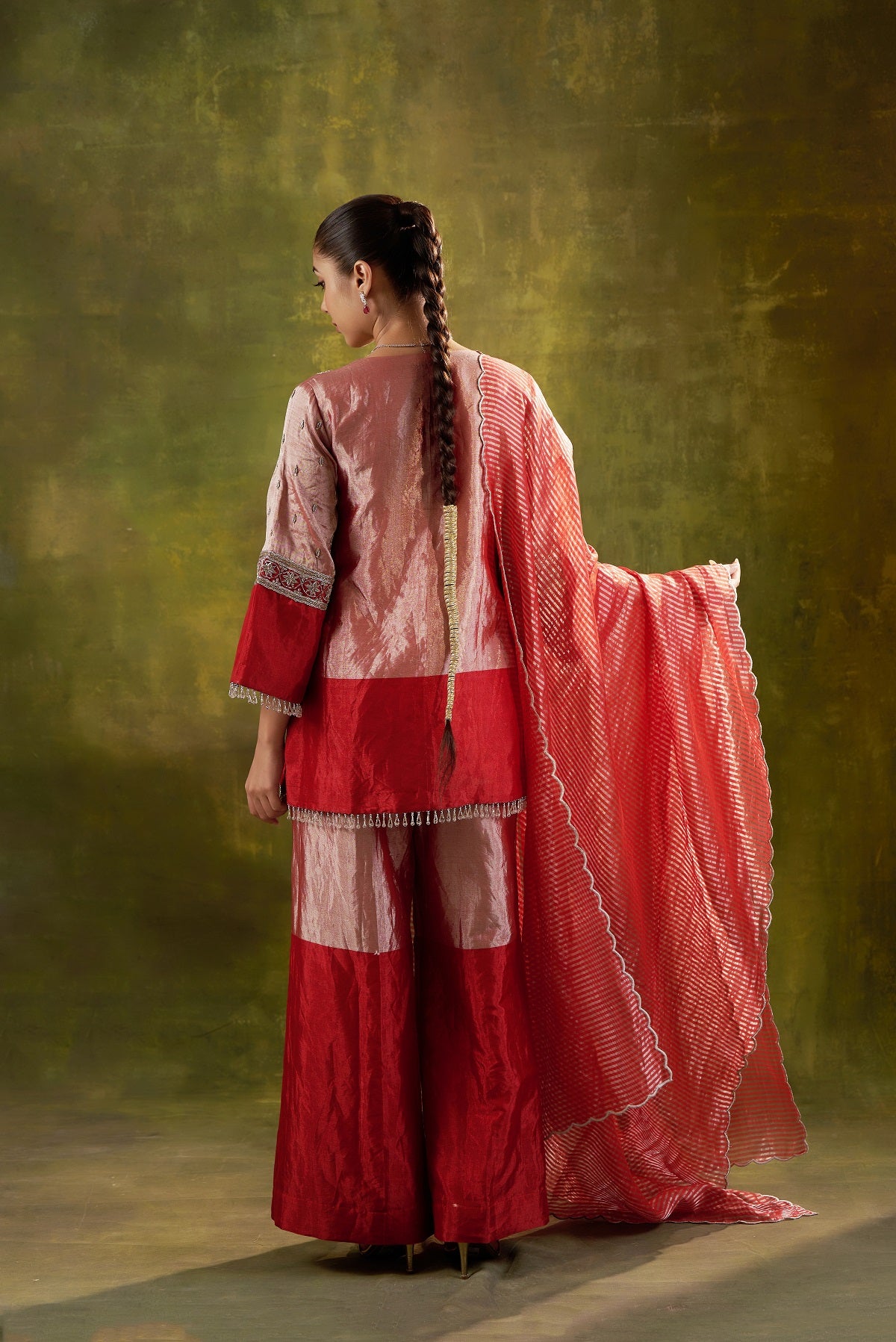 "short shirt and pallazo pants in tissue with striped banarsi dupatta"