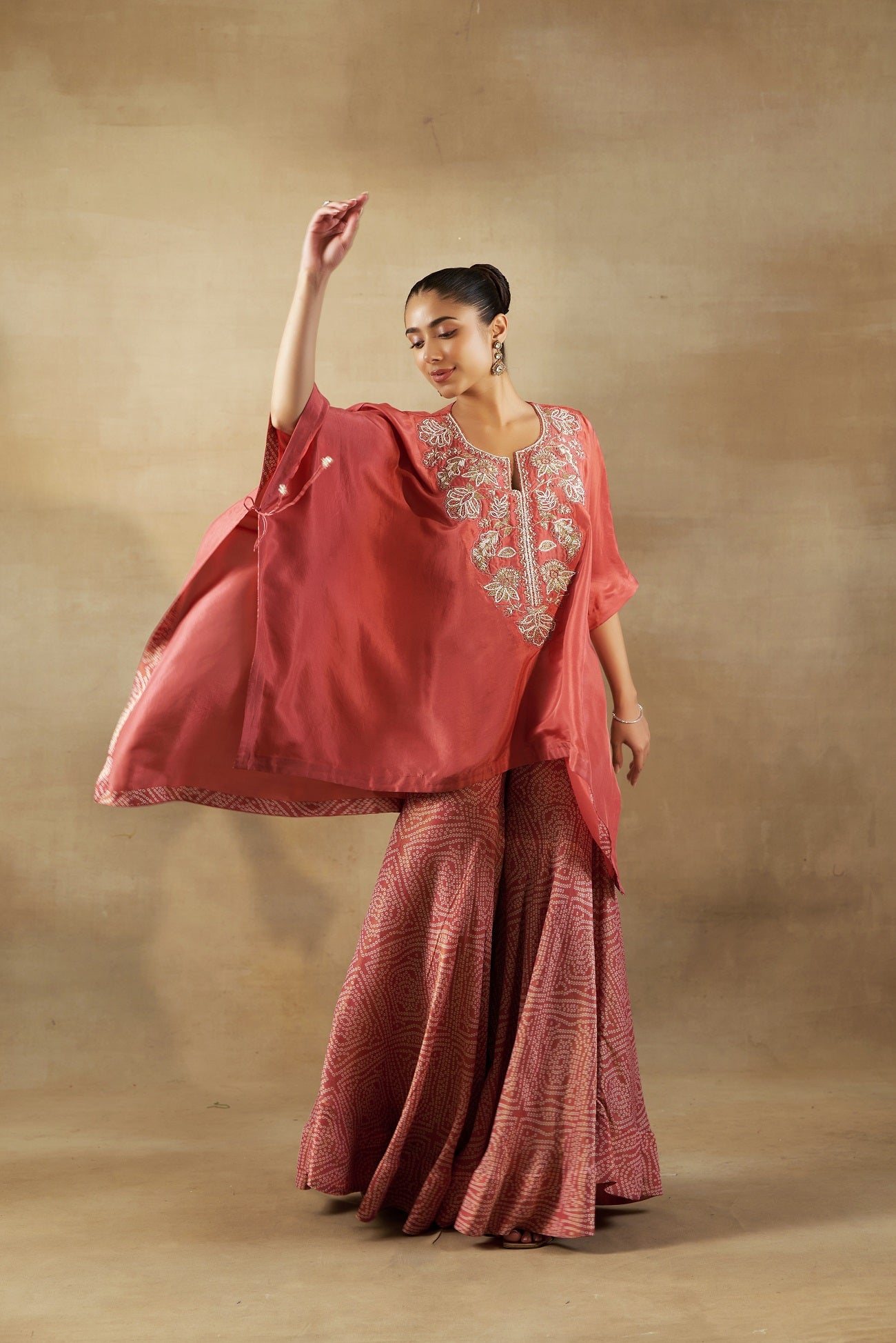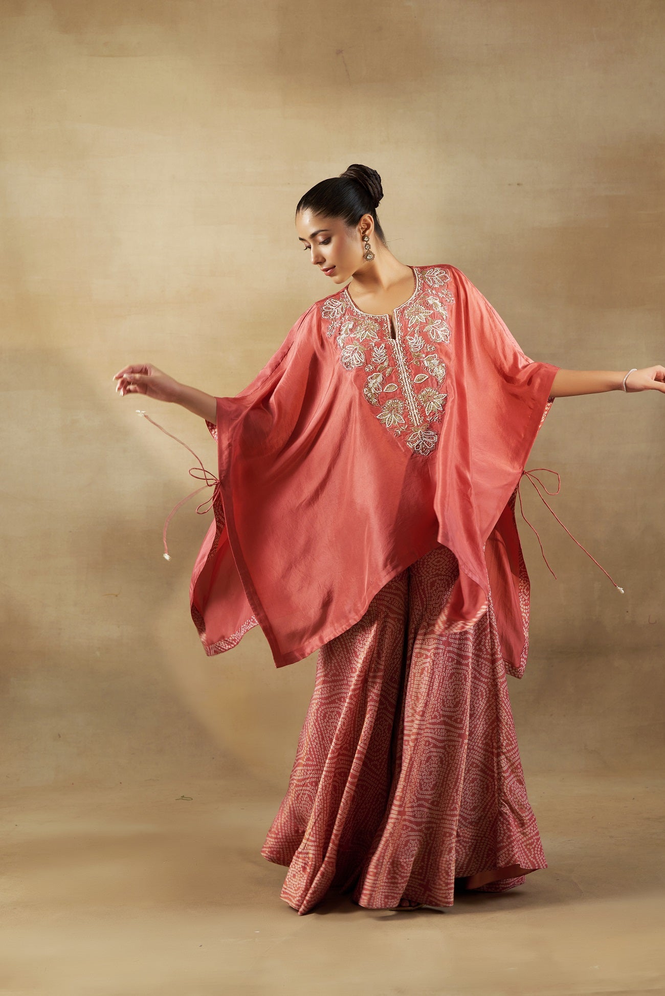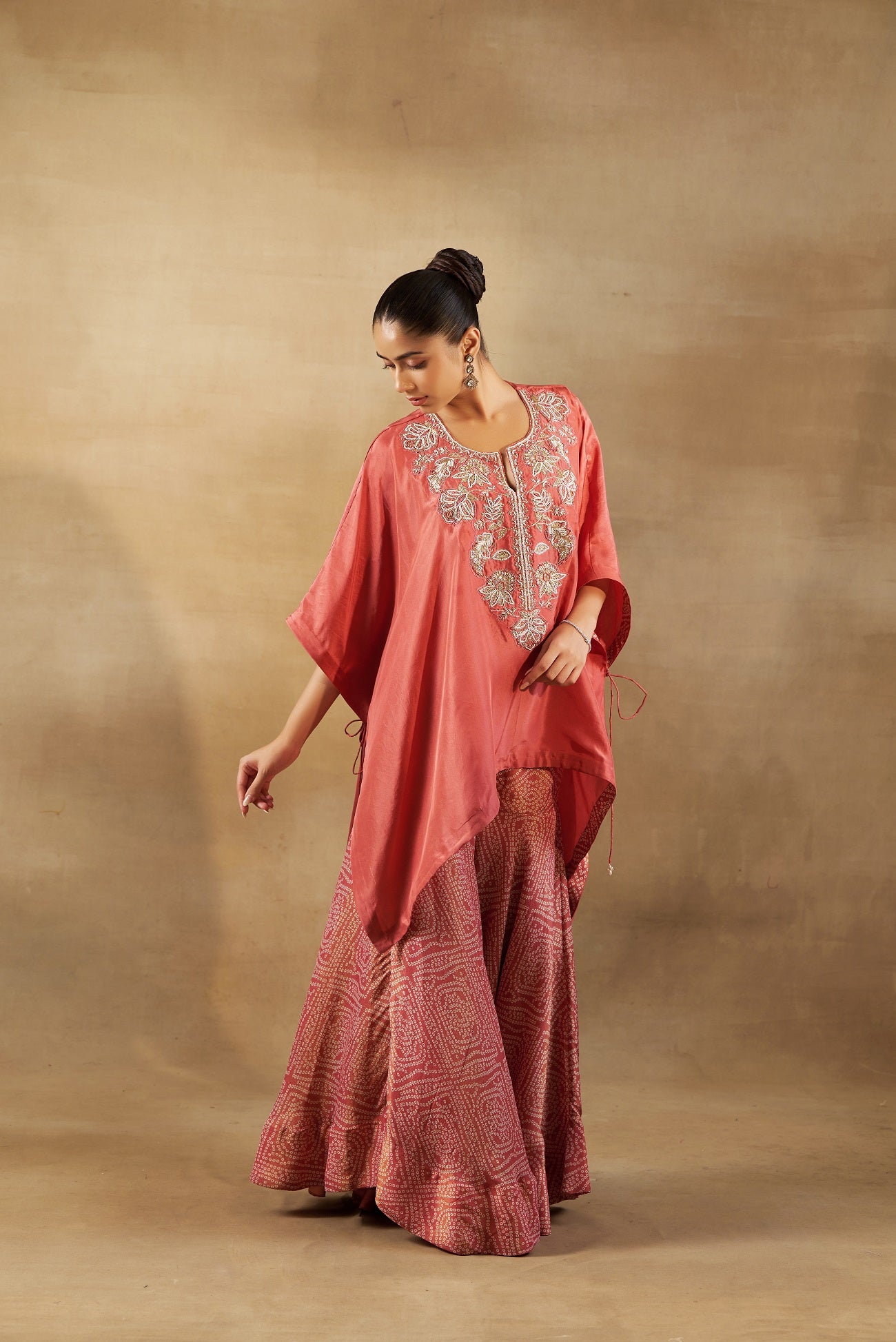 Crafted with elegance, featured here our peach habutai silk short kaftan paired wih bandhani tissue garara.