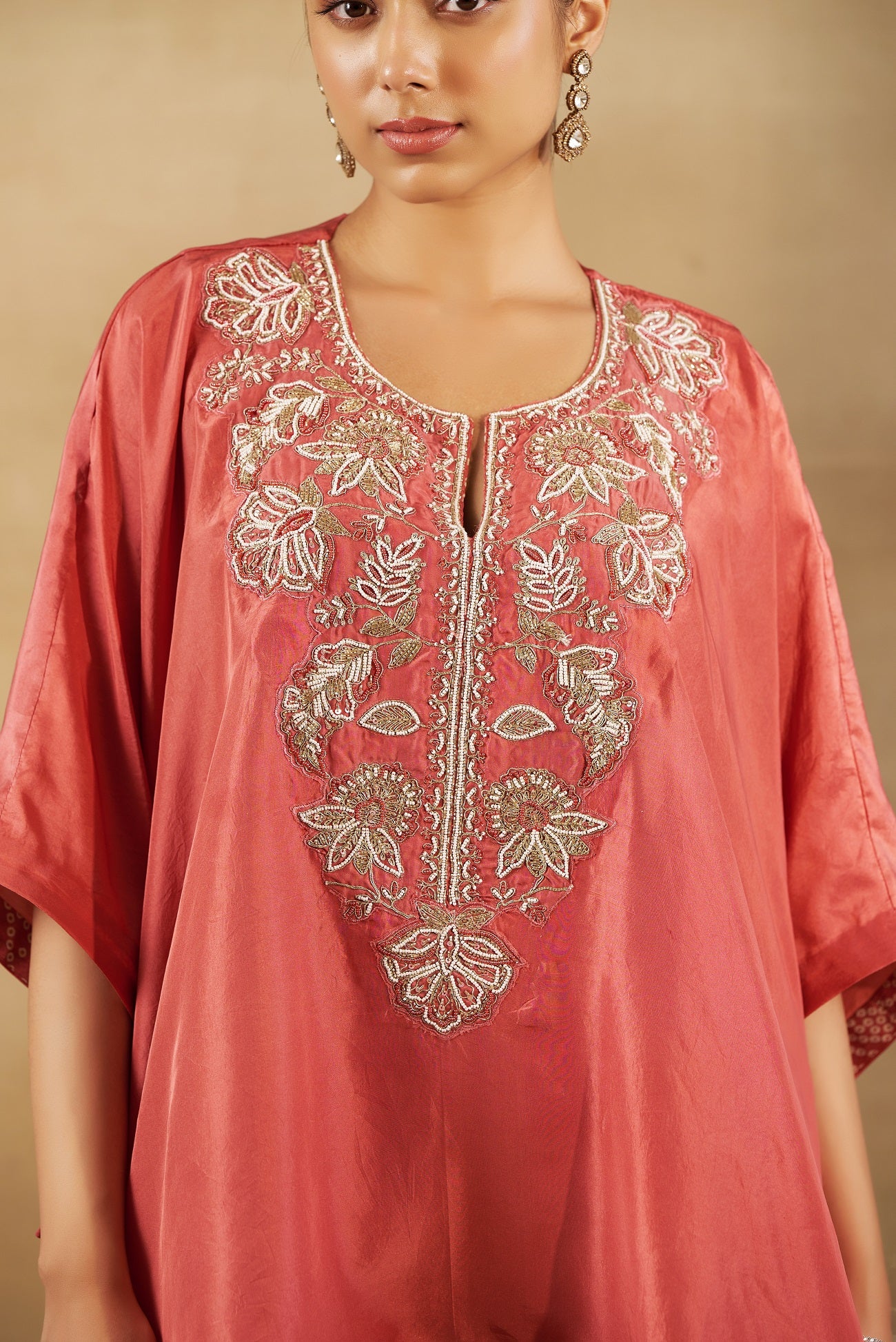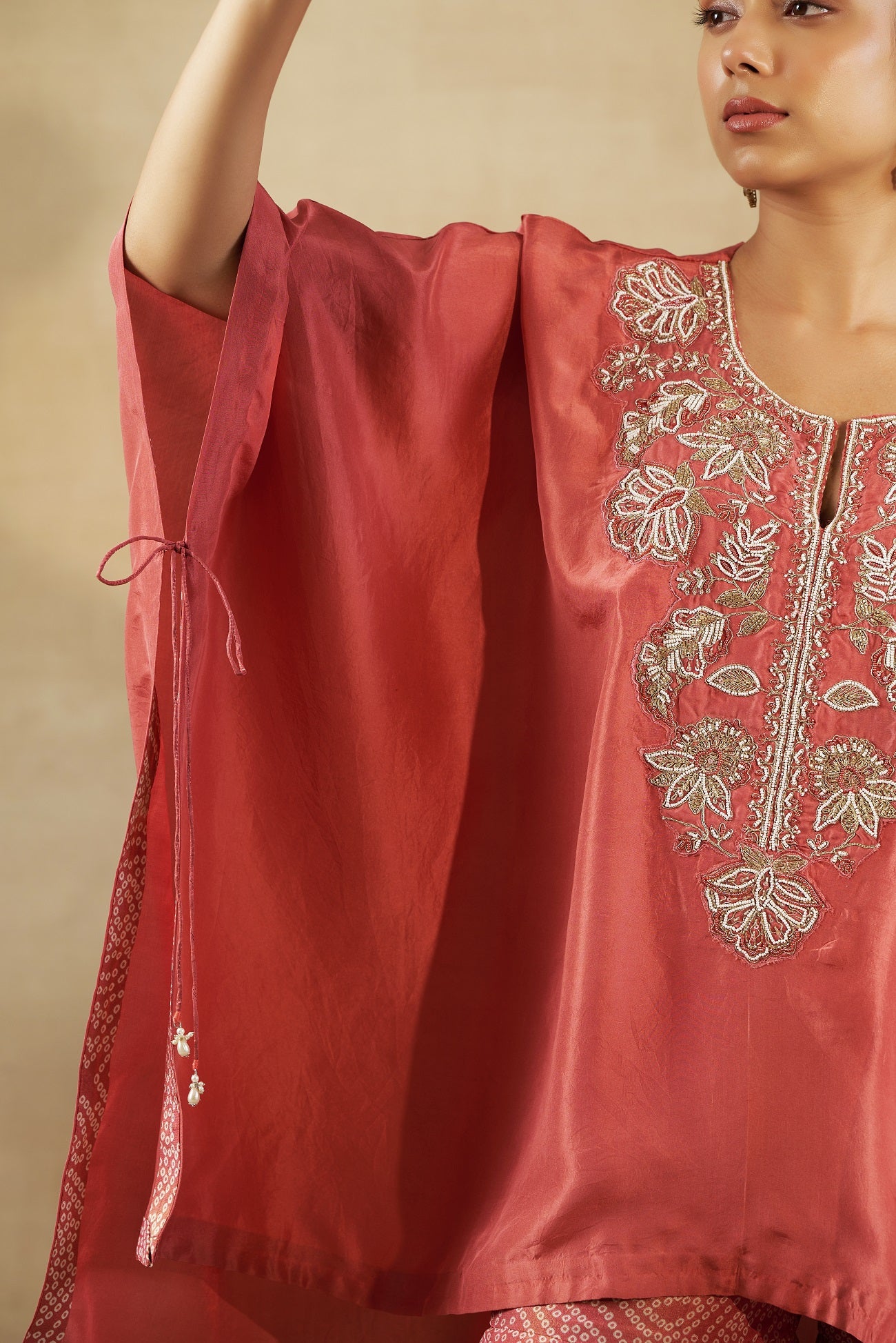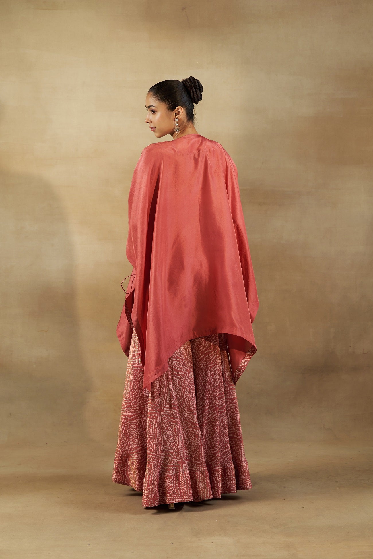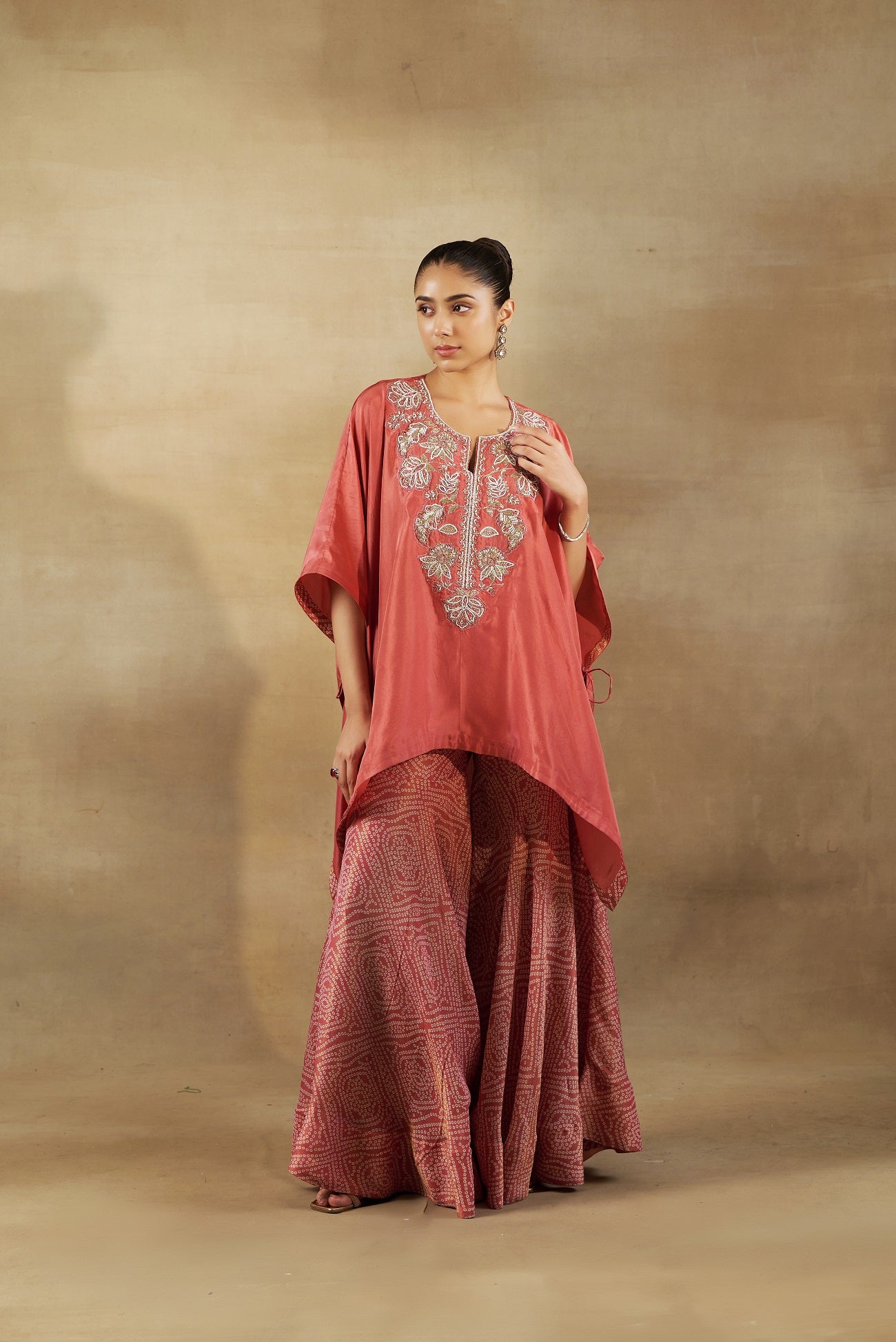 Crafted with elegance, featured here our peach habutai silk short kaftan paired wih bandhani tissue garara.