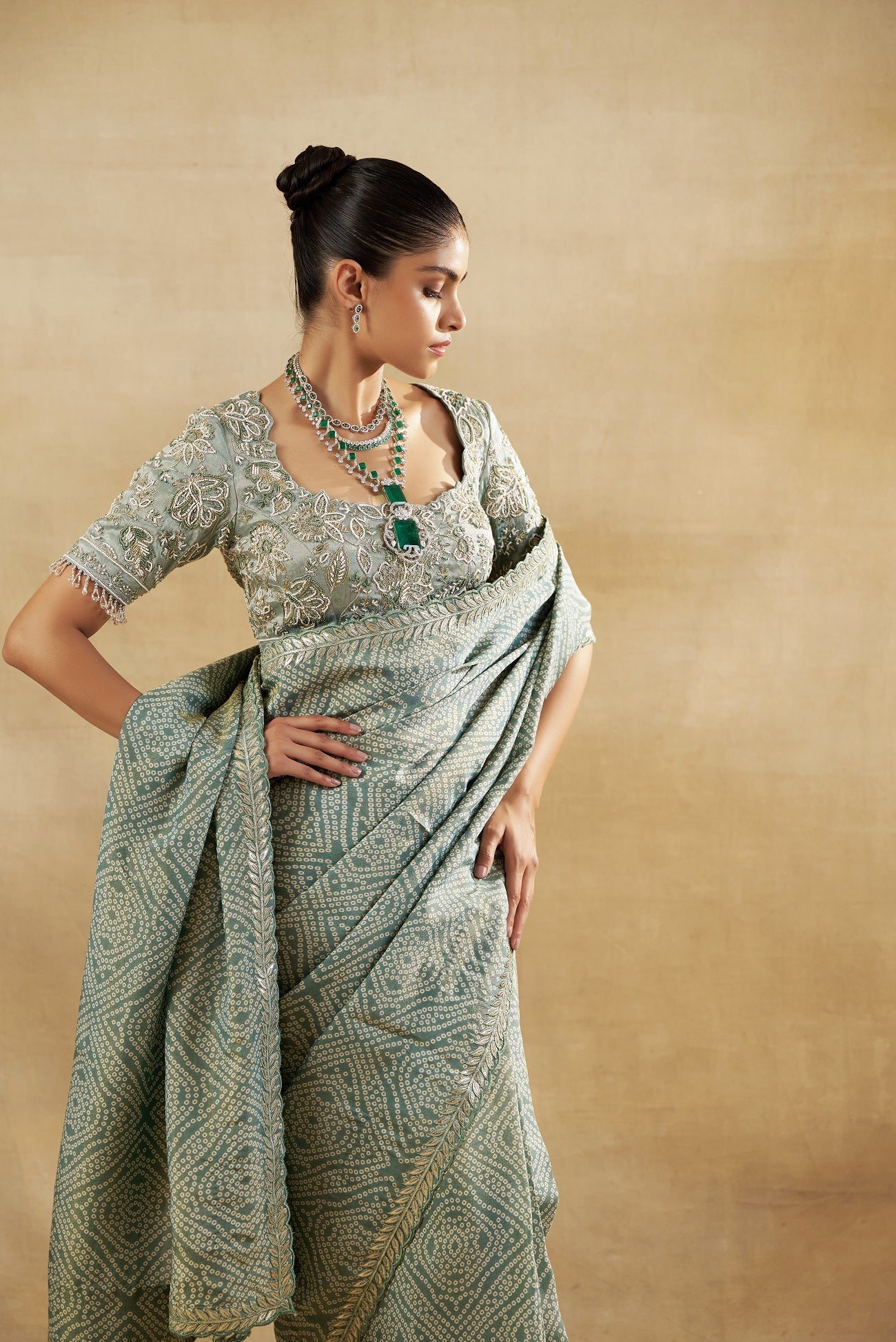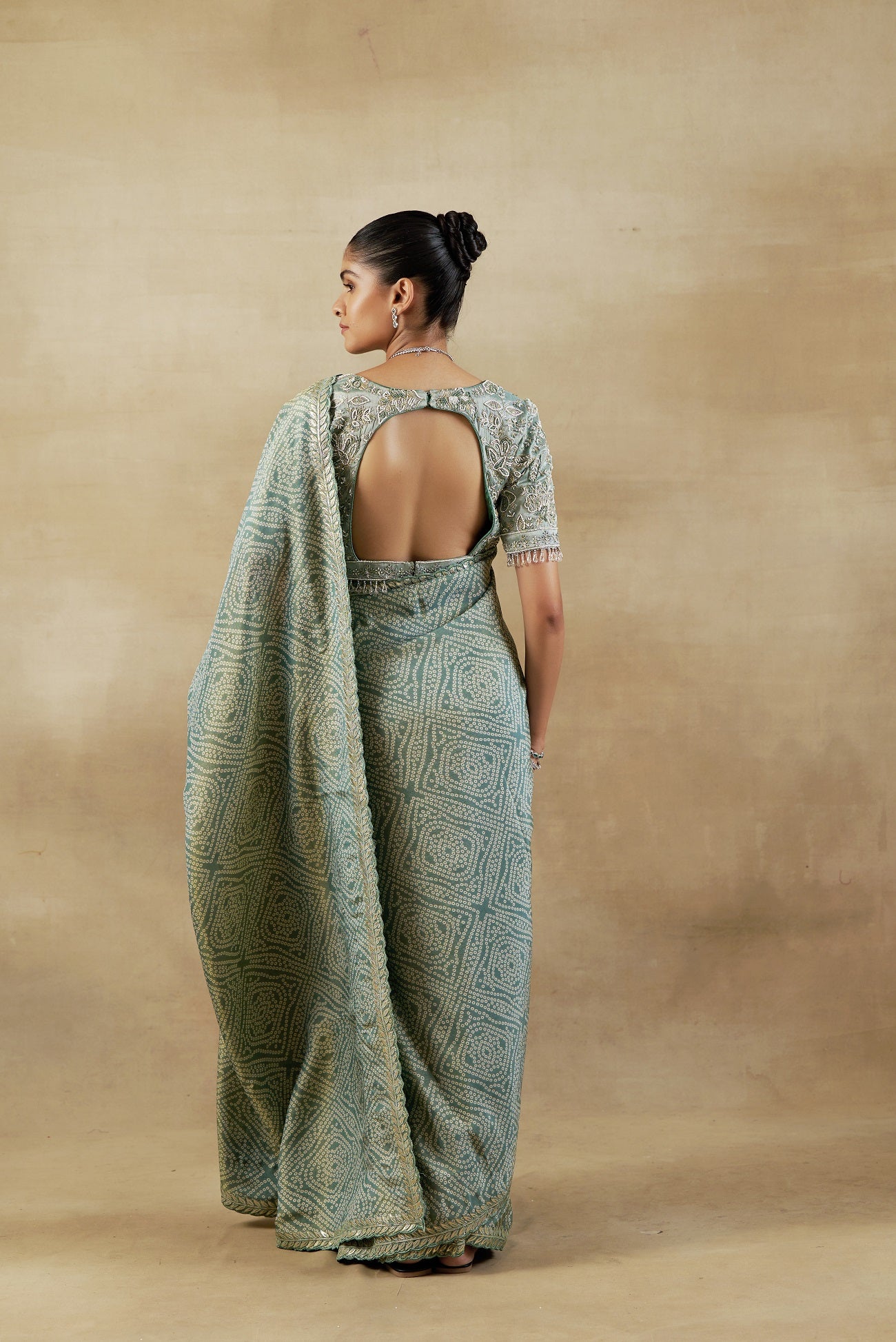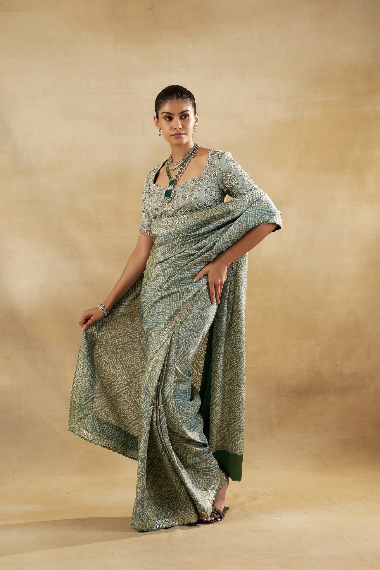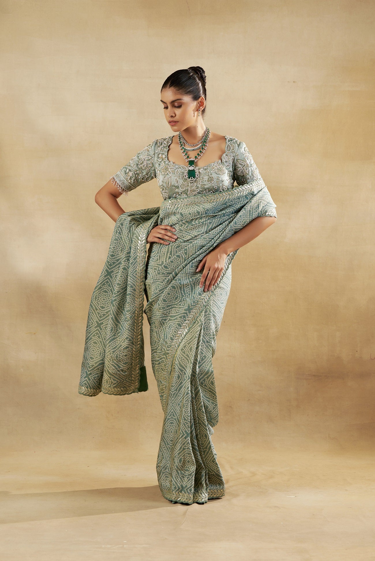 Featuring our elegant green bandhani tissue saree paired with embroidered blouse
