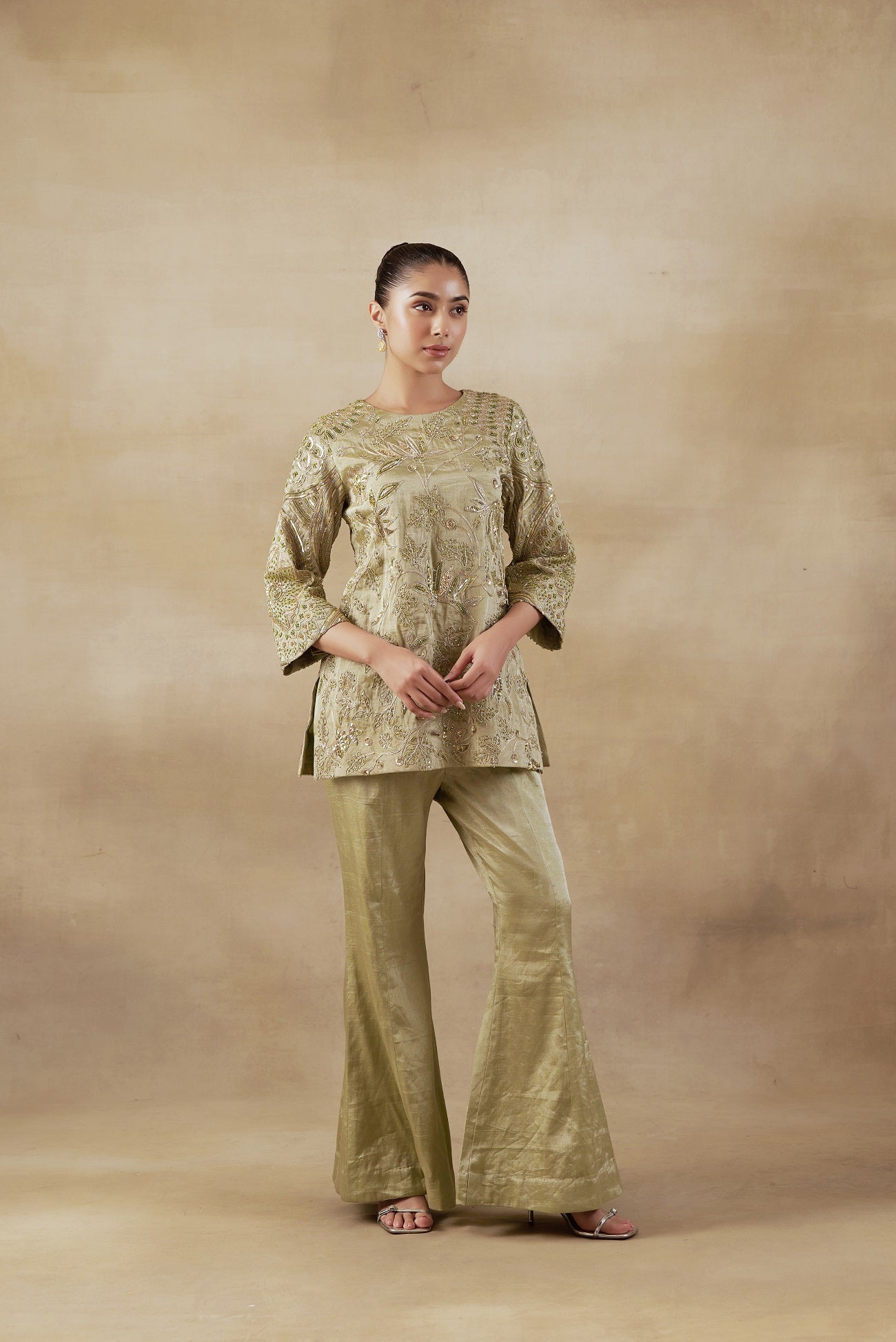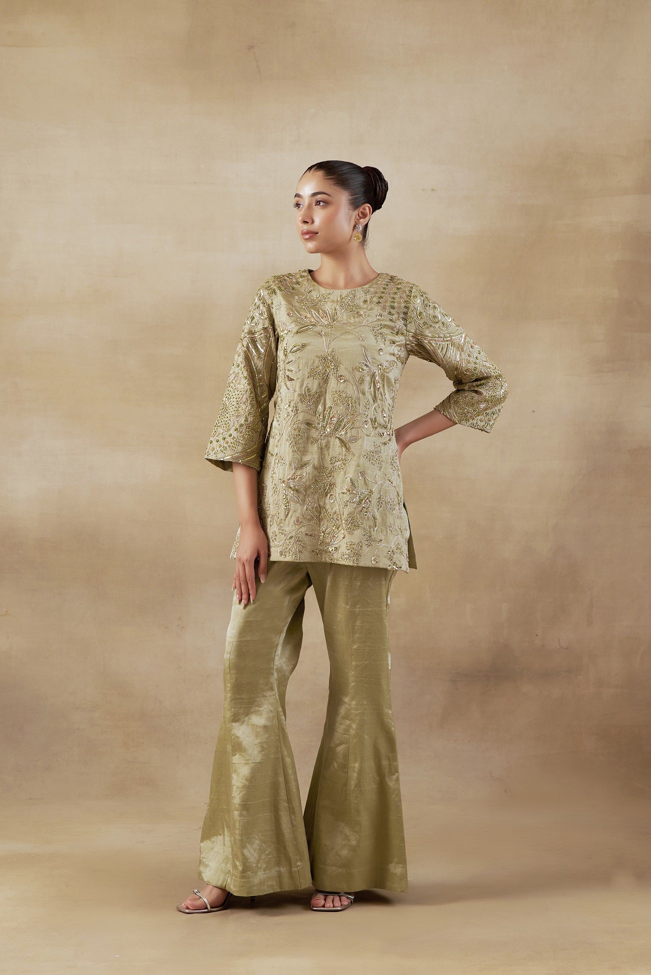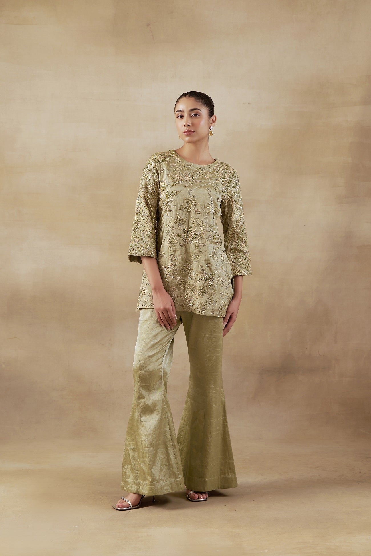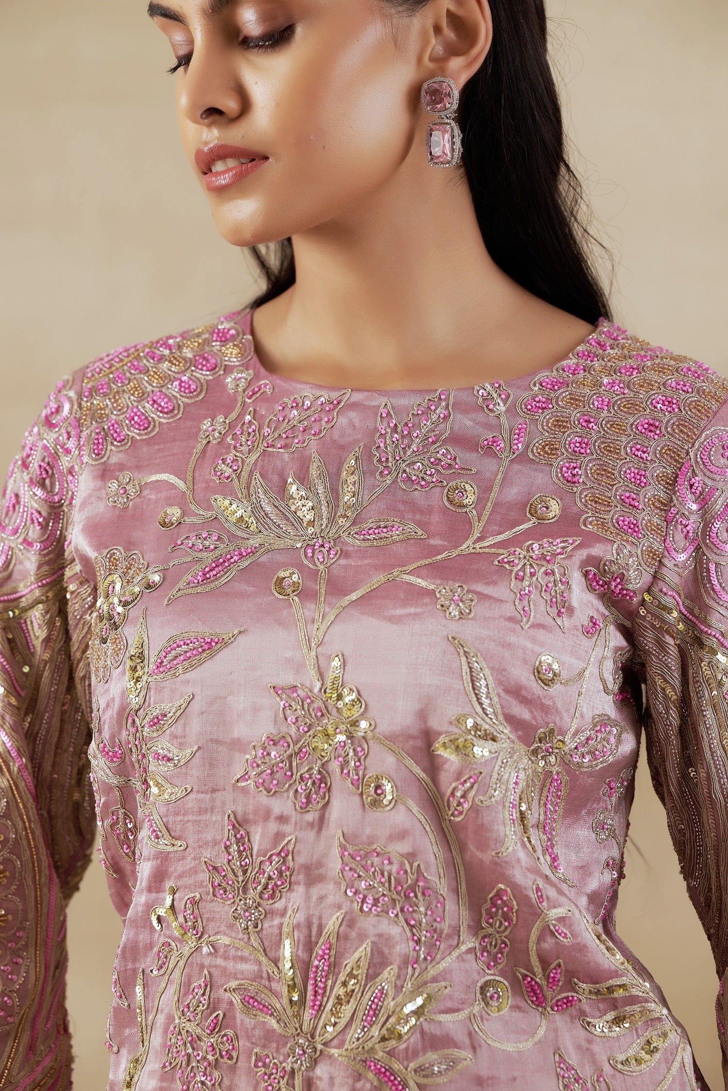 "short shirt in tissue with bandhani tissue garara and striped chanderi banarasi dupatta"