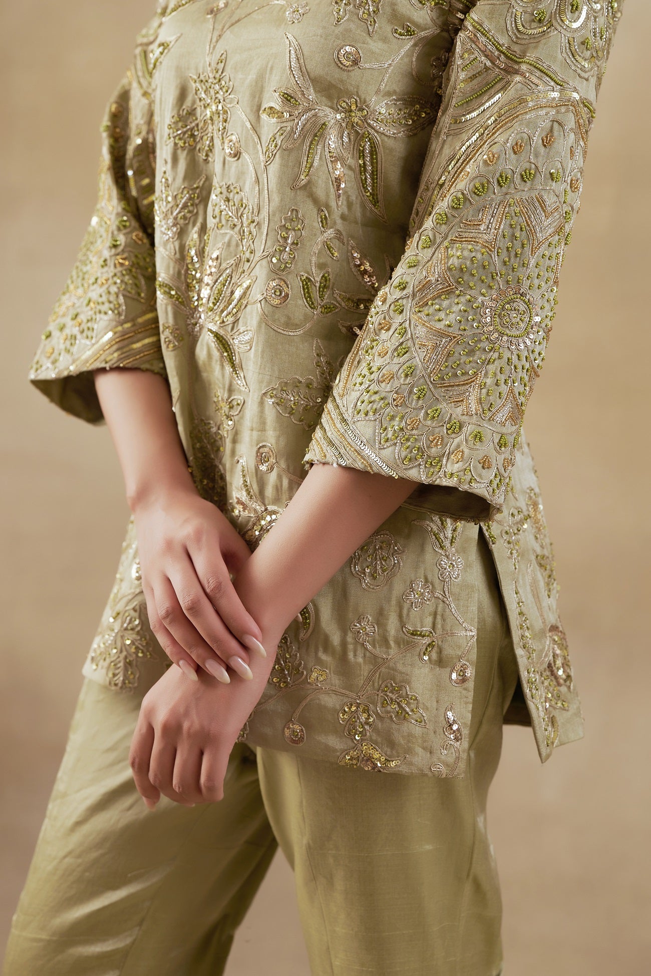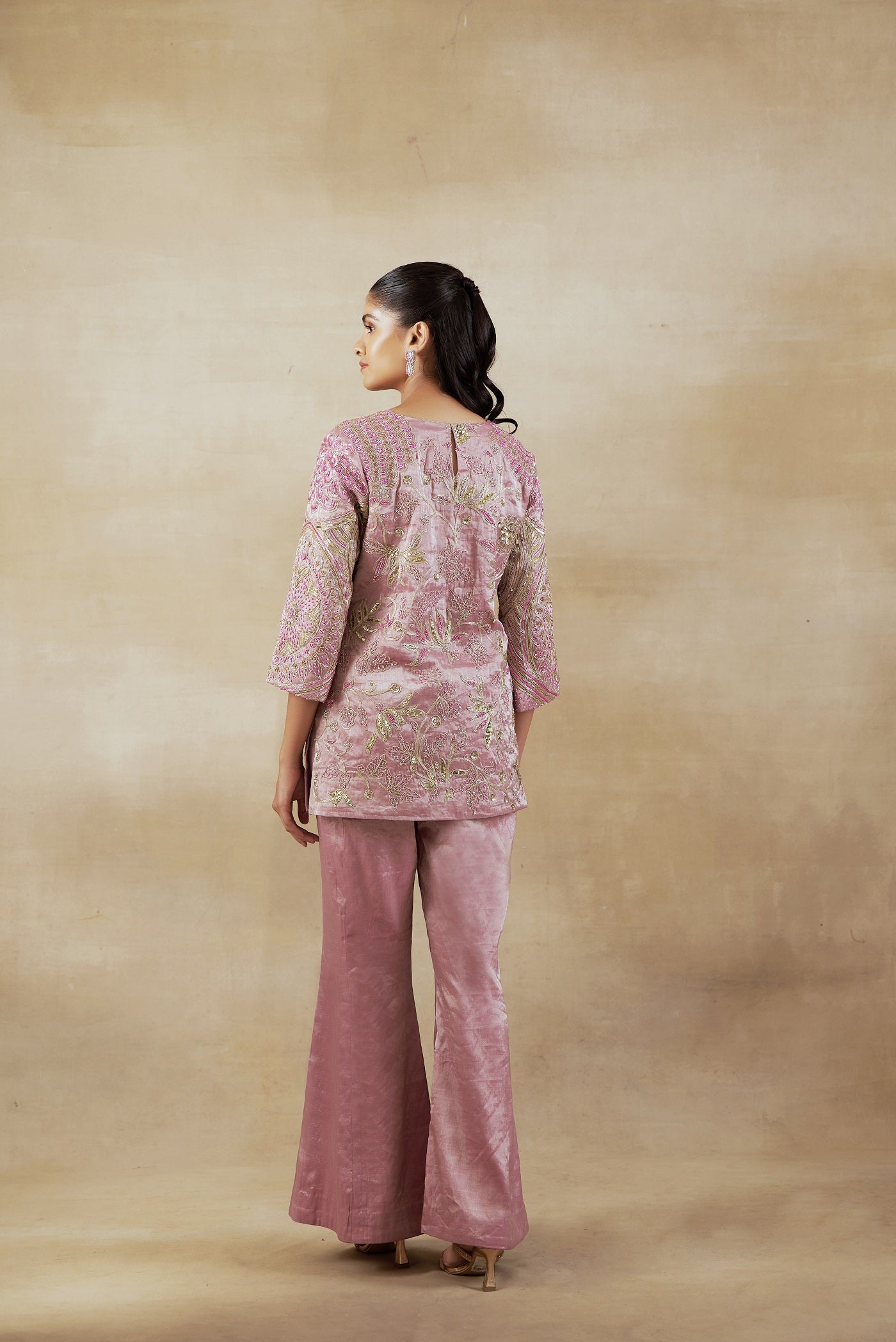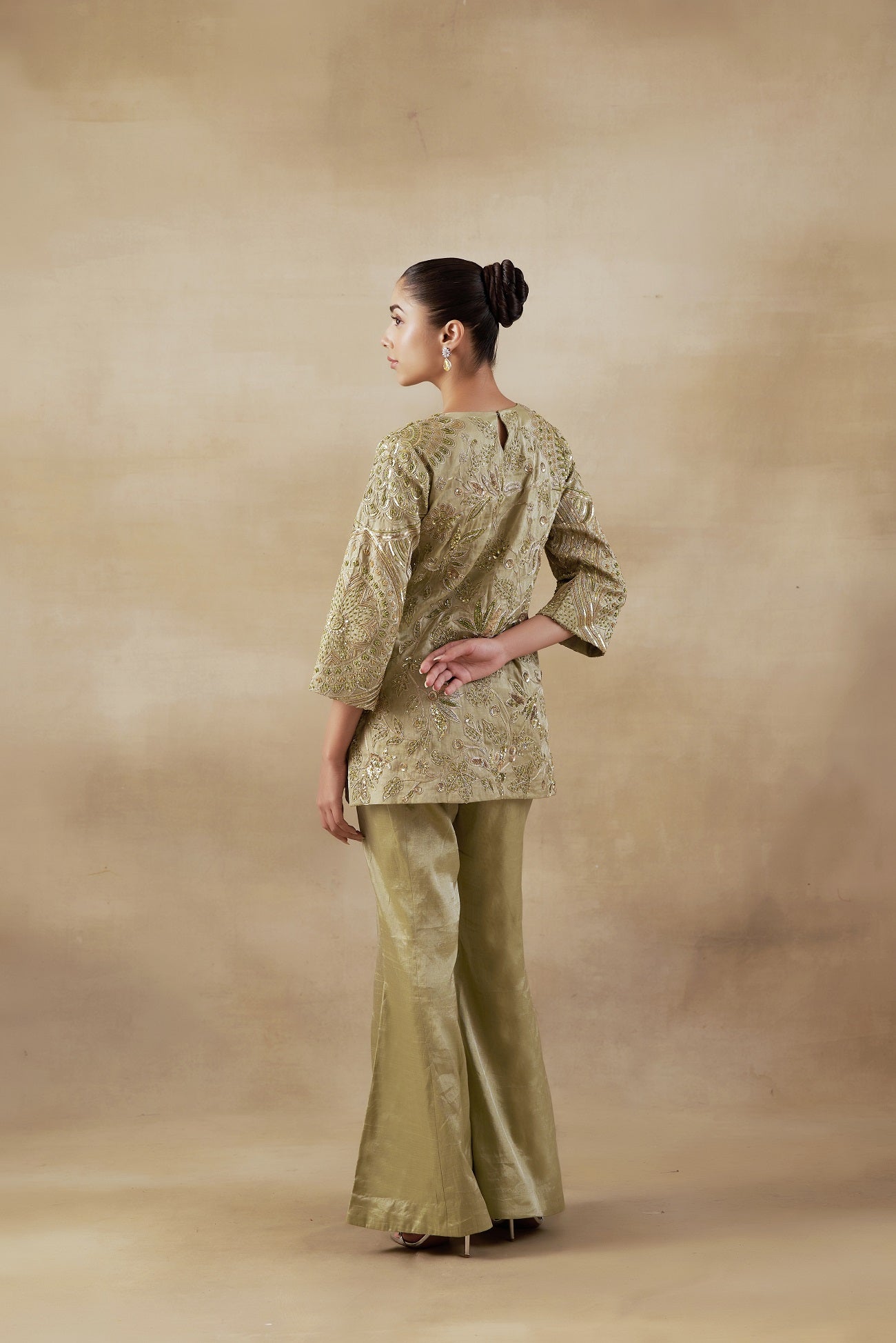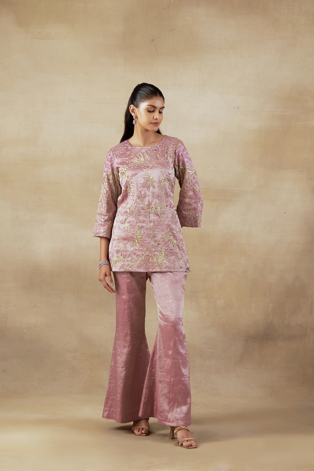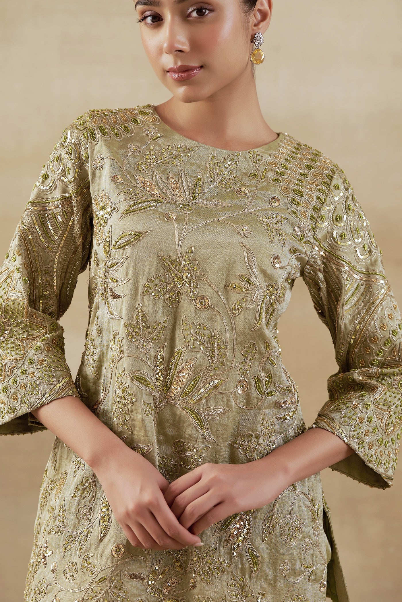 "short shirt in tissue with bandhani tissue garara and striped chanderi banarasi dupatta"