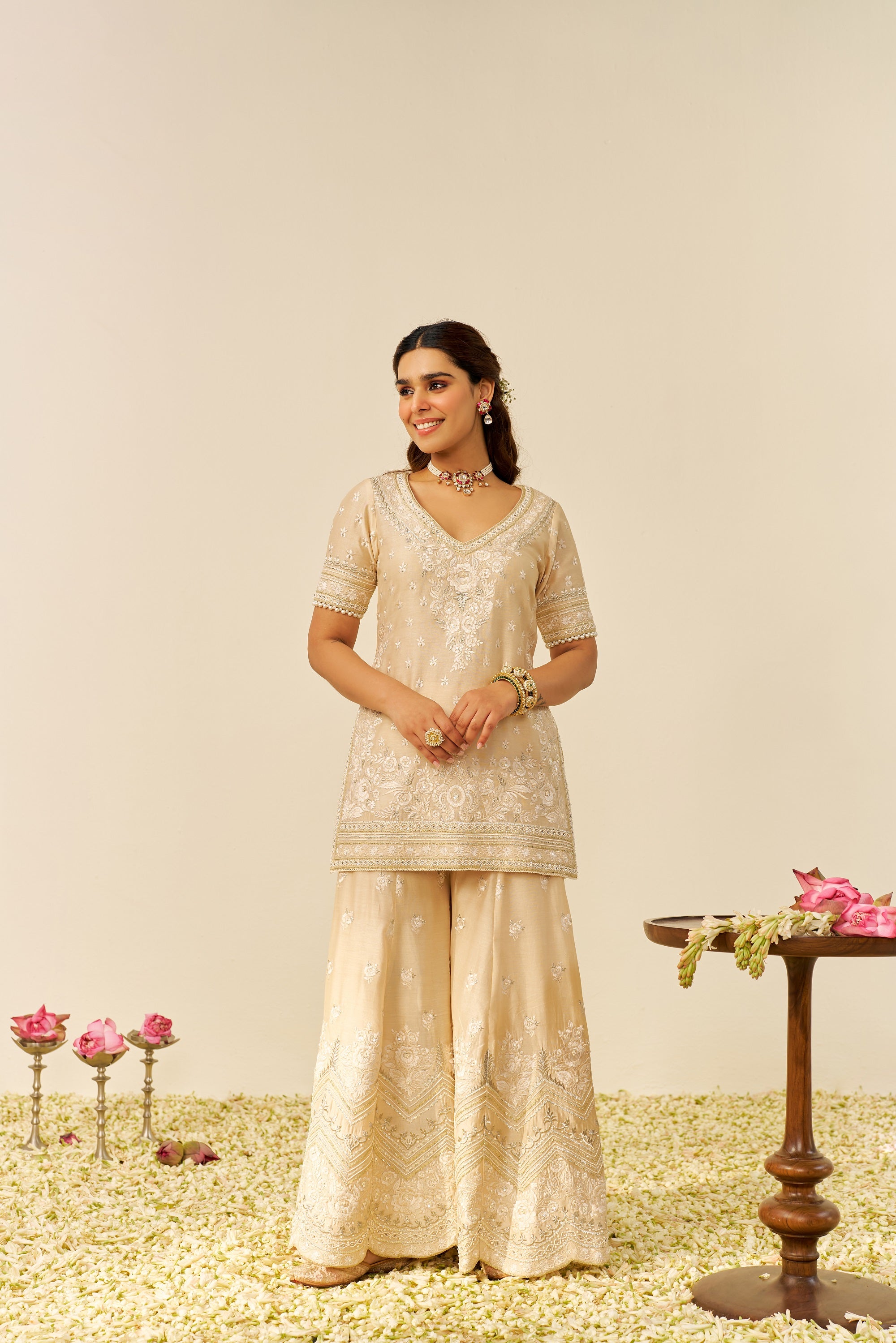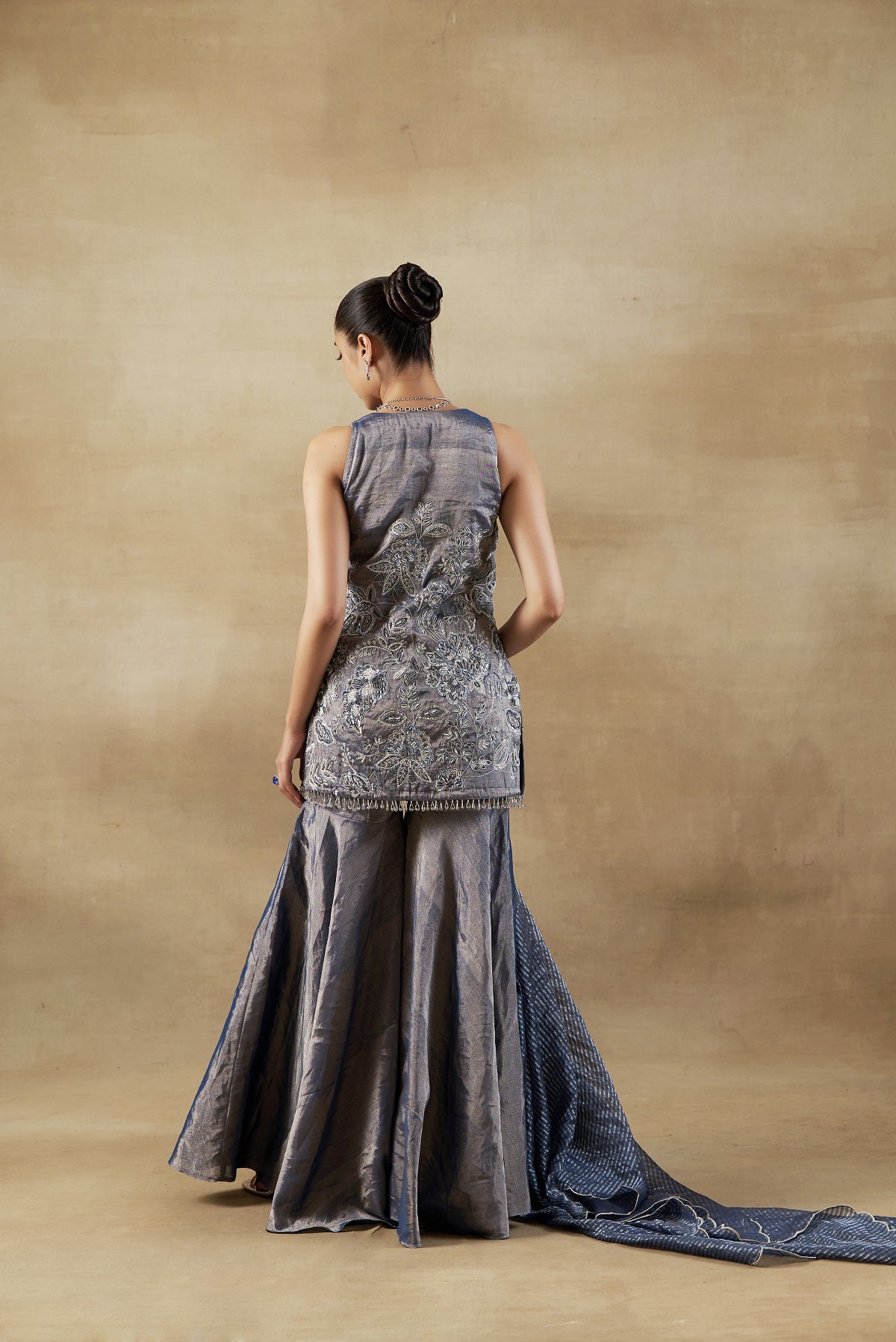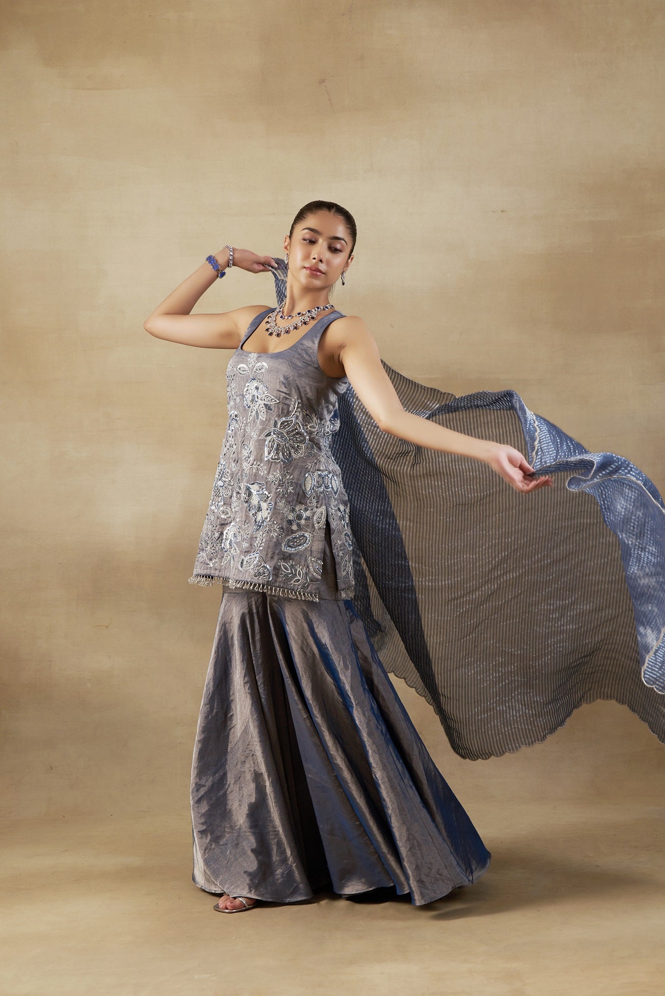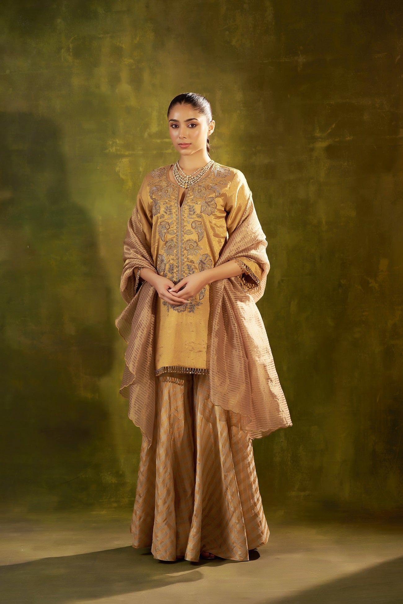 Short shirt and garara in tissue with garden theme embroidery and a striped banarsi dupatta
