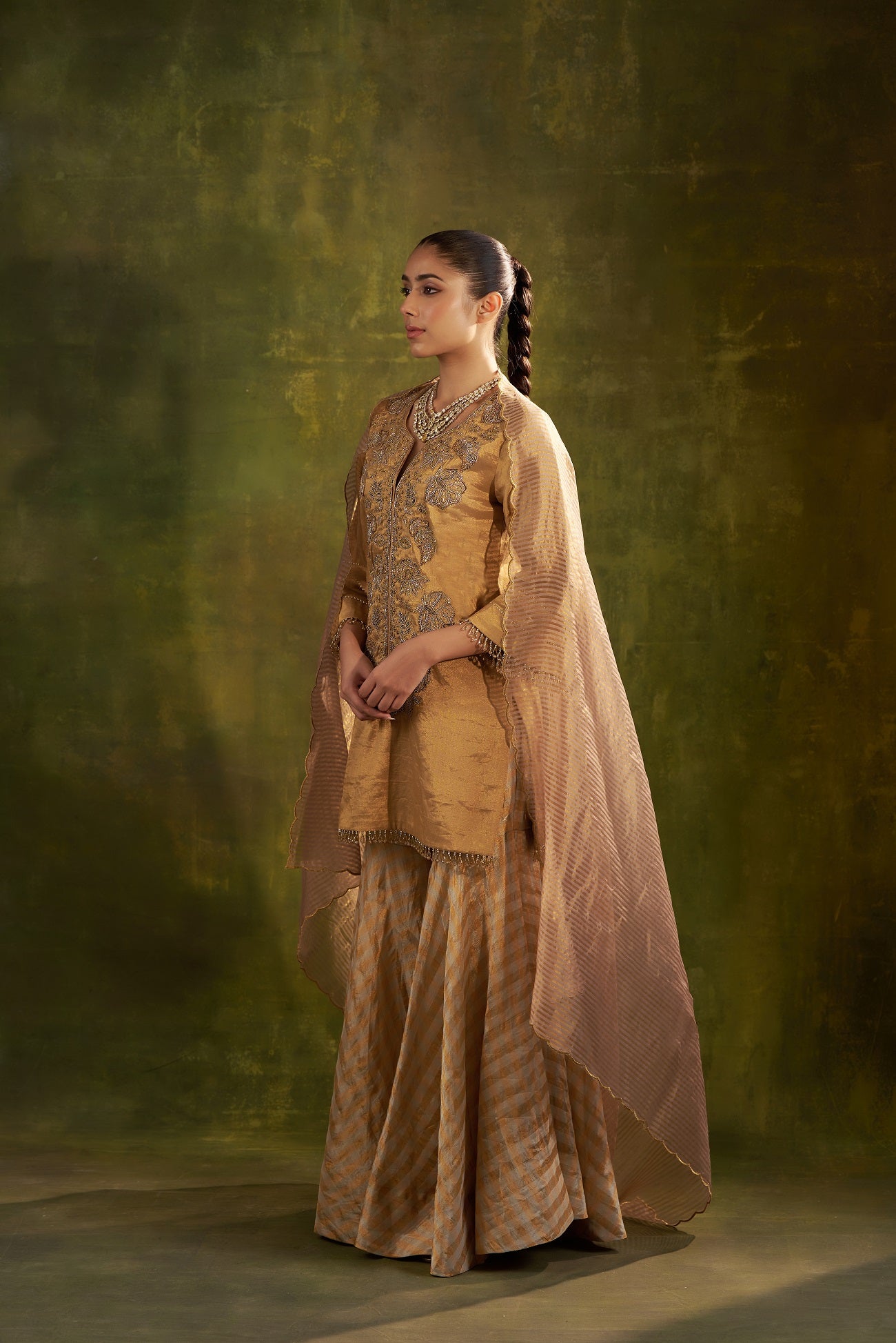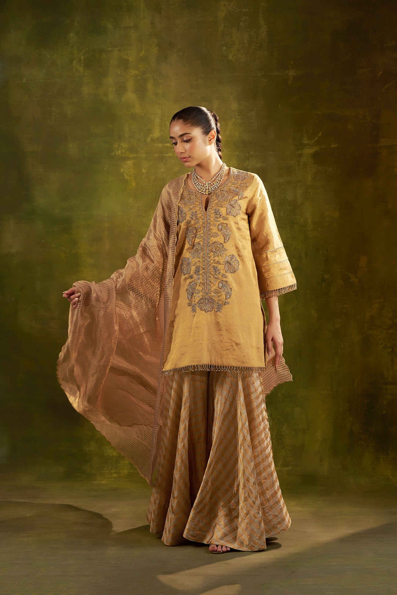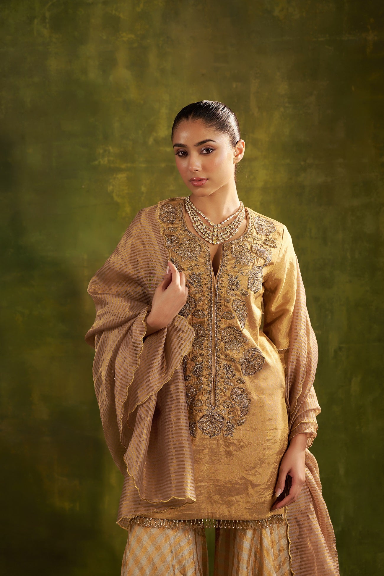"short shirt and check garara in tissue with garden theme embroidery and a striped banarsi dupatta "