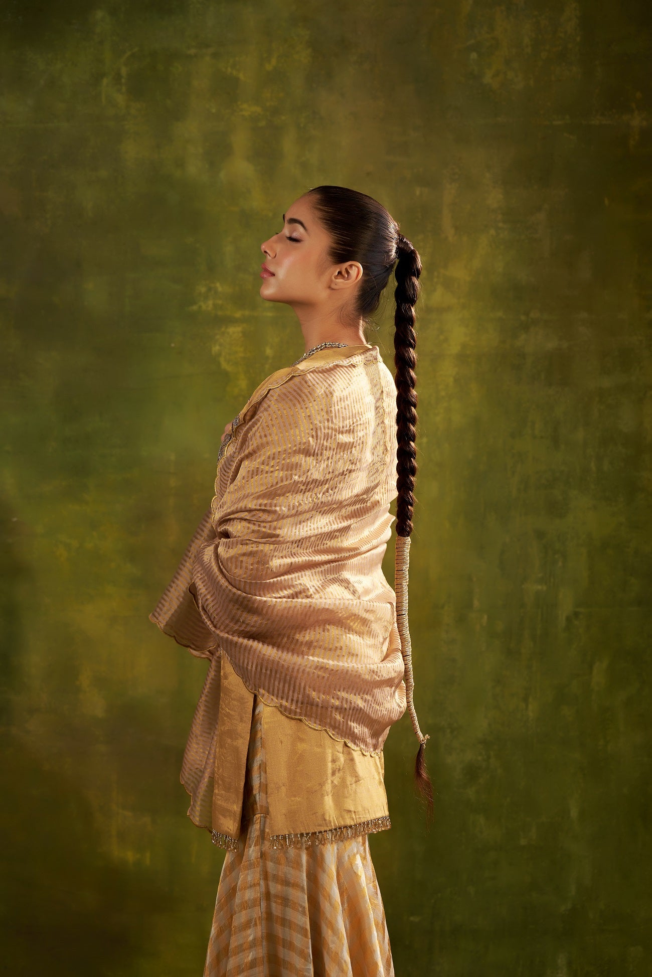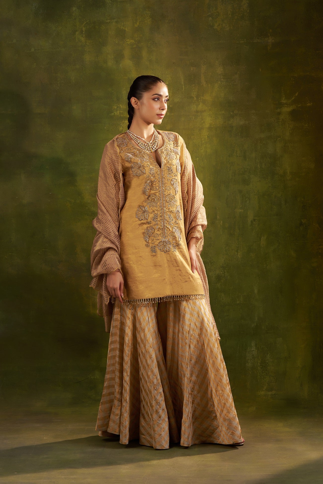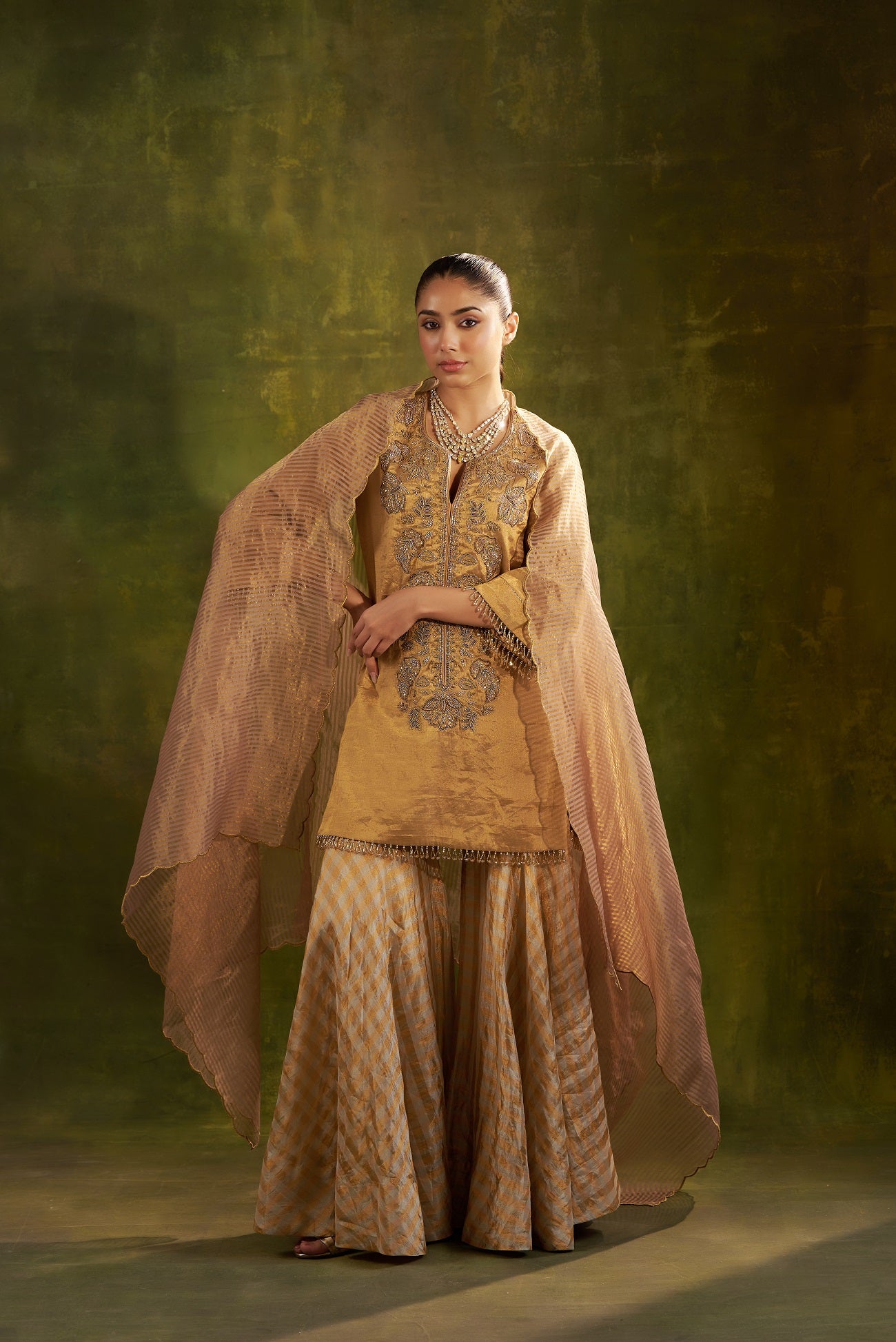 "short shirt and check garara in tissue with garden theme embroidery and a striped banarsi dupatta "