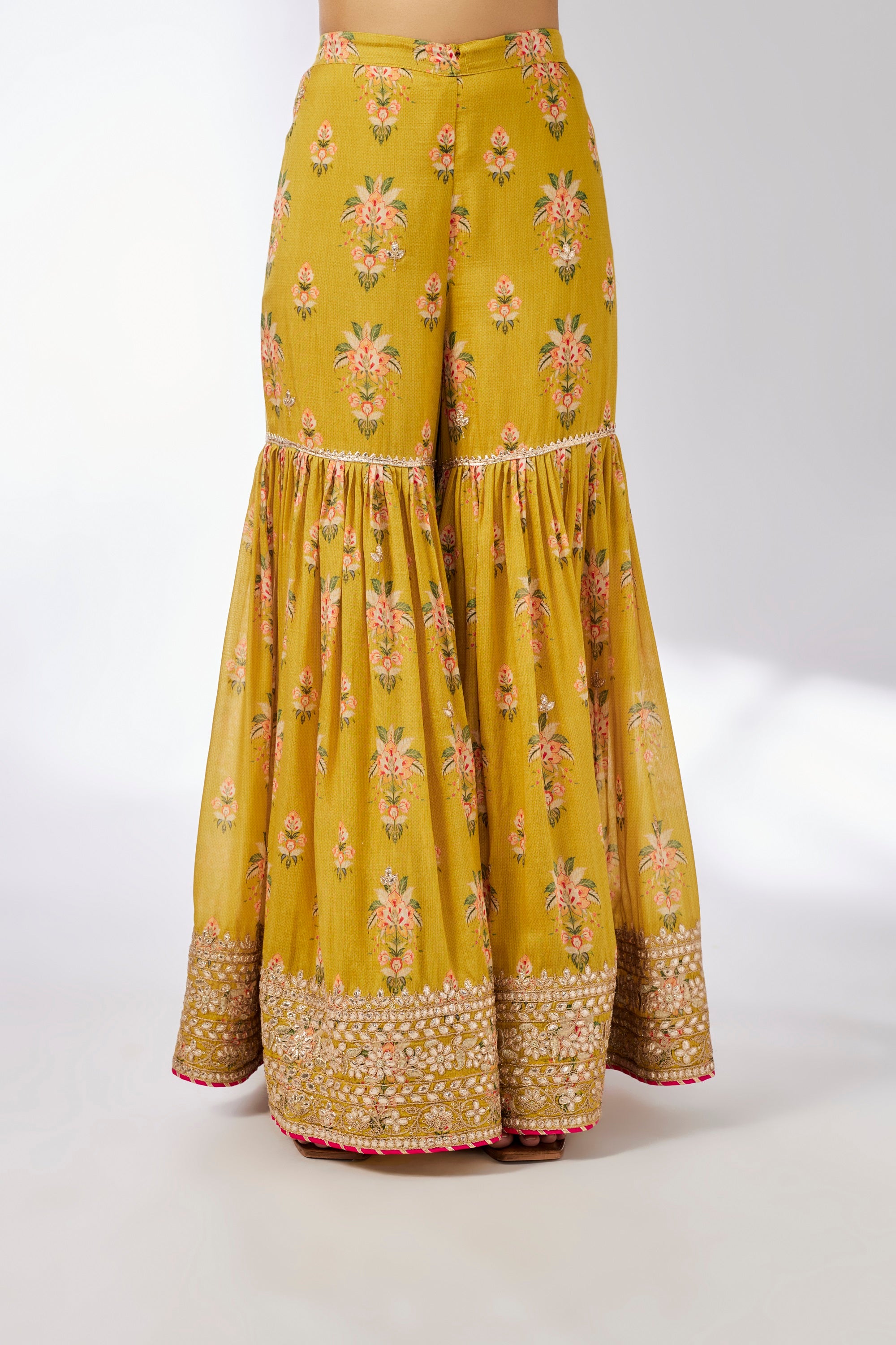 A short length floral printed strappy kurta is paired with same printed sharara and Badla dupatta giving it a fresh and younger look.