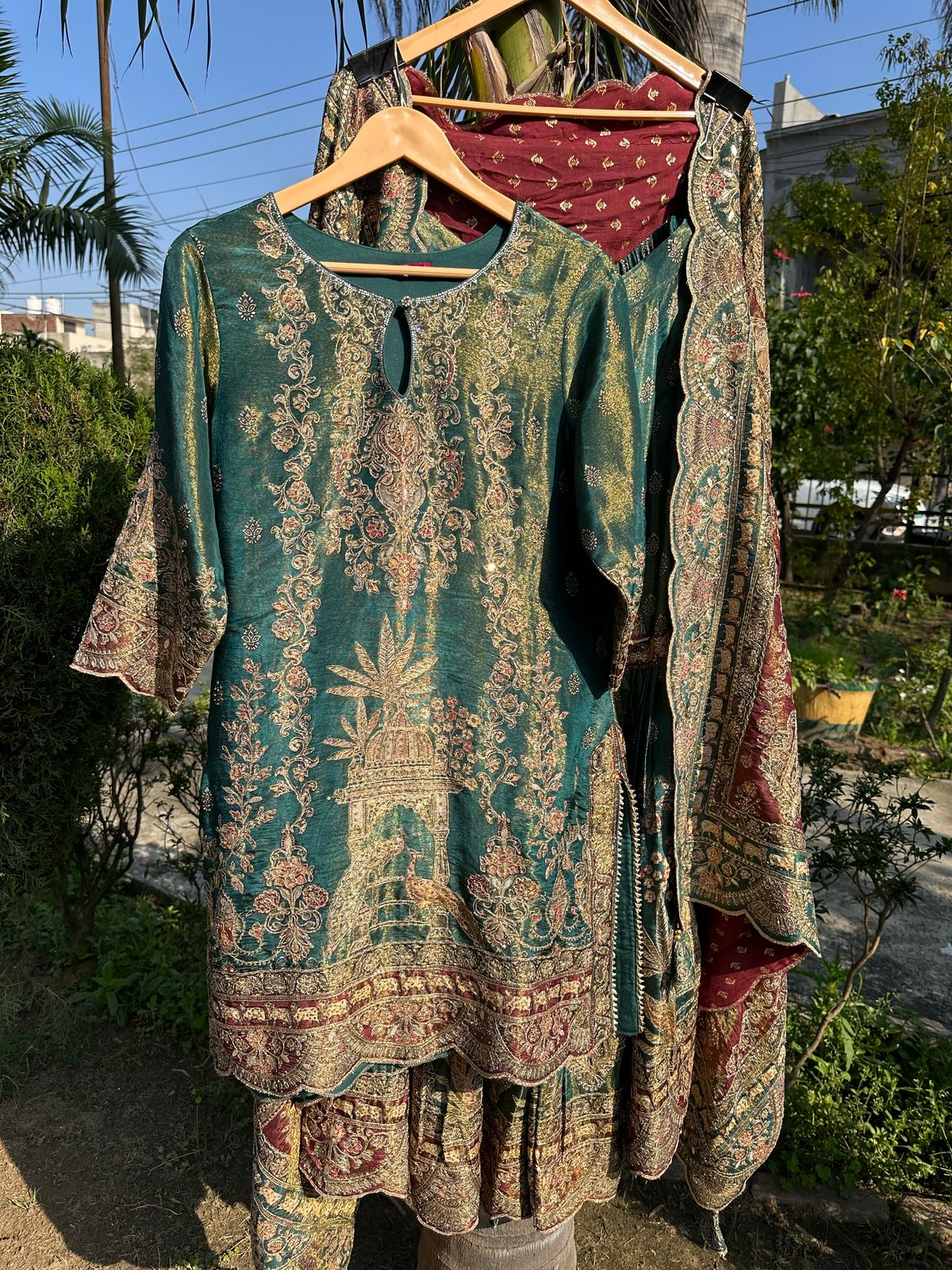 Make A Regal Statement In This Stunning Emerald Green Shimmer Silk Garara Suit, Designed To Dazzle With Every Step. The Rich Shimmer Silk Fabric Glows With Elegance, While Intricate Gold Embroidery Adds A Touch Of Royal Charm. The Short Kurta Features Finely Detailed Motifs And Delicate Handwork, Beautifully Complemented By Flared Garara Bottoms That Move With Grace. Paired With A Sheer, Embellished Dupatta, This Ensemble Is Perfect For Weddings, Festive Events, And Evening Celebrations.