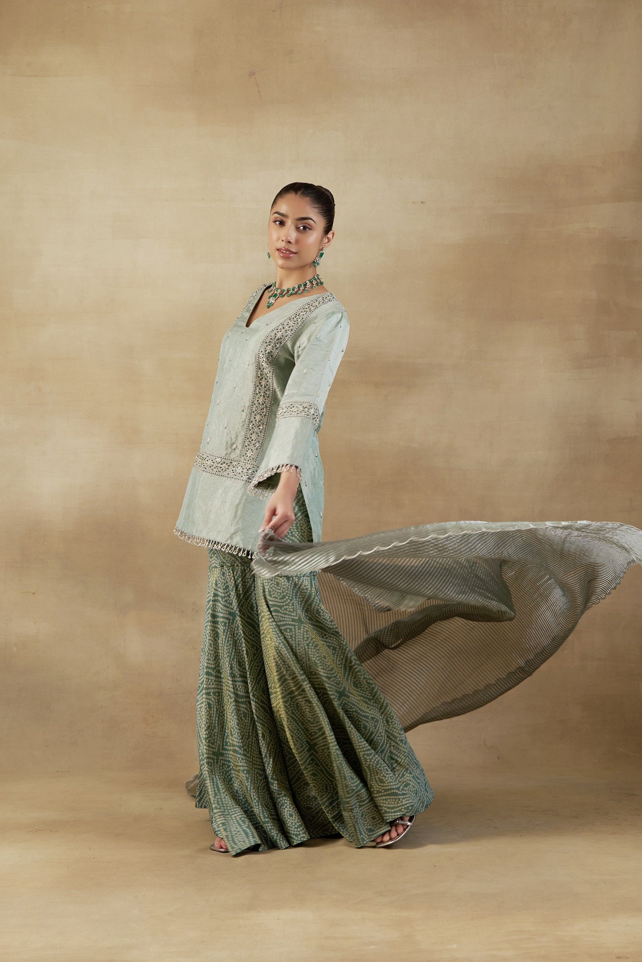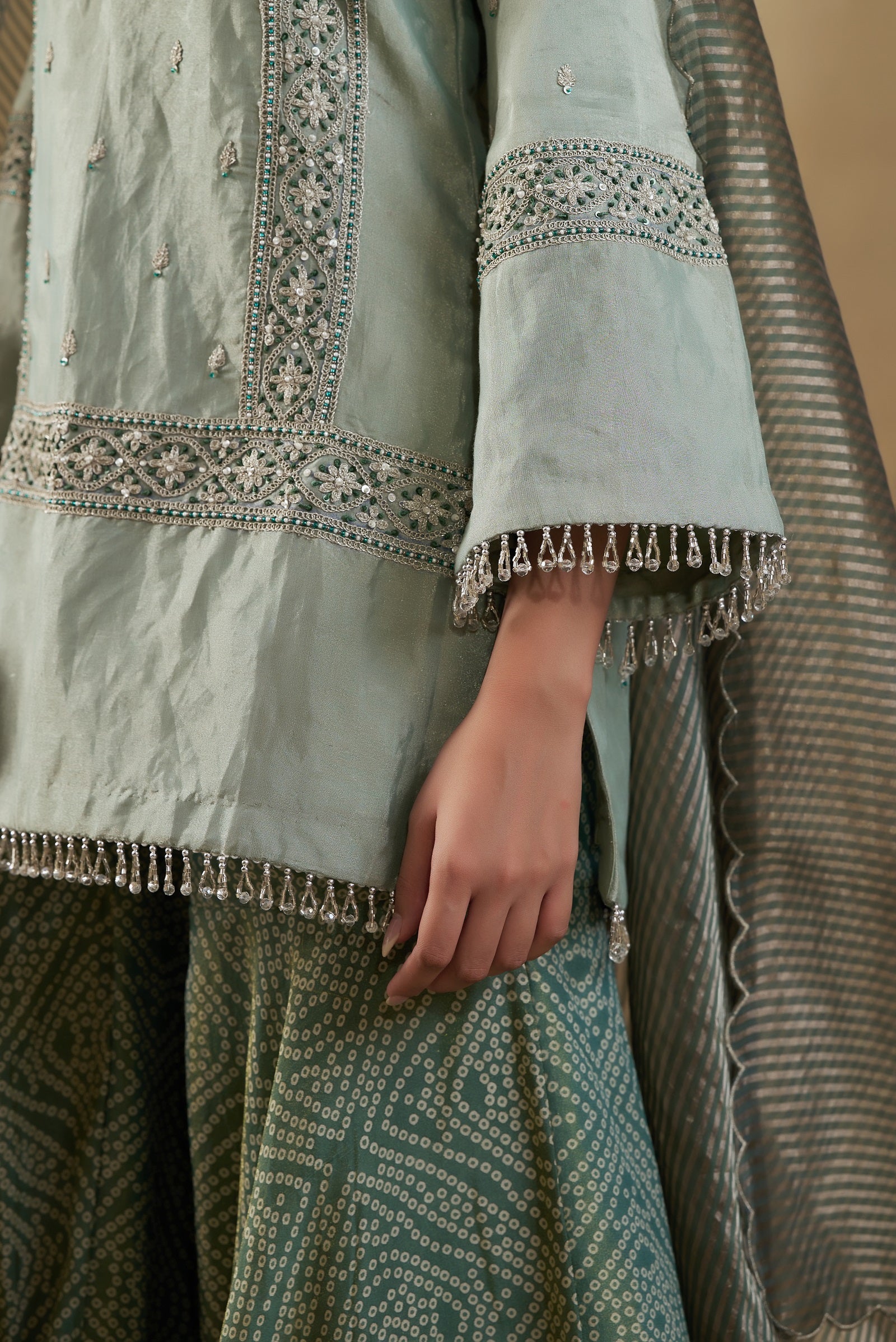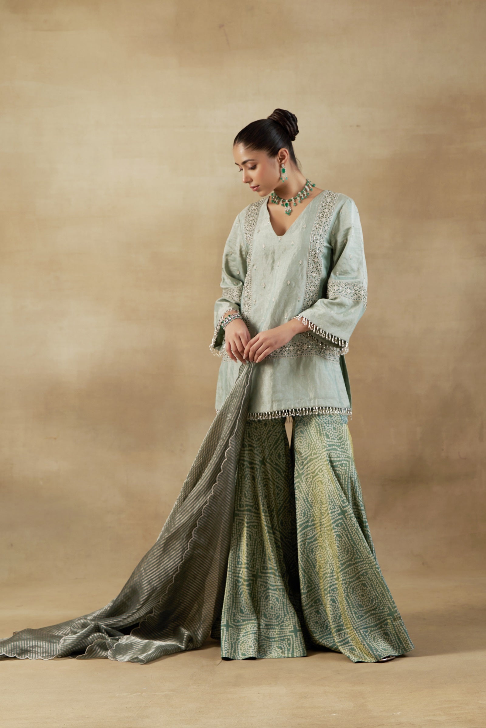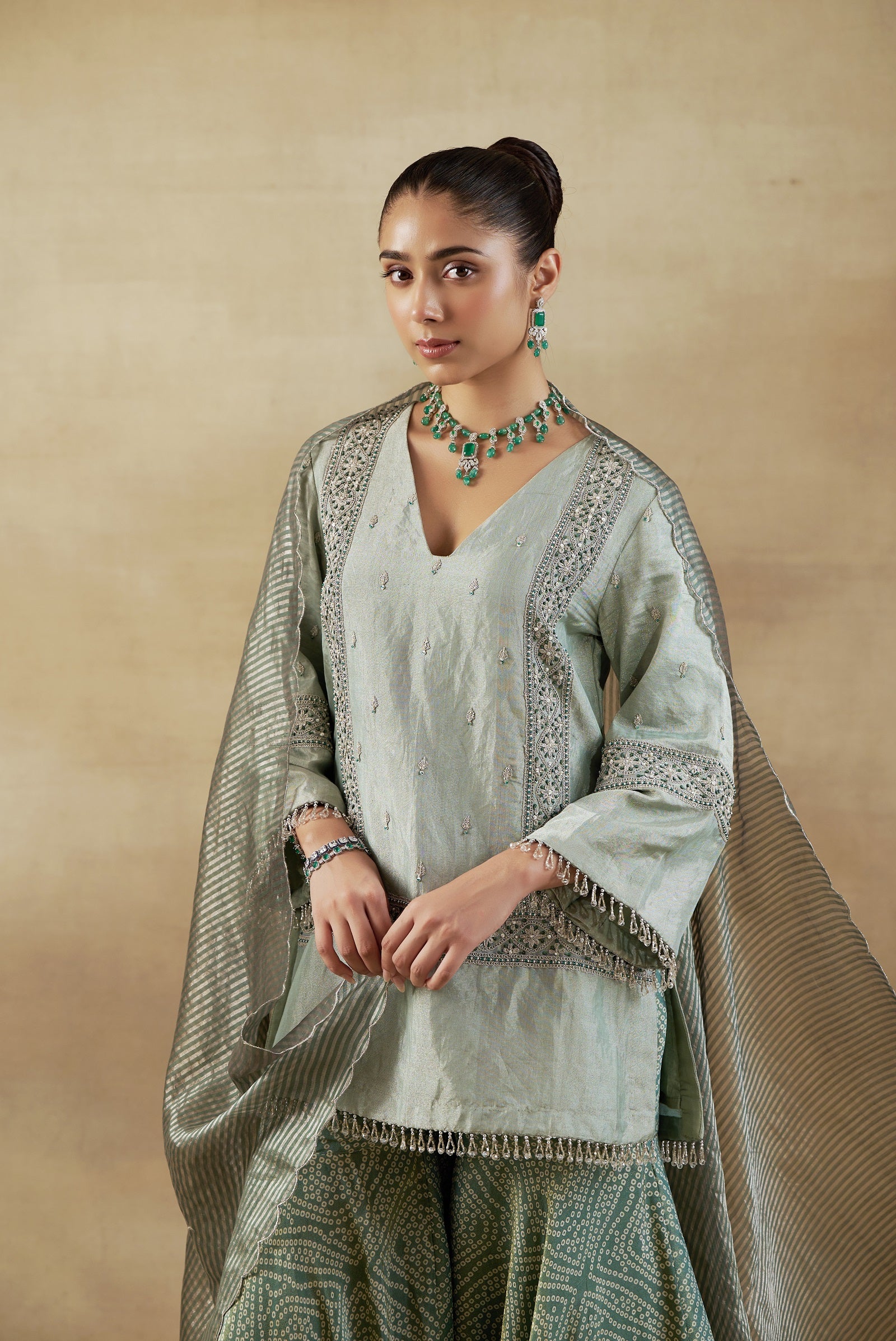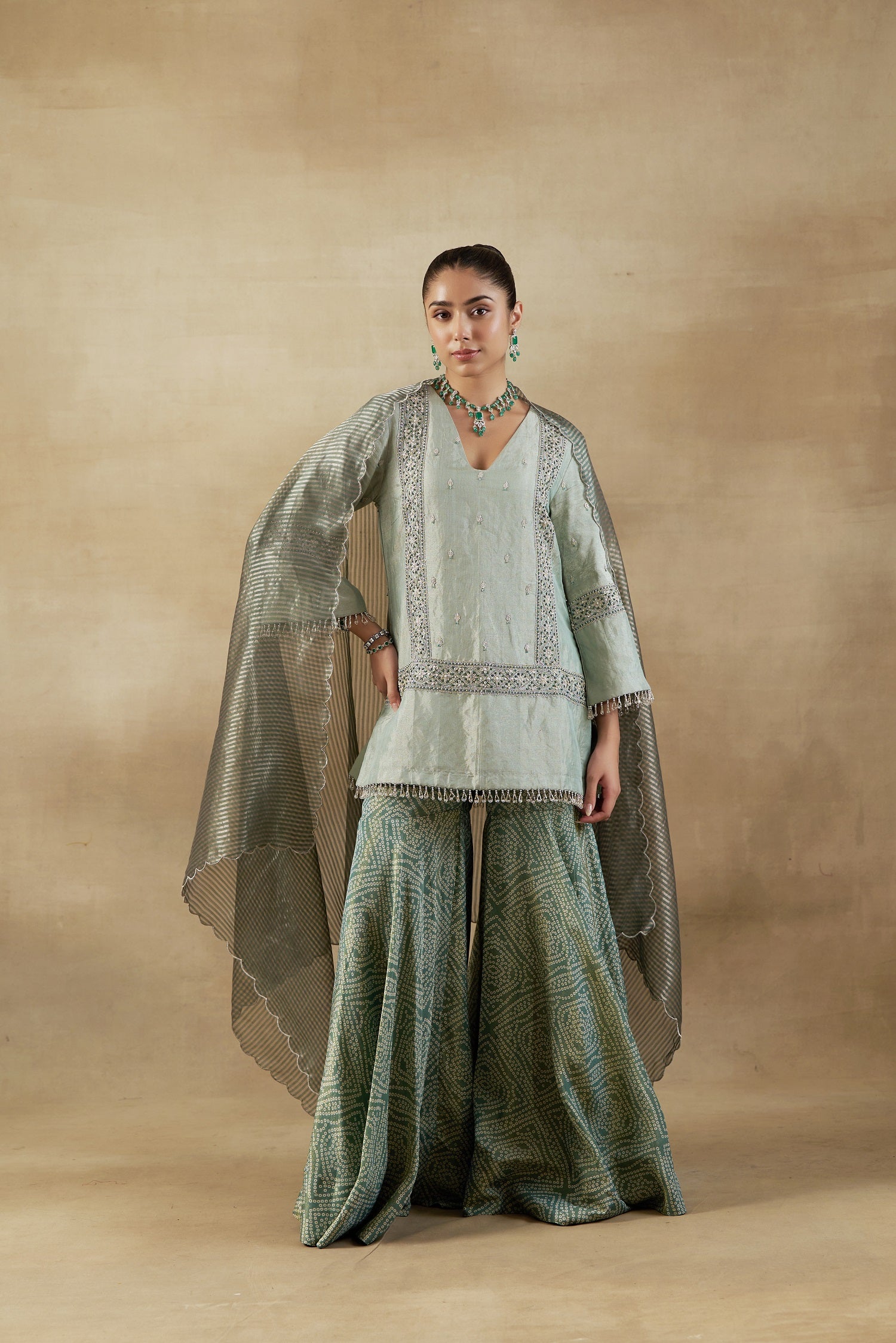 "short shirt in tissue with bandhani tissue garara and striped chanderi banarasi dupatta"