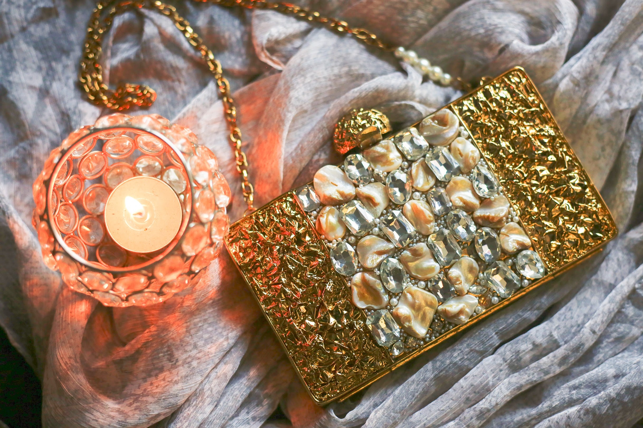 | This golden brass clutch is that perfect bejewelled bag and will add character to any look. |