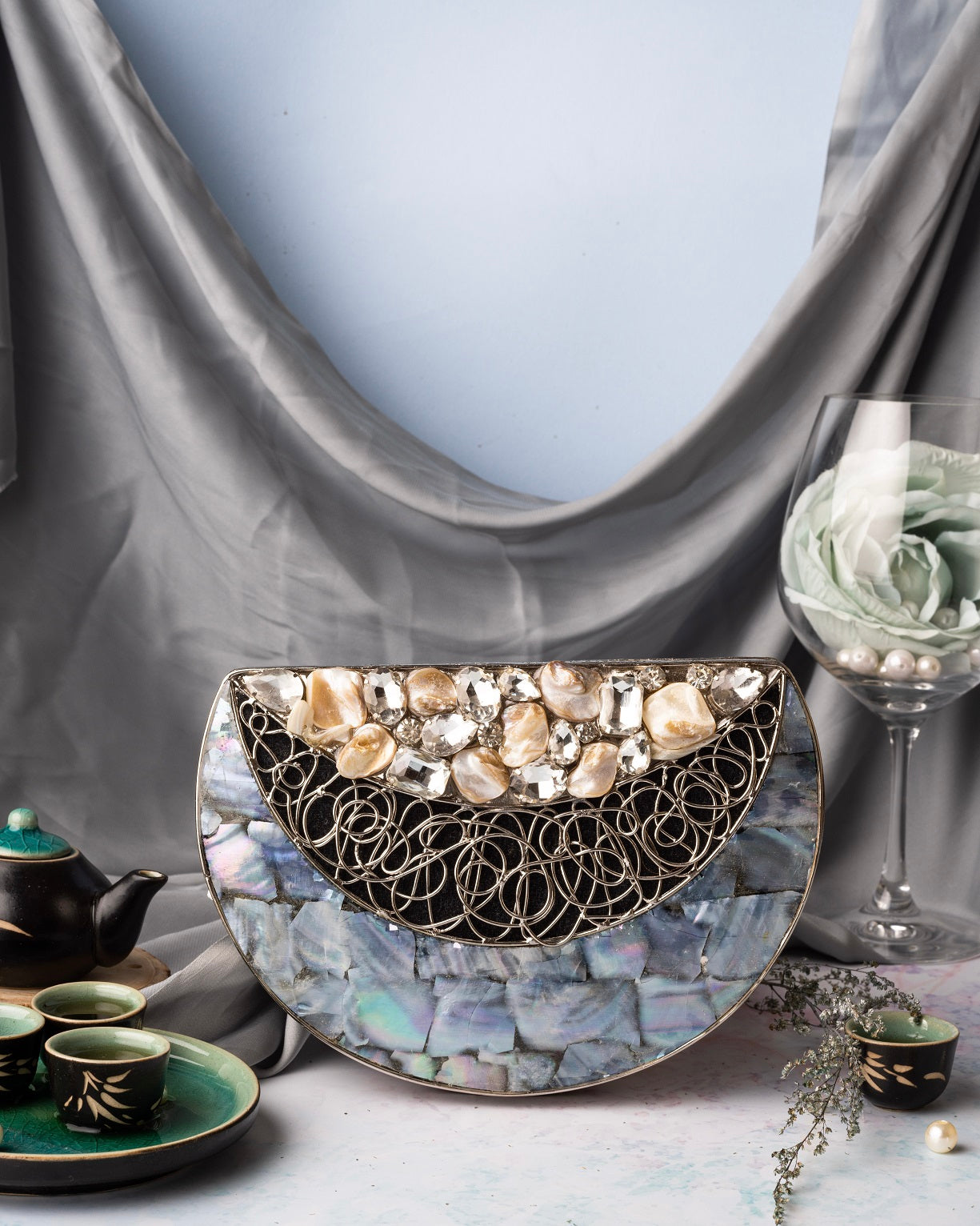| This crescent brass clutch has a perfect balance of rhinestones, delicate wirework and mother of pearl. This bag can be easily dressed up or dressed down. |