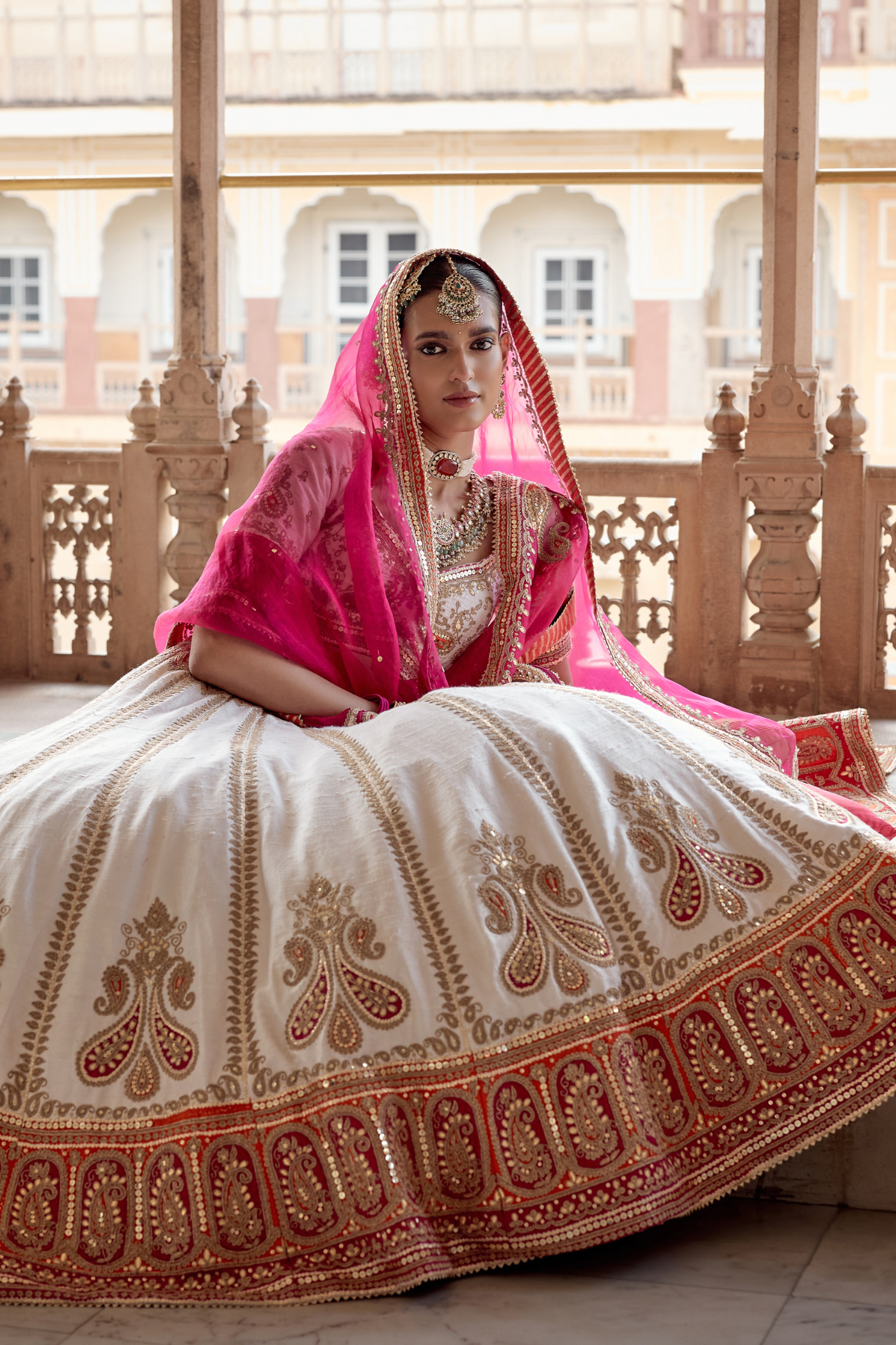 Crafted In Pure Raw Silk, This Exquisite Lehenga Features Intricate Kashmiri Tilla And Gota Patti Embroidery, Beautifully Highlighted With Delicate Pearls. Paired With A Silk Organza Dupatta And A Deep Sweetheart Neckline Blouse With Elbow Sleeves And A Deep Back, The Ensemble Is Finished With Elegant Gota Detailing For A Regal Touch.