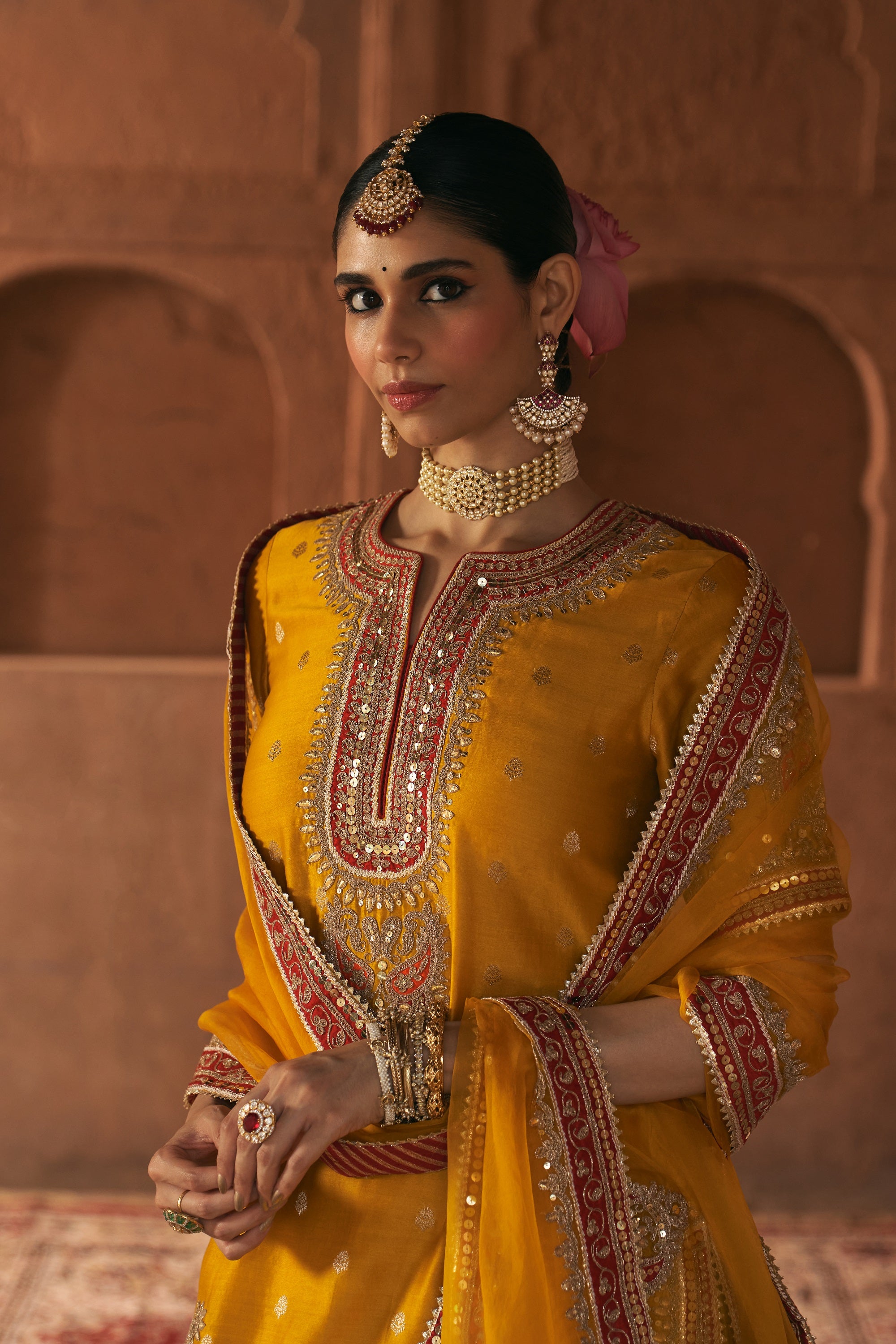 An Elegant Ensemble Featuring A Pure Banarasi Short Kurta With A Zero Neckline And Front Slit, Zero Back, And Elbow Sleeves. It Is Paired With A Sharara Showcasing A Broad Border And Embroidered Bootis, Along With A Beautifully Embroidered Silk Organza Dupatta. Adorned With Intricate Kashmiri Tilla And Gota Patti Embroidery, Highlighted With Pearls And Sequins, The Outfit Is Finished With Delicate Gota Detailing For A Regal Finish.