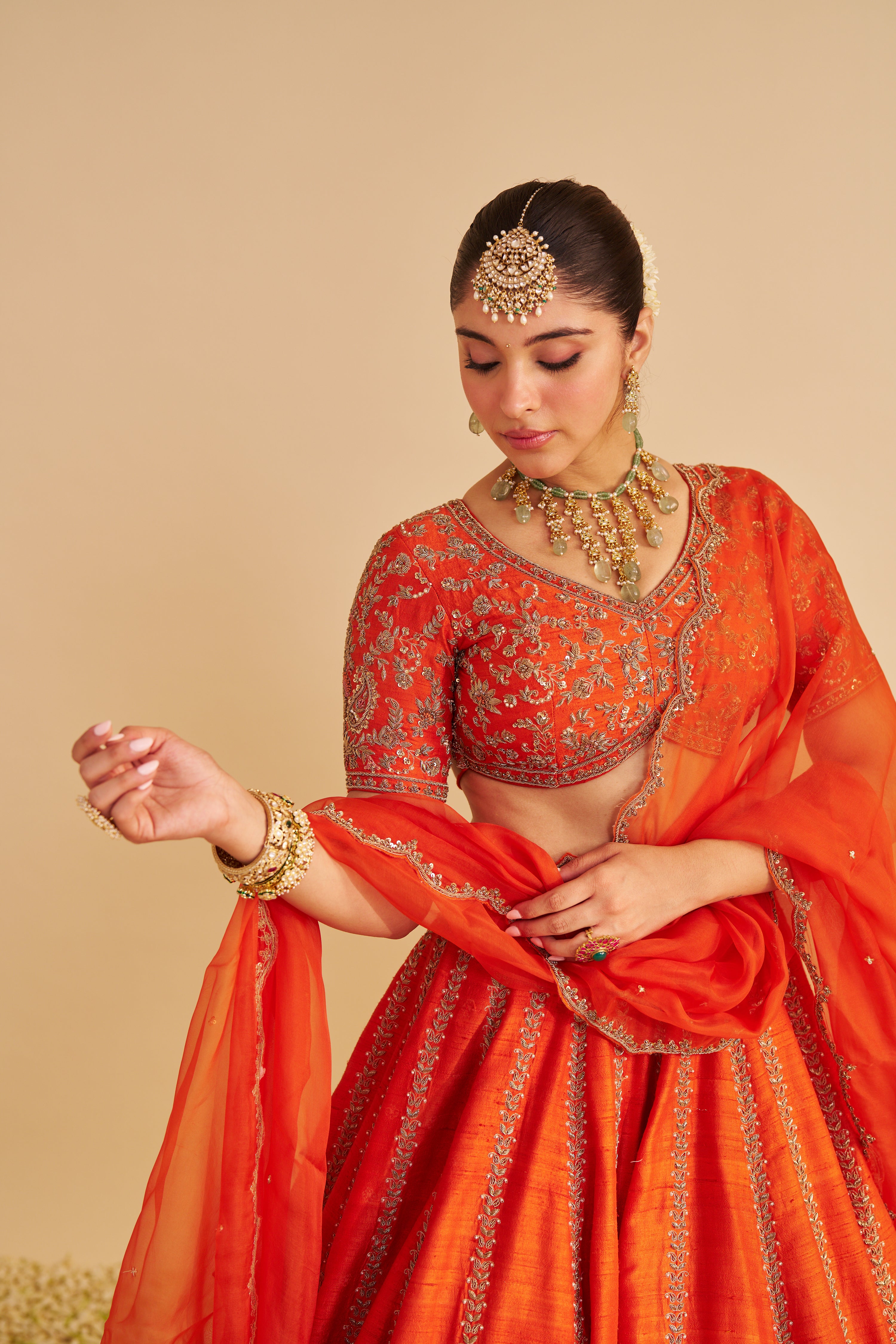 Naazila - dabka zardozi embroidered raw silk burnt orange lehenga set