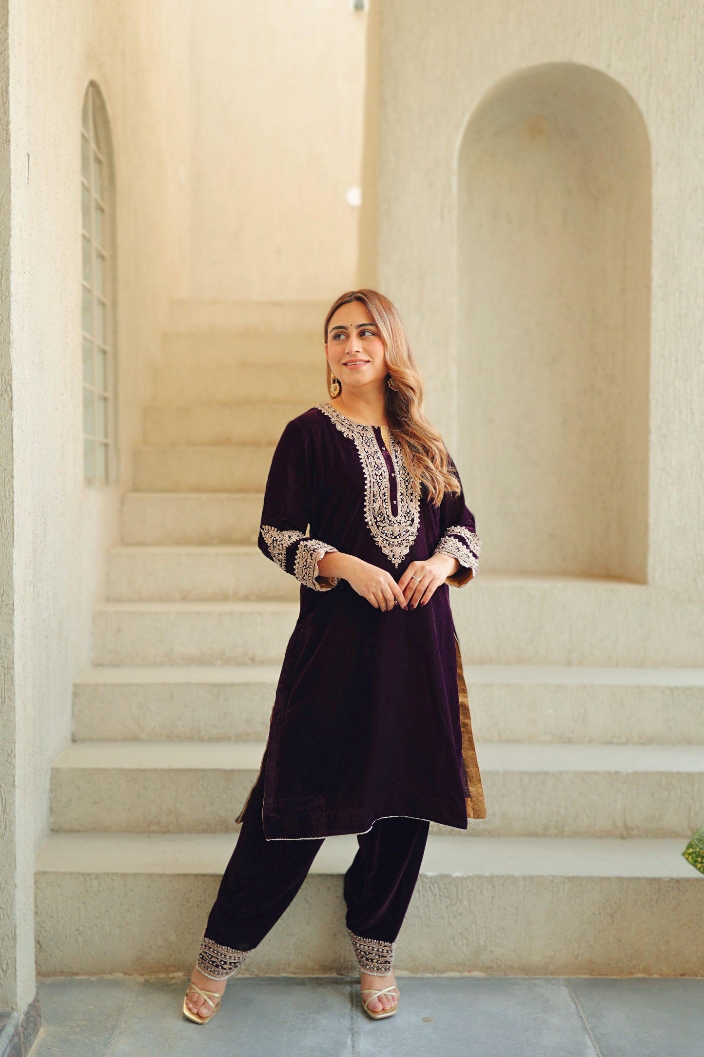 This Short Straight Ensemble Is Crafted From Luxurious Pure Silk Velvet, Paired Seamlessly With A Traditional Dogri Salwar. The Outfit Features A Stylish Zero-Neck With A Placket And Three-Quarter Bell Sleeves, Offering A Contemporary Yet Timeless Silhouette. Adorned With Intricate Kiran Dori Embroidery And Shimmering Sitara, It Radiates Elegance And Charm. The Ensemble Is Beautifully Finished With Pure Tissue Fabric And Delicate Kinnari, Adding The Perfect Final Touch To This Stunning, Refined Look.
