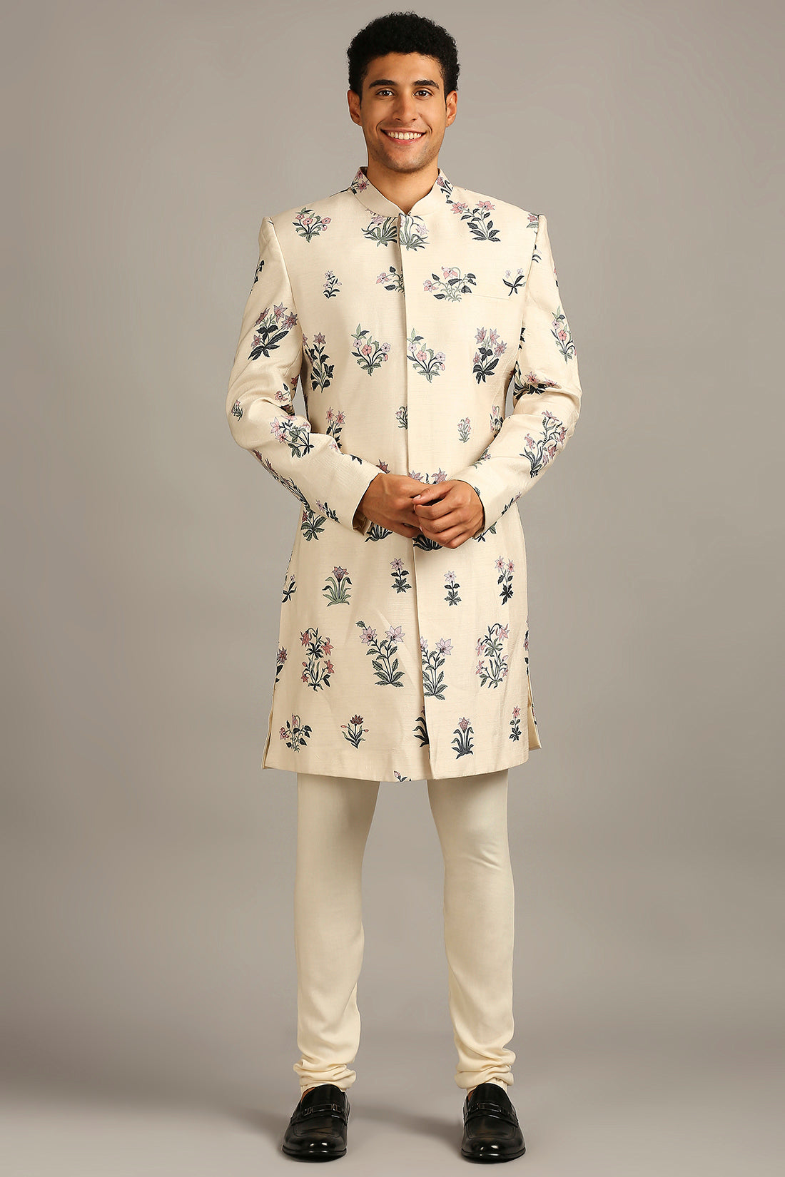 Make a statement of subtle sophistication with this Pastel Floral Printed Sherwani Set, a graceful blend of tradition and contemporary style. Designed in soothing pastel tones, the sherwani features intricate floral prints that add a refreshing charm without overpowering the look. Crafted from premium fabric for a regal drape and comfortable fit, it is paired with coordinated bottoms to complete the ensemble.