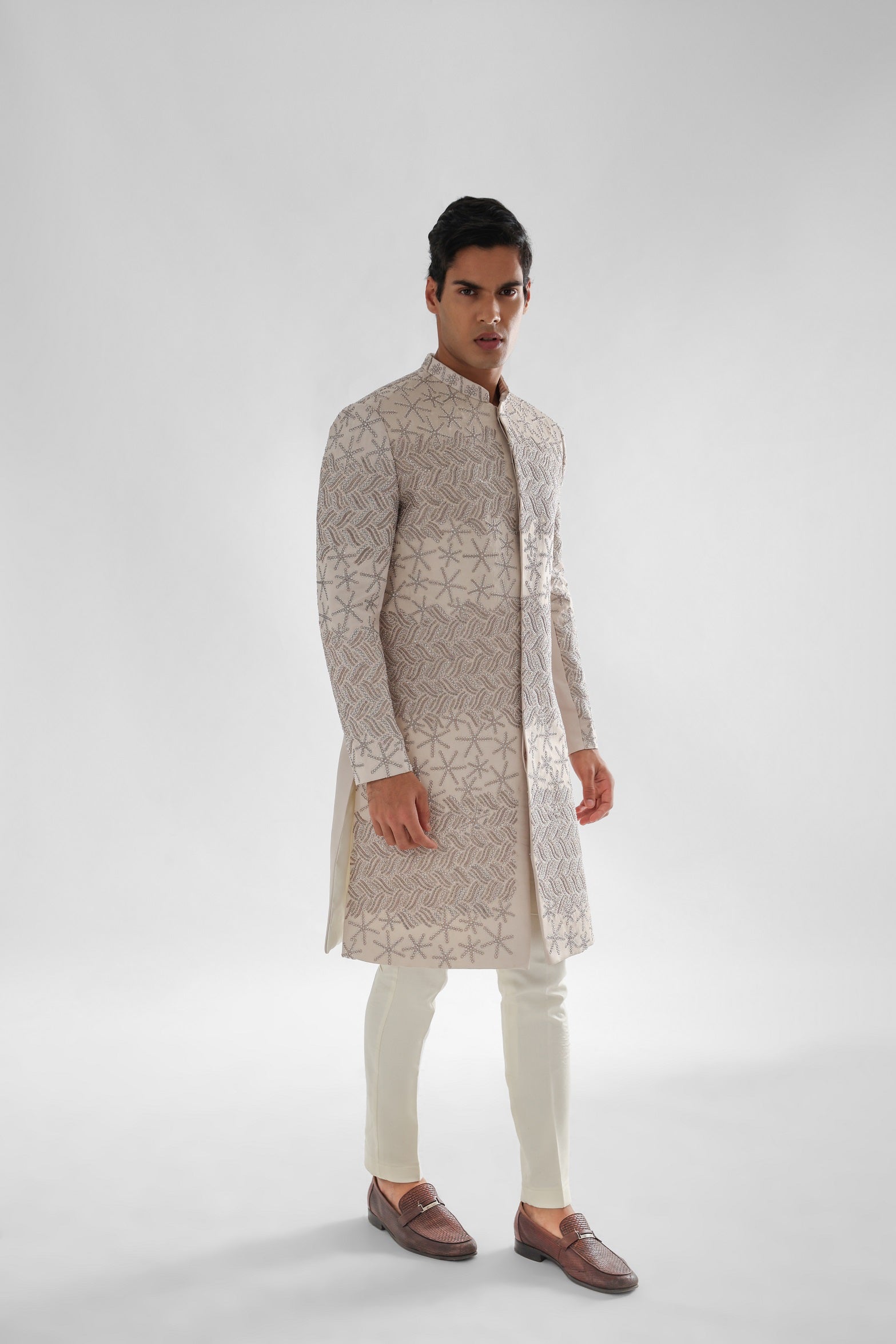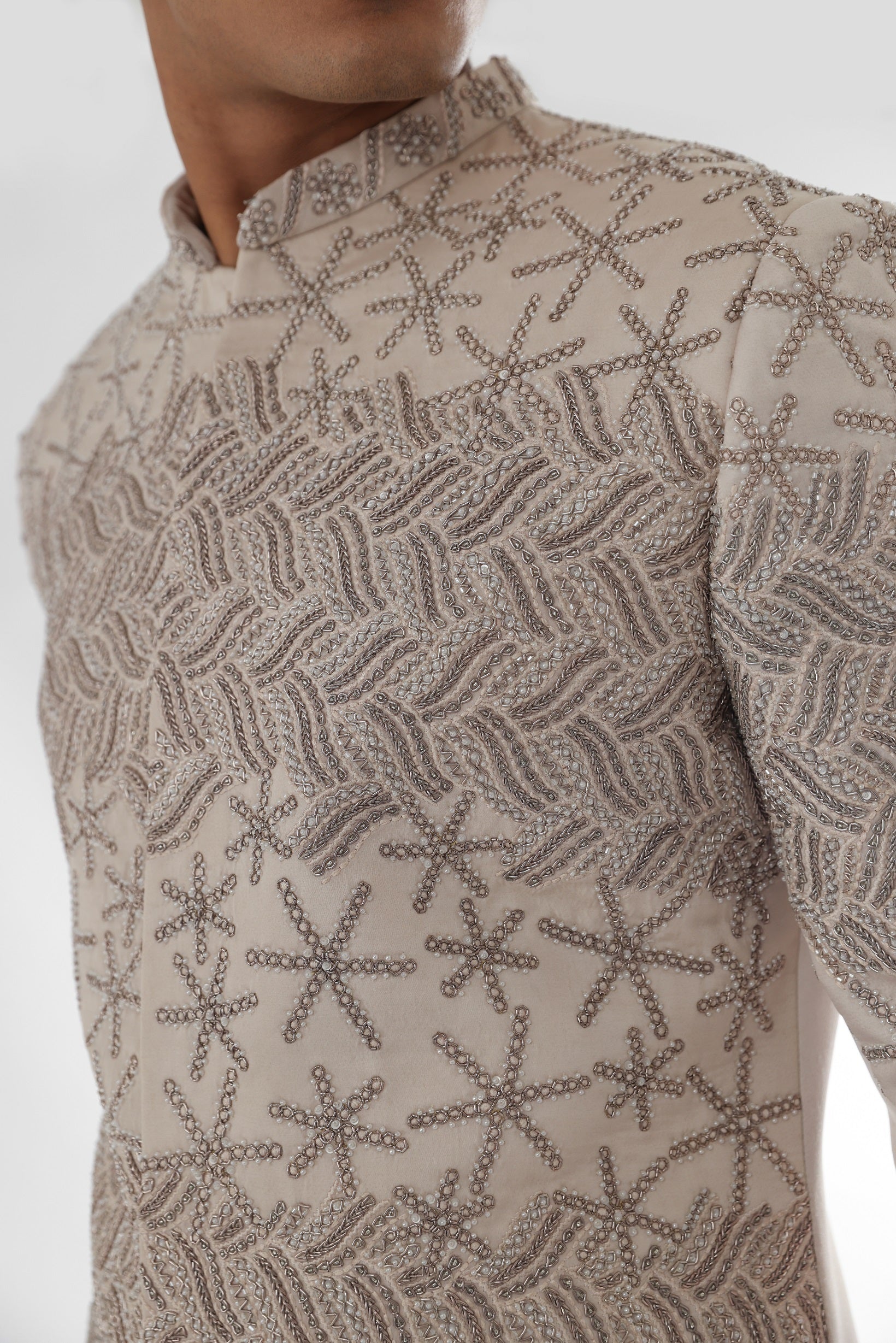 | Peach sherwani set with intricate use of moti and maal work . The Set includes Sherwani ,Jacket,Kurta and Pants. Please note: Safa and Jooti are not included in the set. |
