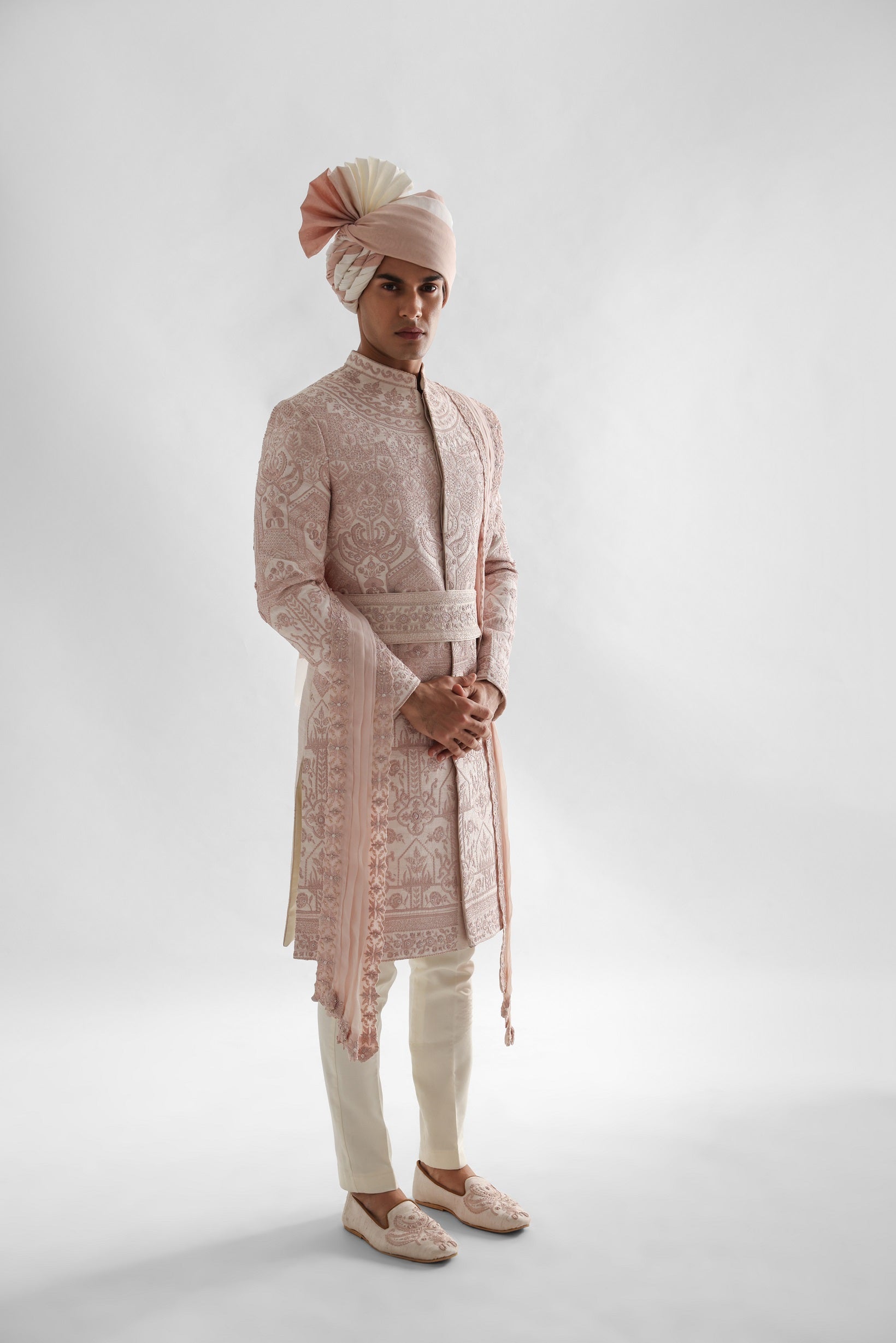 Powder pink sherwani set with intricate threadwork all over and highlights using moti and sequin work. The set includes Sherwani Jacket, Dupatta, Kurta And Pants. Please Note: The Safa and Jooti are not inluded in the set.
