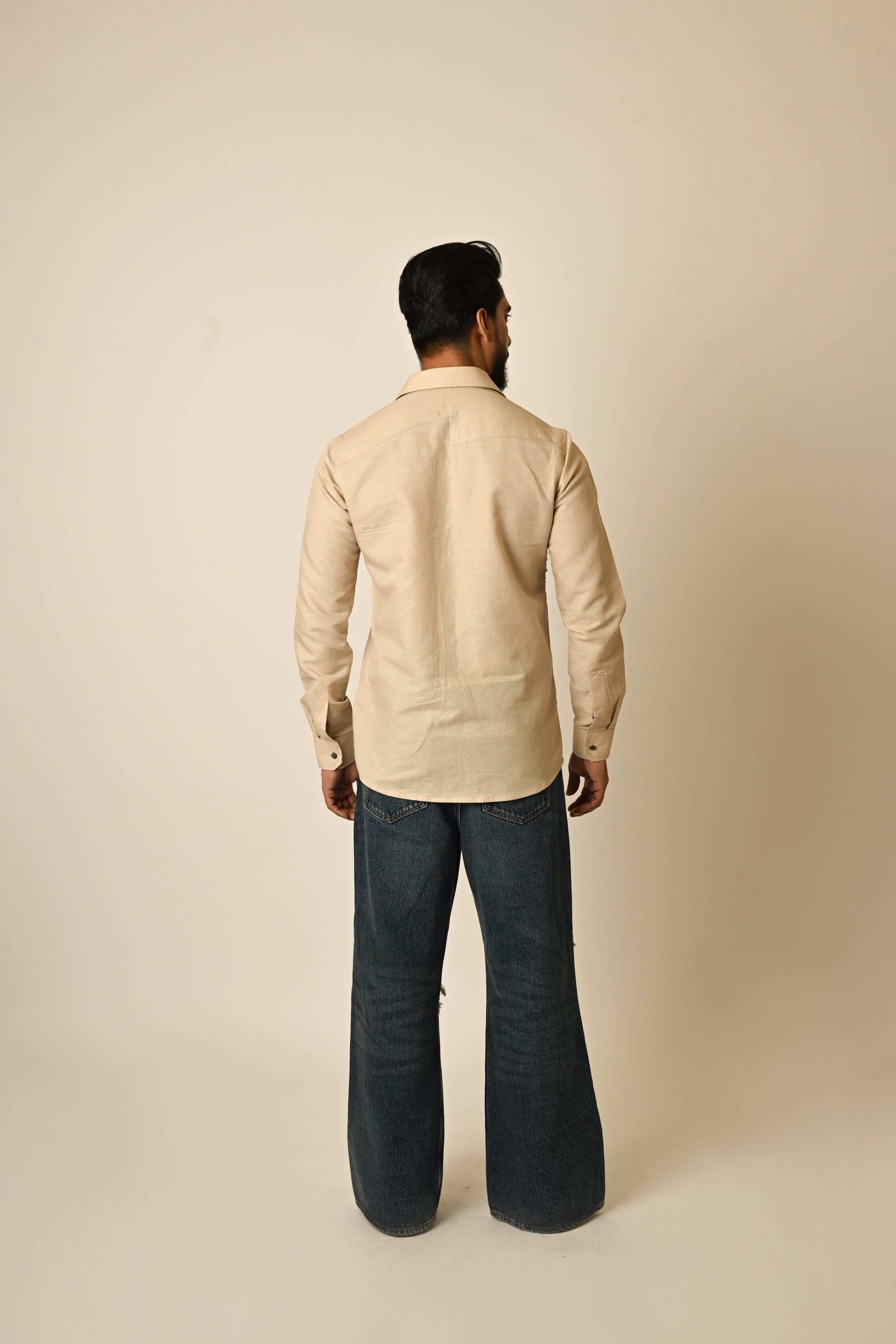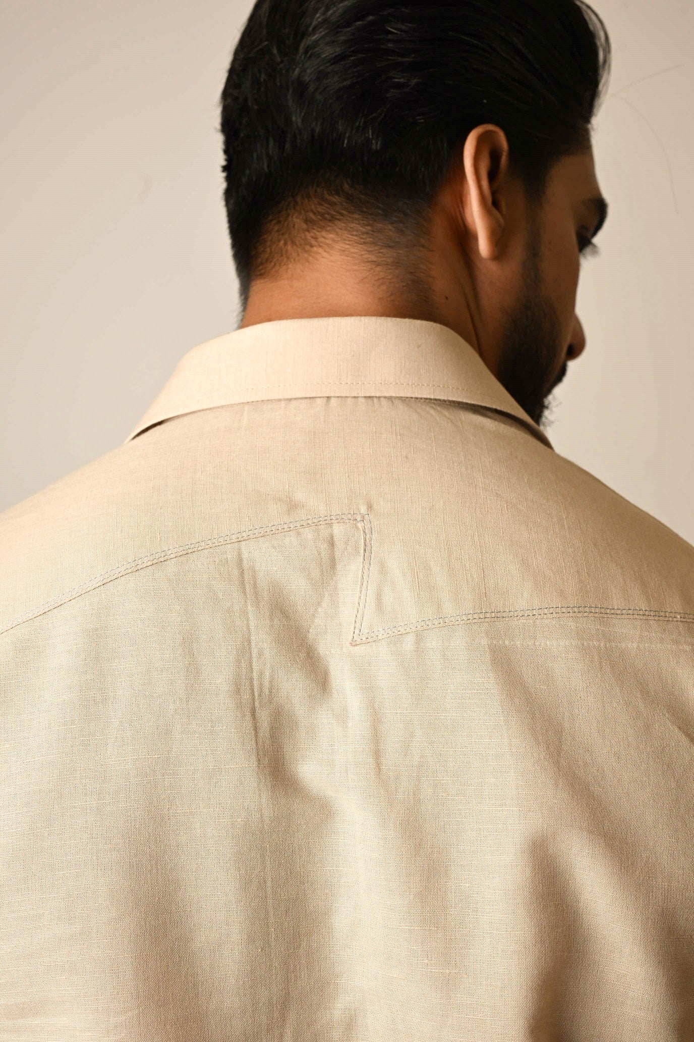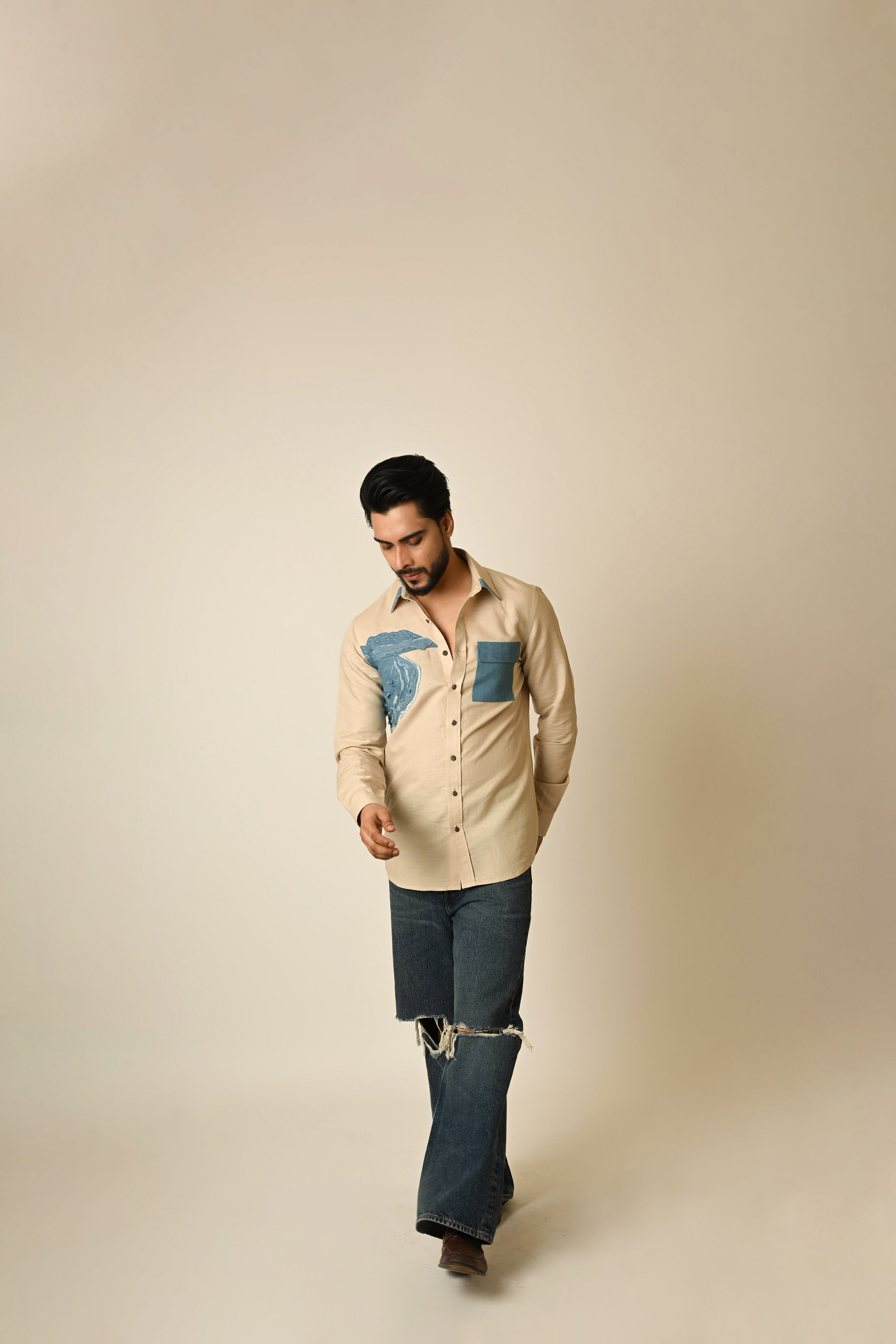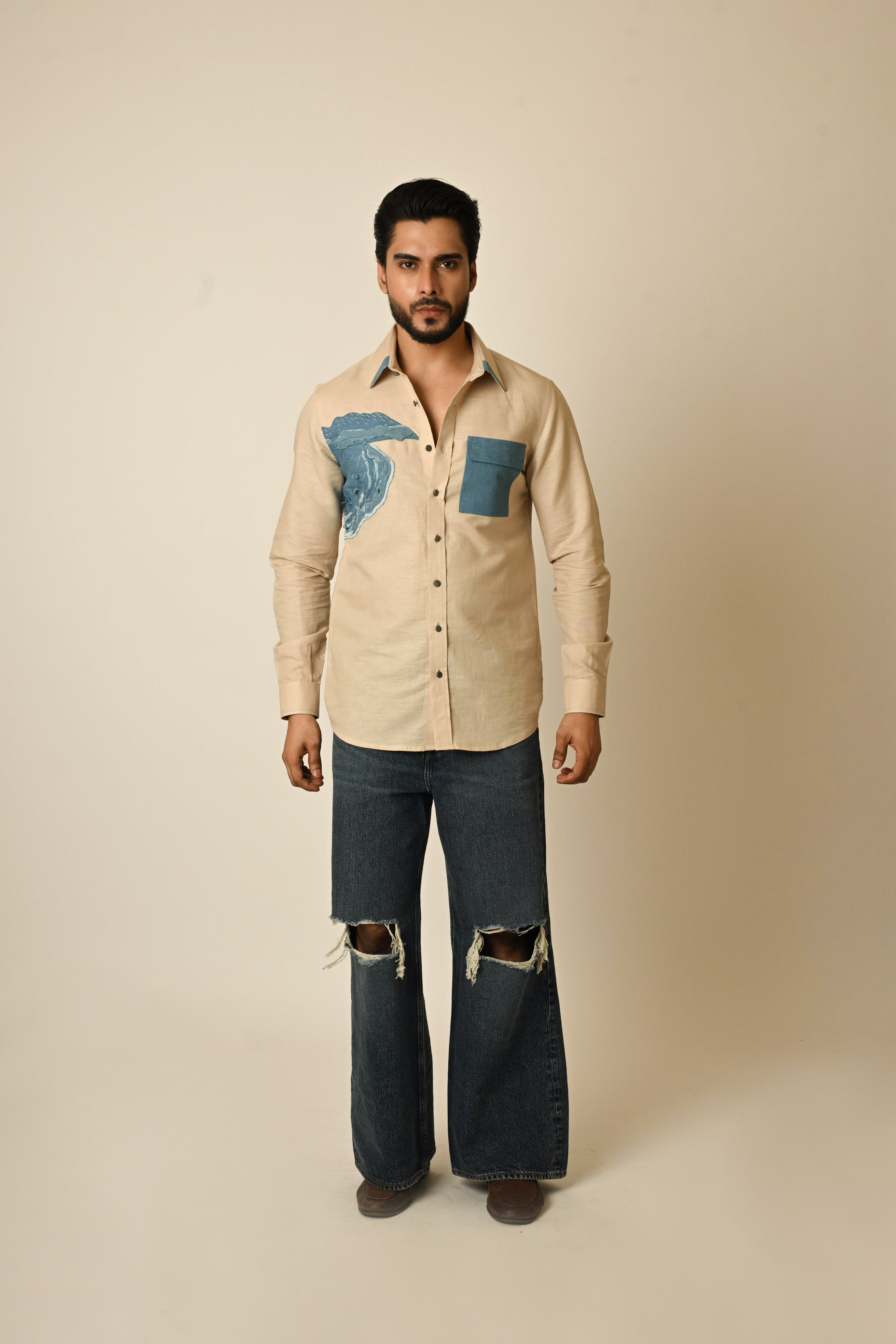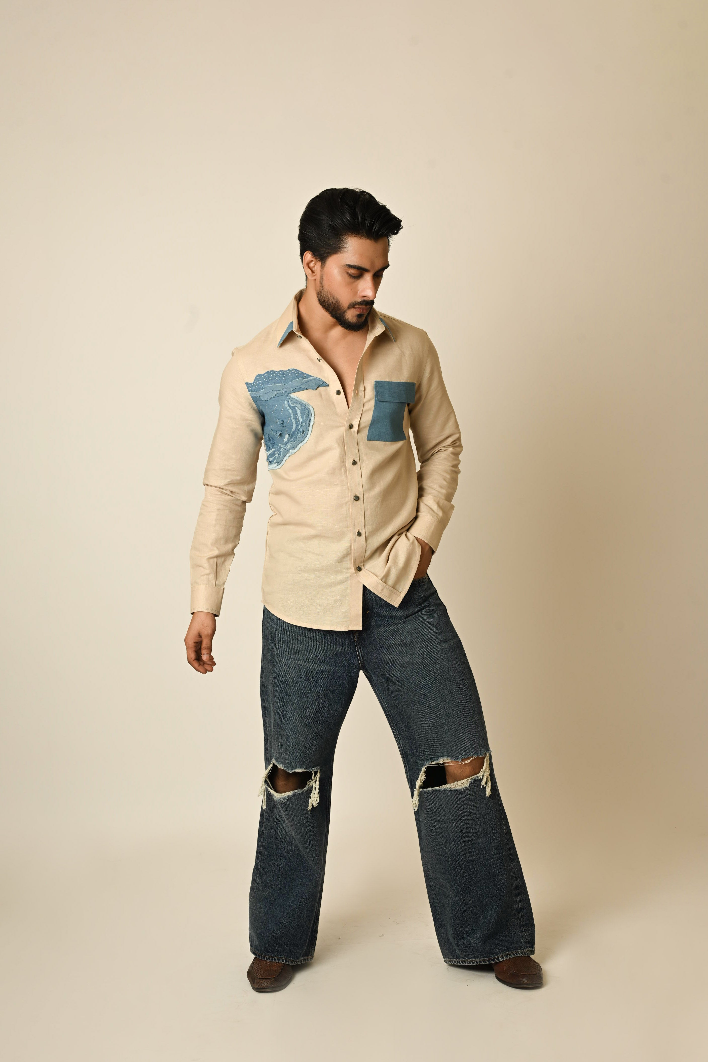 A beige linen shirt ornamented with the use of fabric manupulation technique depicting a sea side view with minimal threadwork highlightings done using denim material