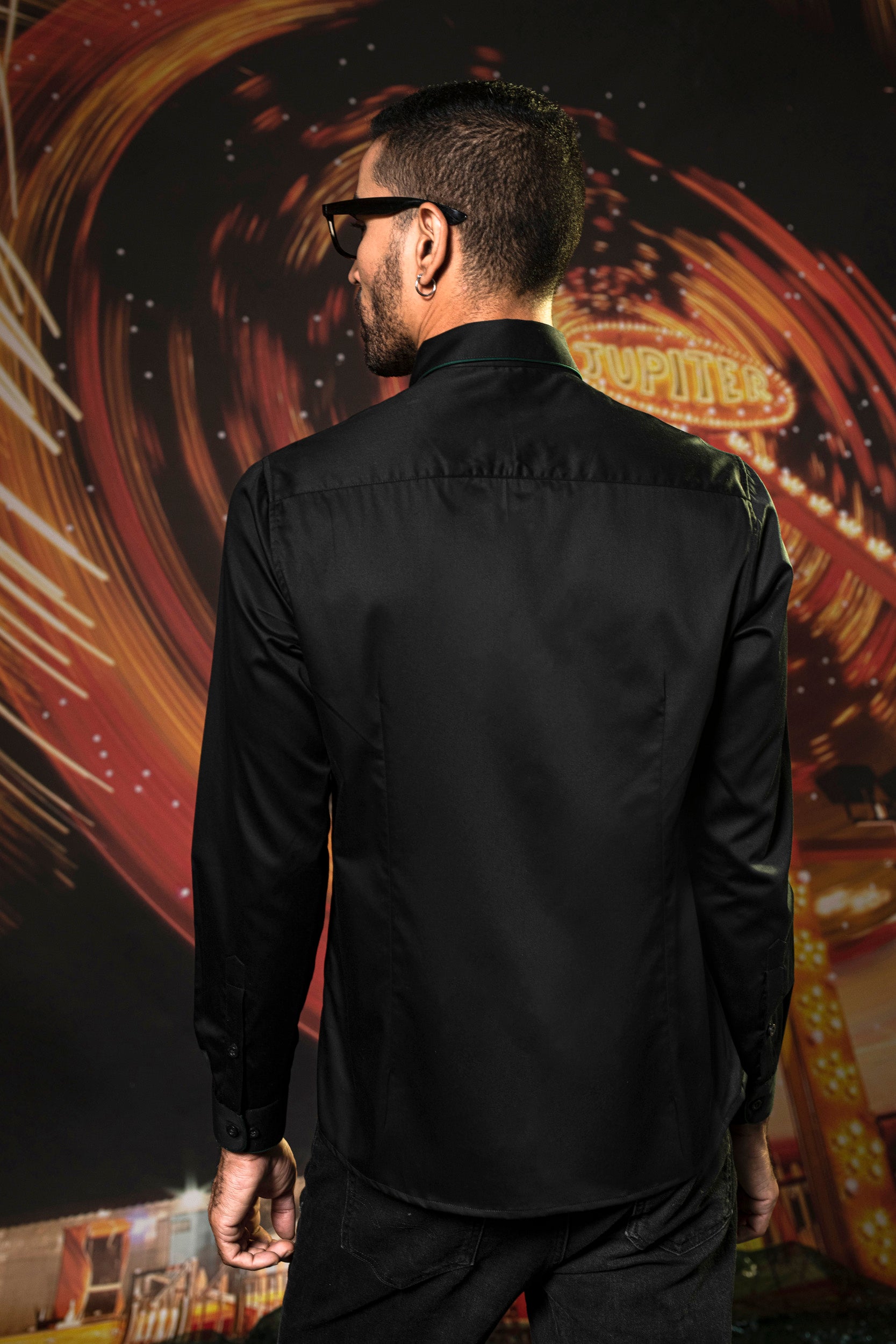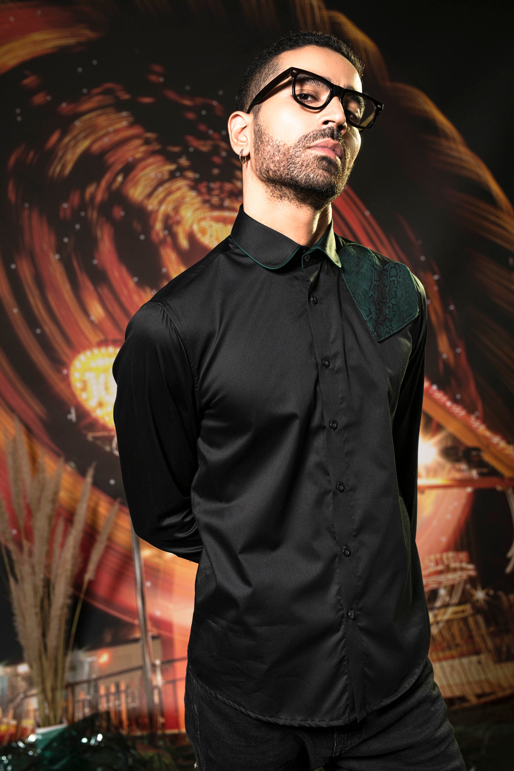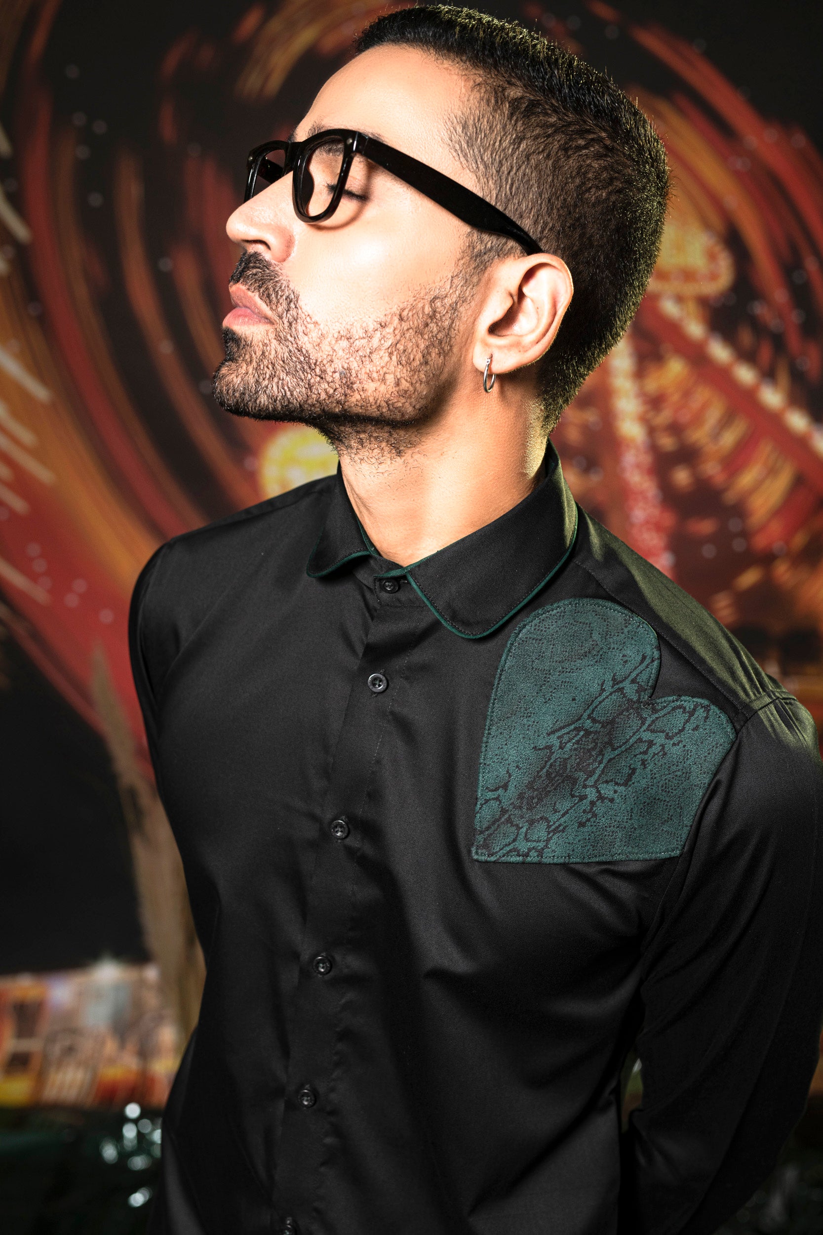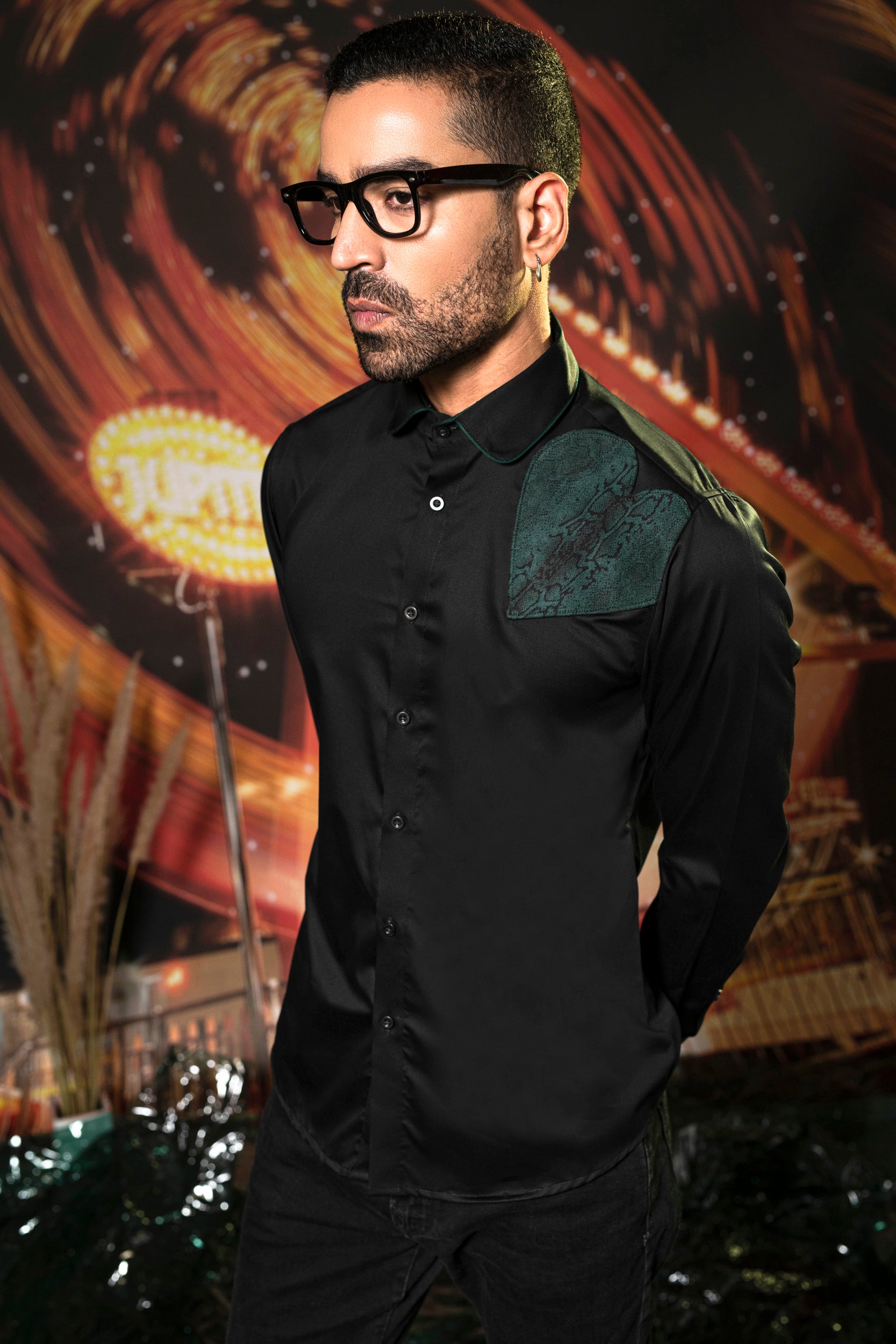 Featuring a black shirt in cotton base with animal printed heart-shaped patch. Perfect wear for parties and cocktail ceremonies.
