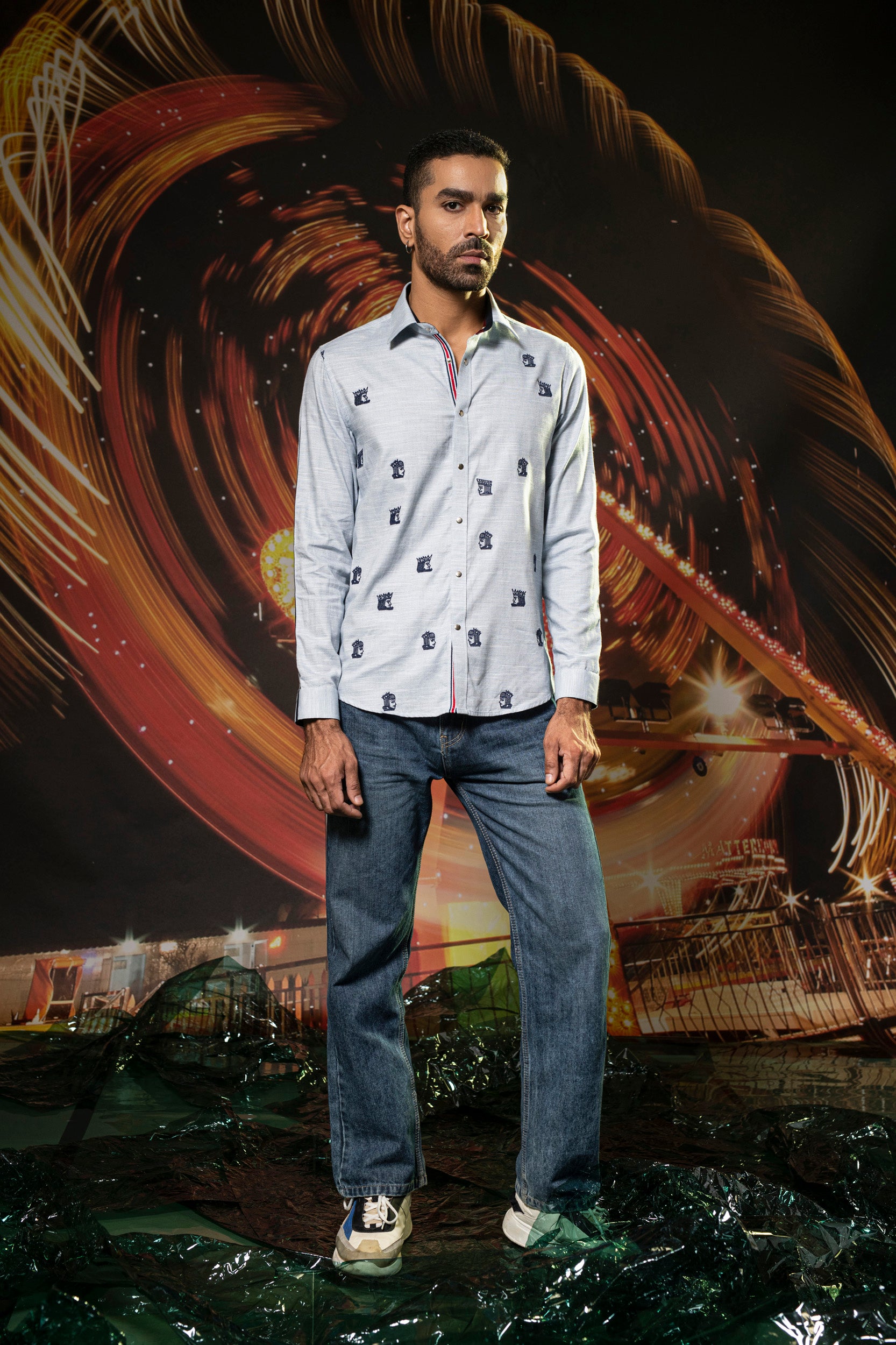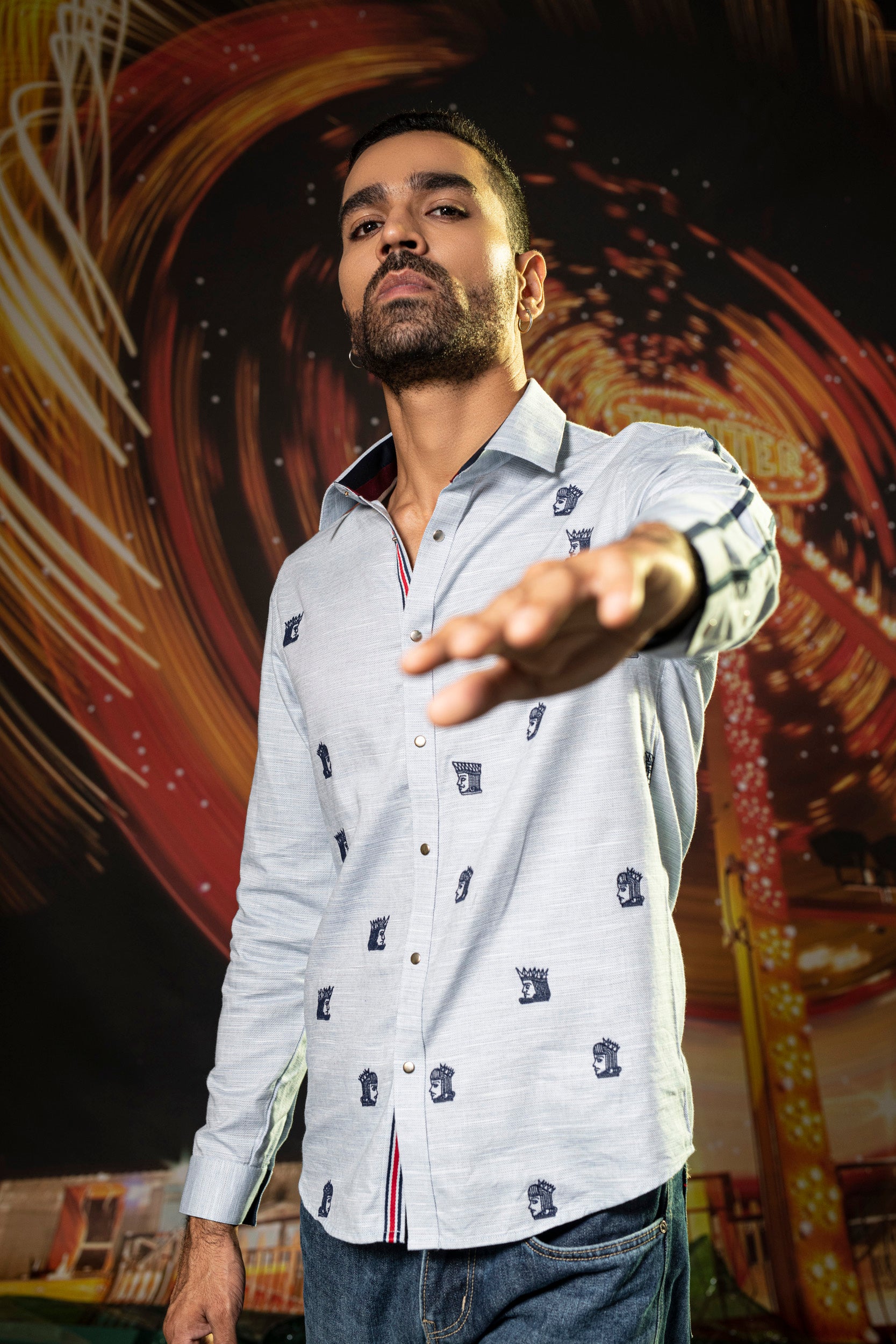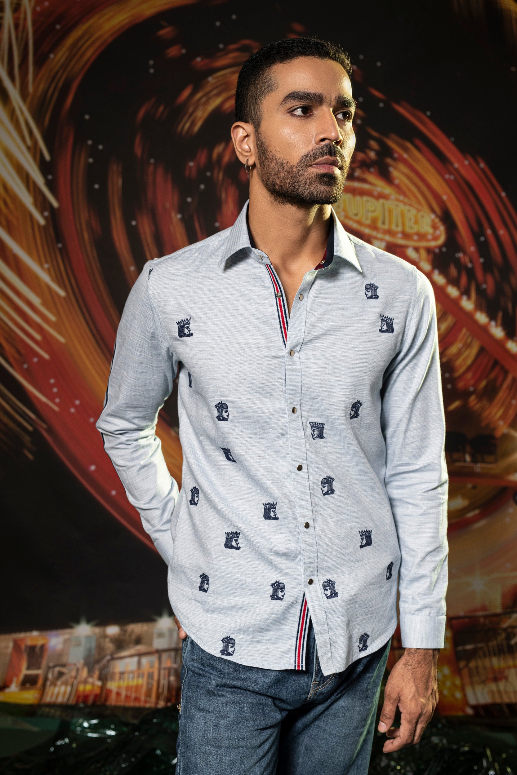 Featuring a blue shirt in cotton base with navy blue thread embroidery. Perfect wear for parties and cocktail ceremonies.