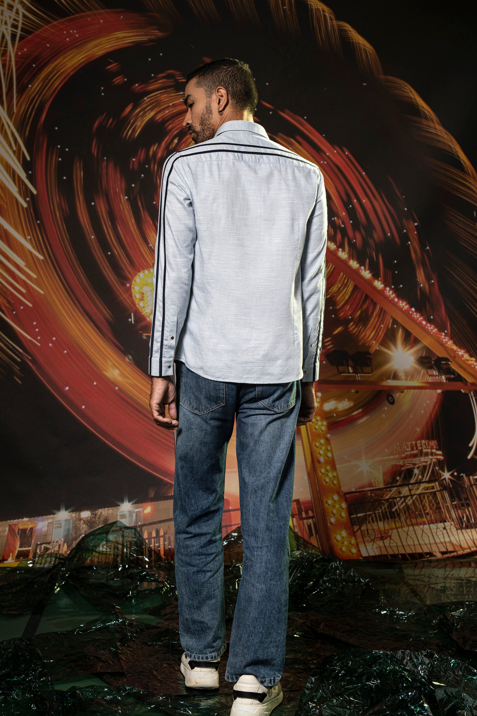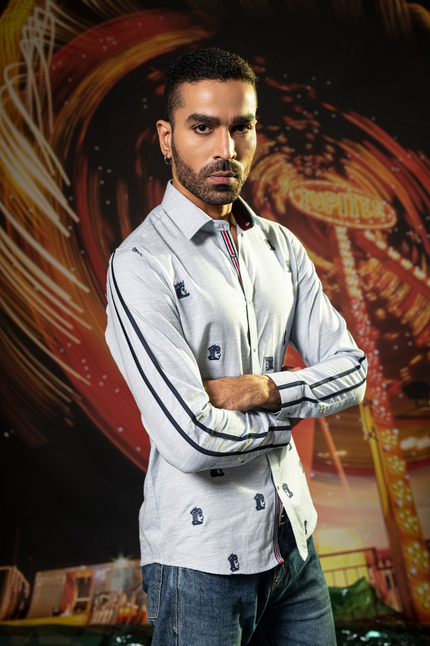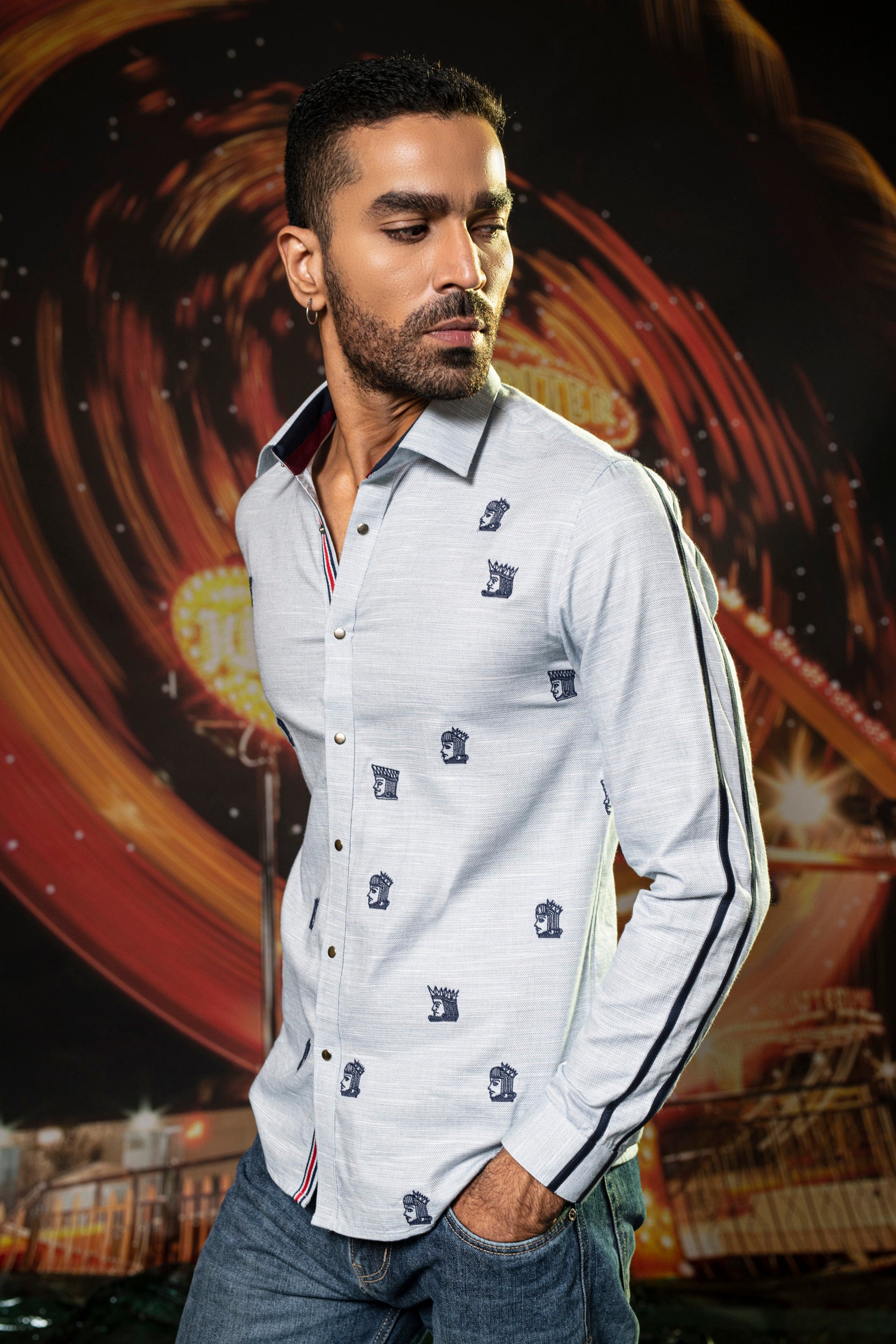 Featuring a blue shirt in cotton base with navy blue thread embroidery. Perfect wear for parties and cocktail ceremonies.