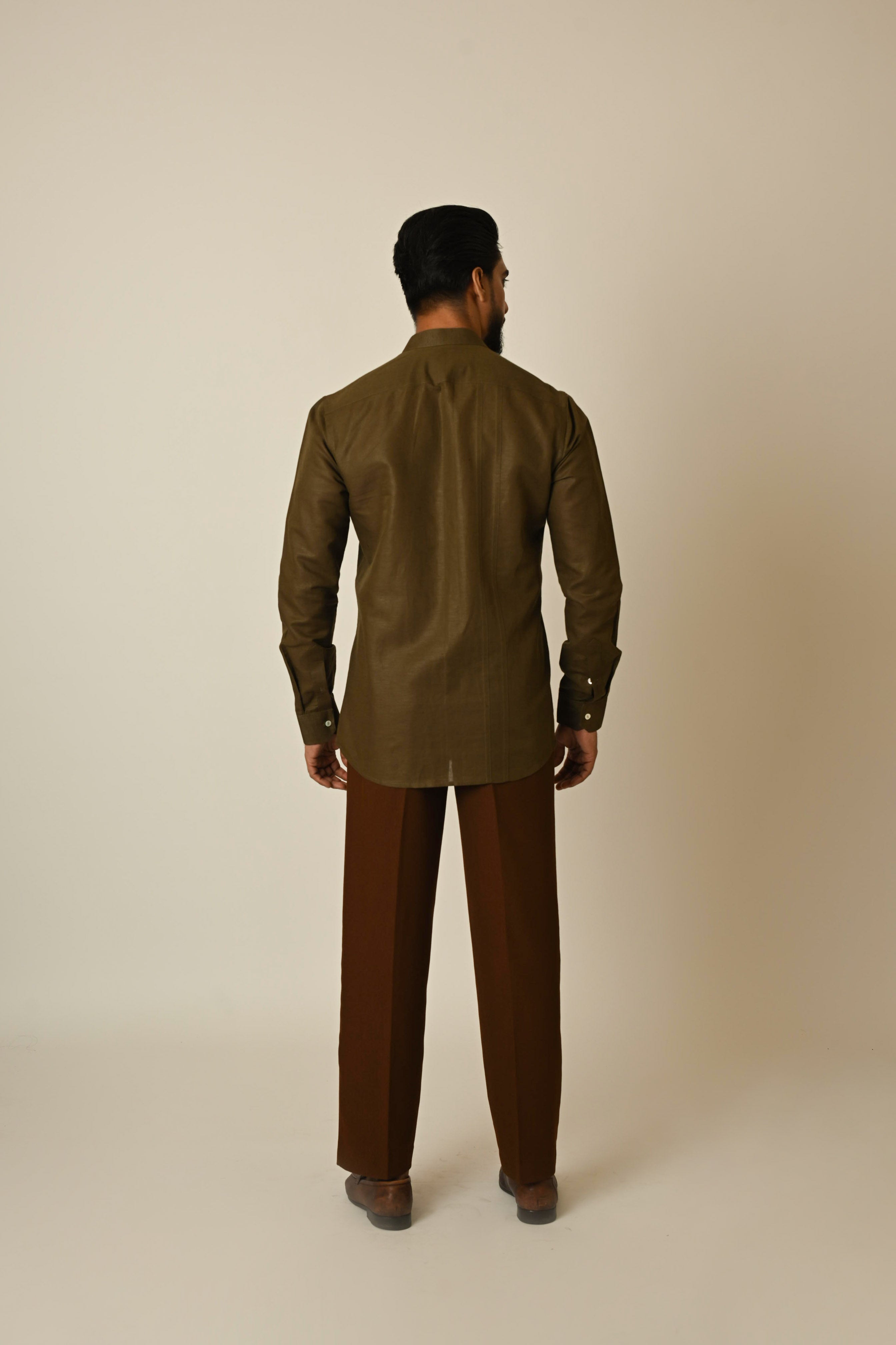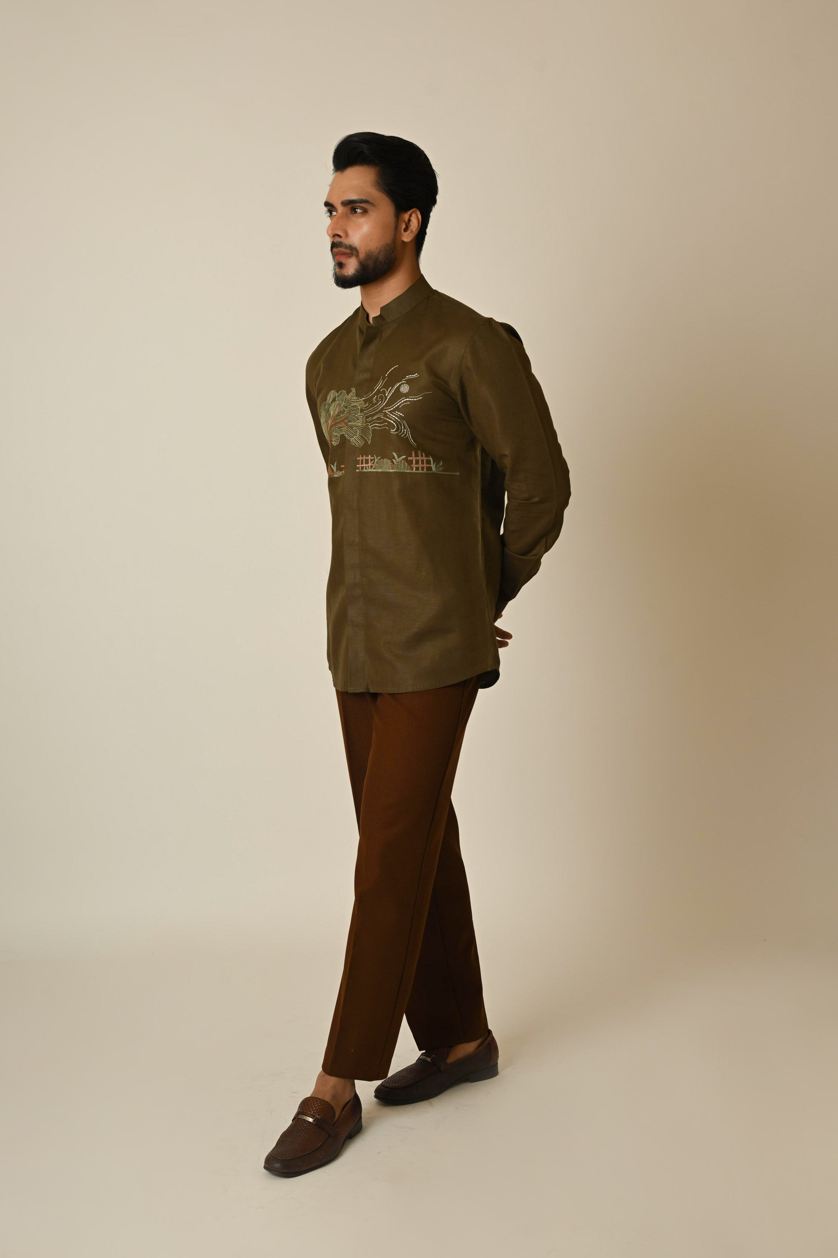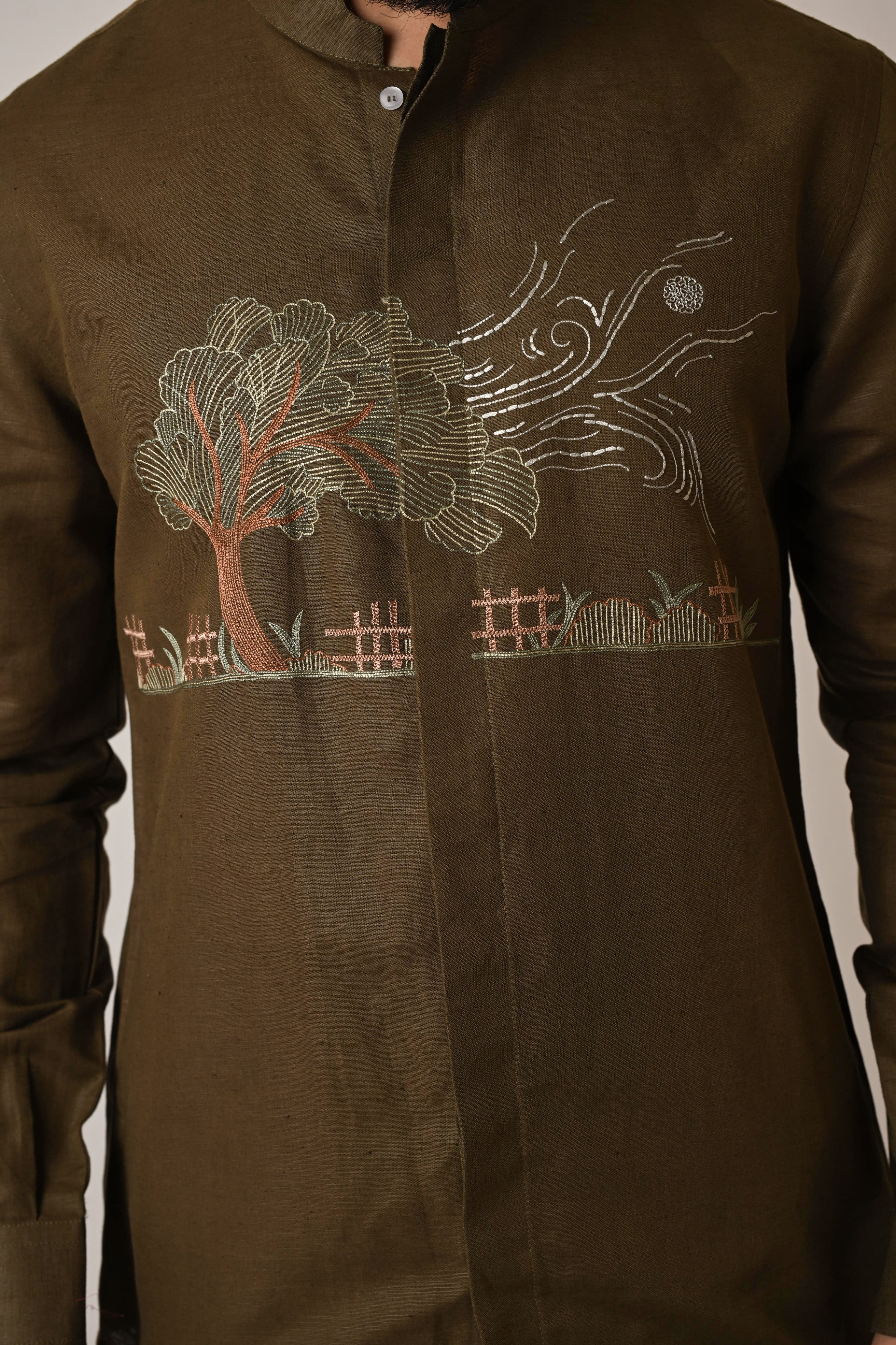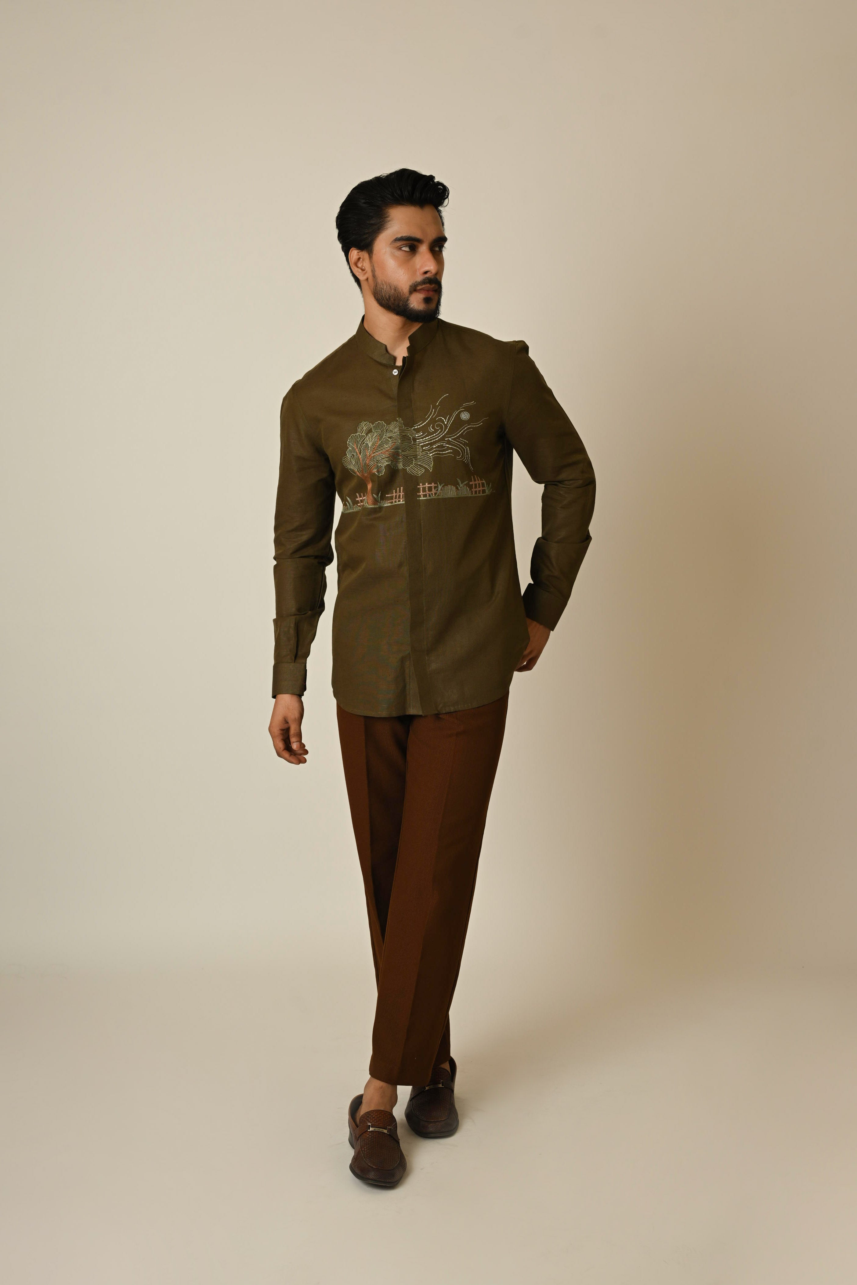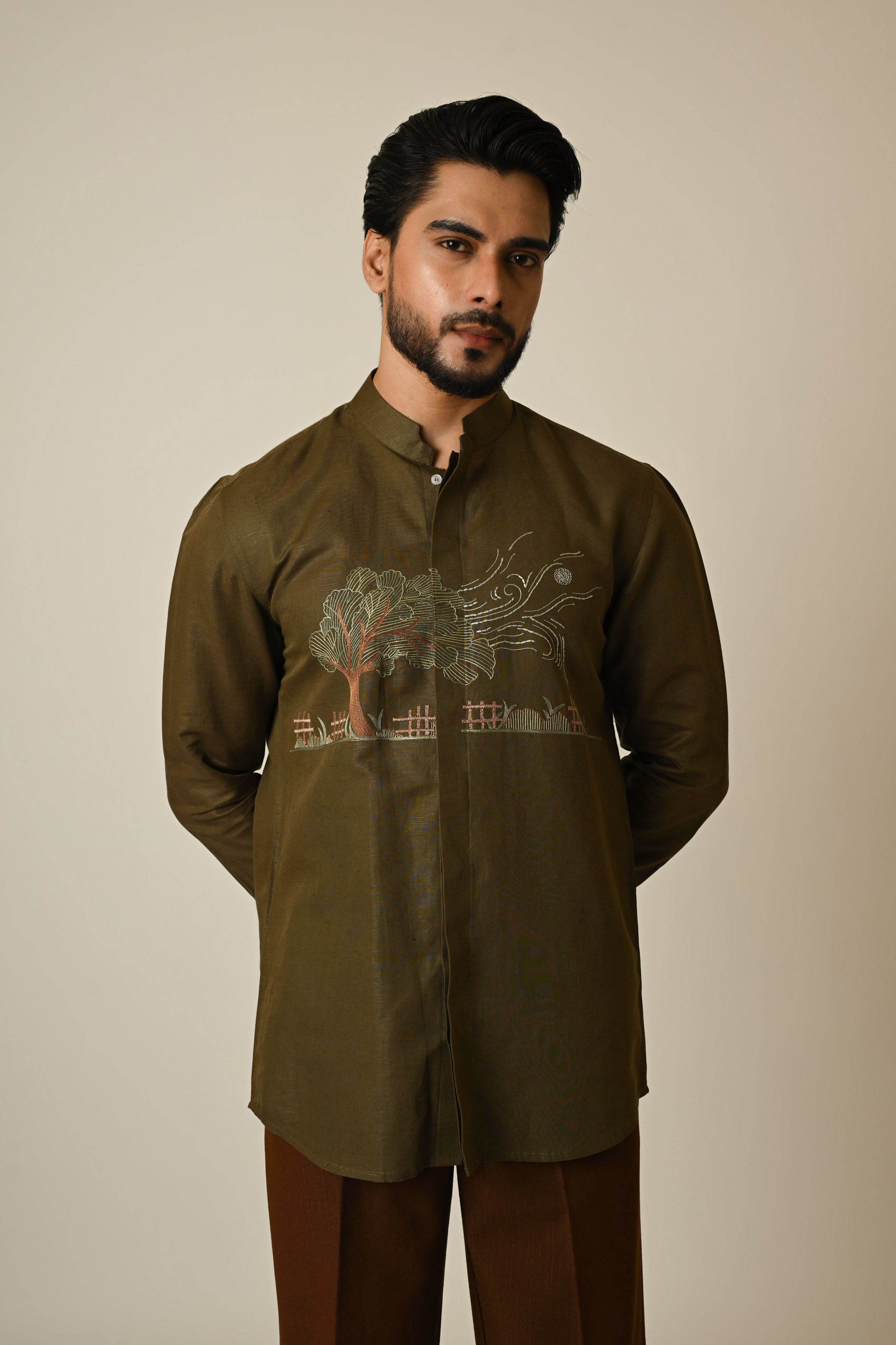 An olive green linen shirt with embroidery done on the chest area using subtle coloured threads depicting a breezy day with chinese collar.