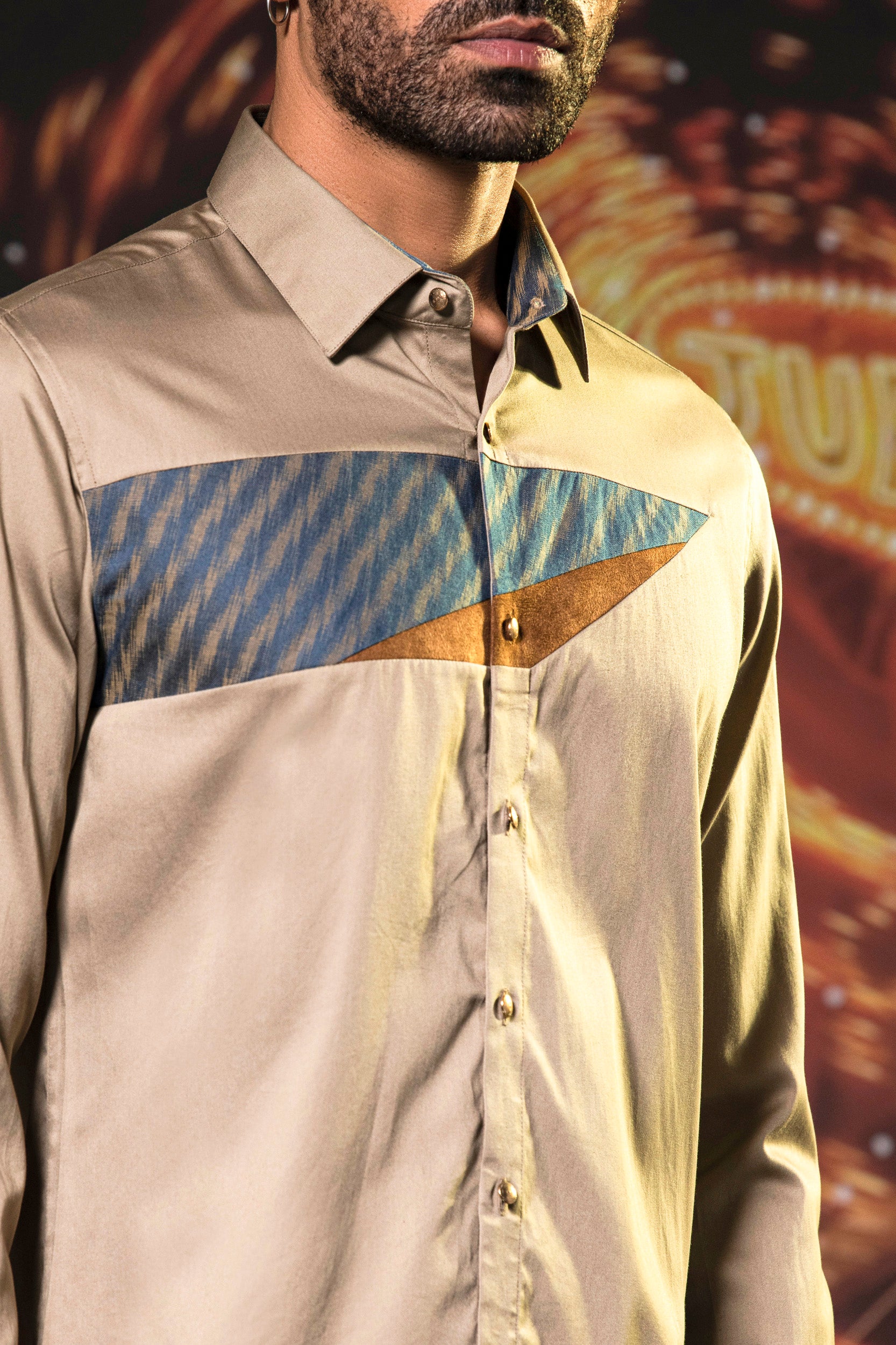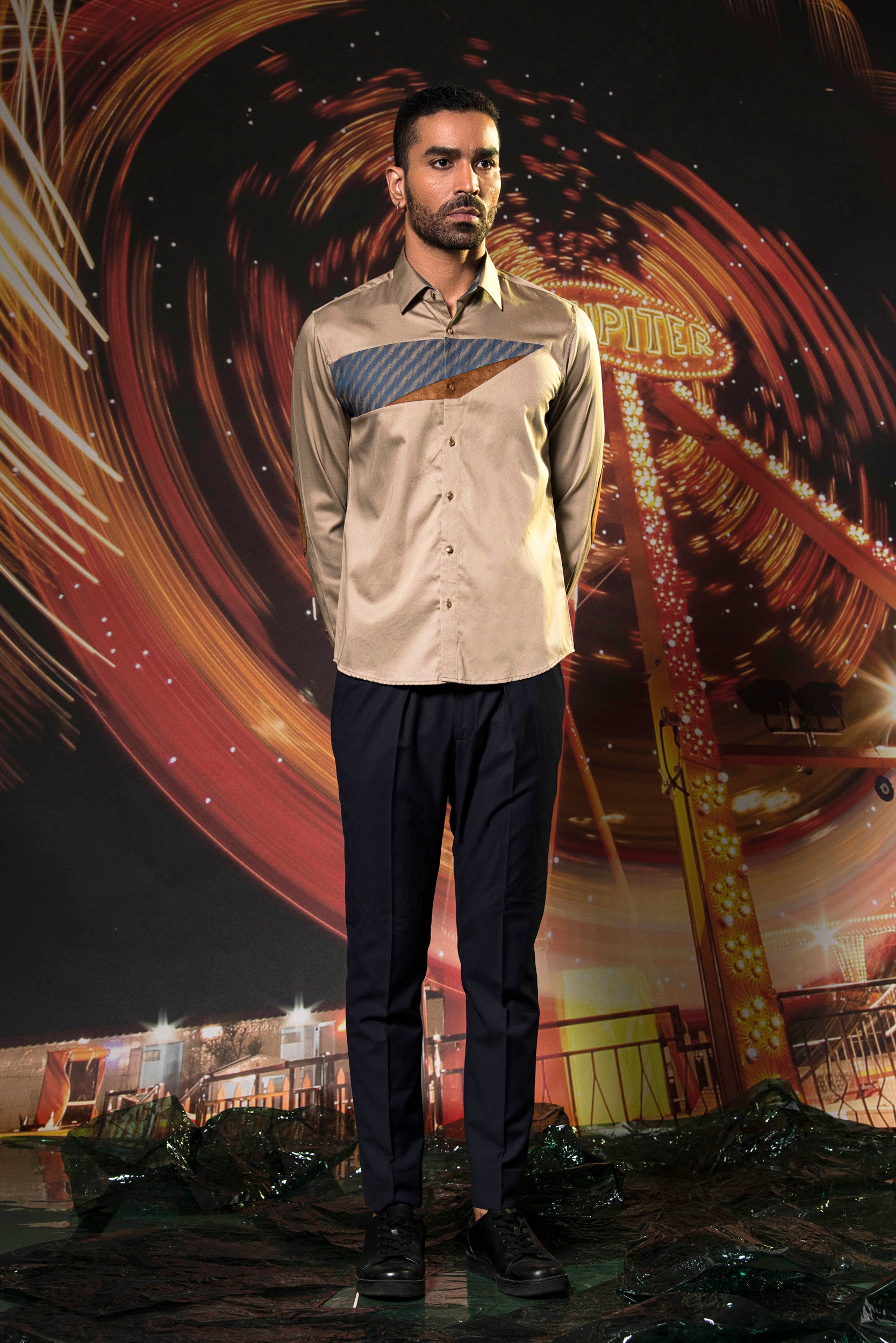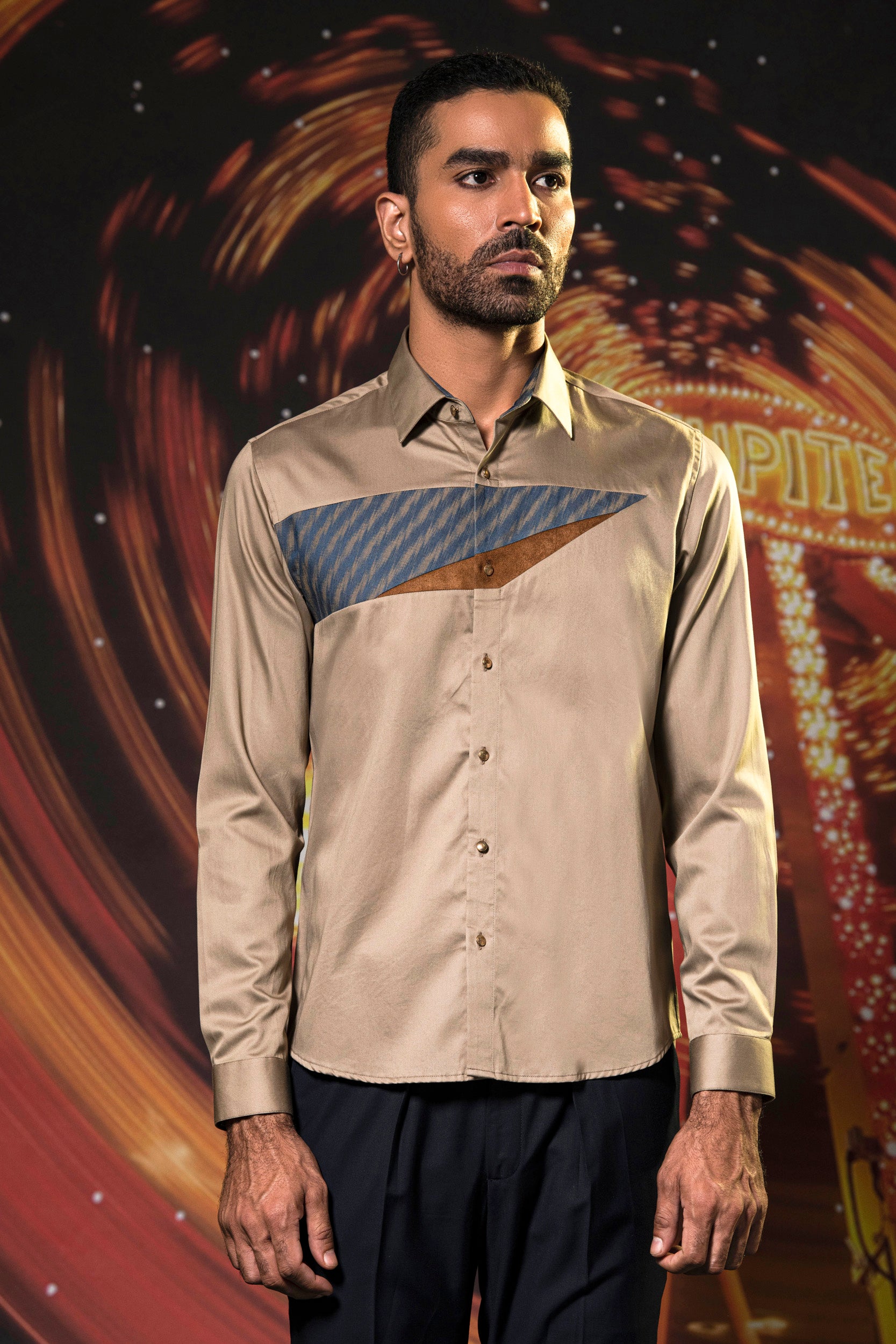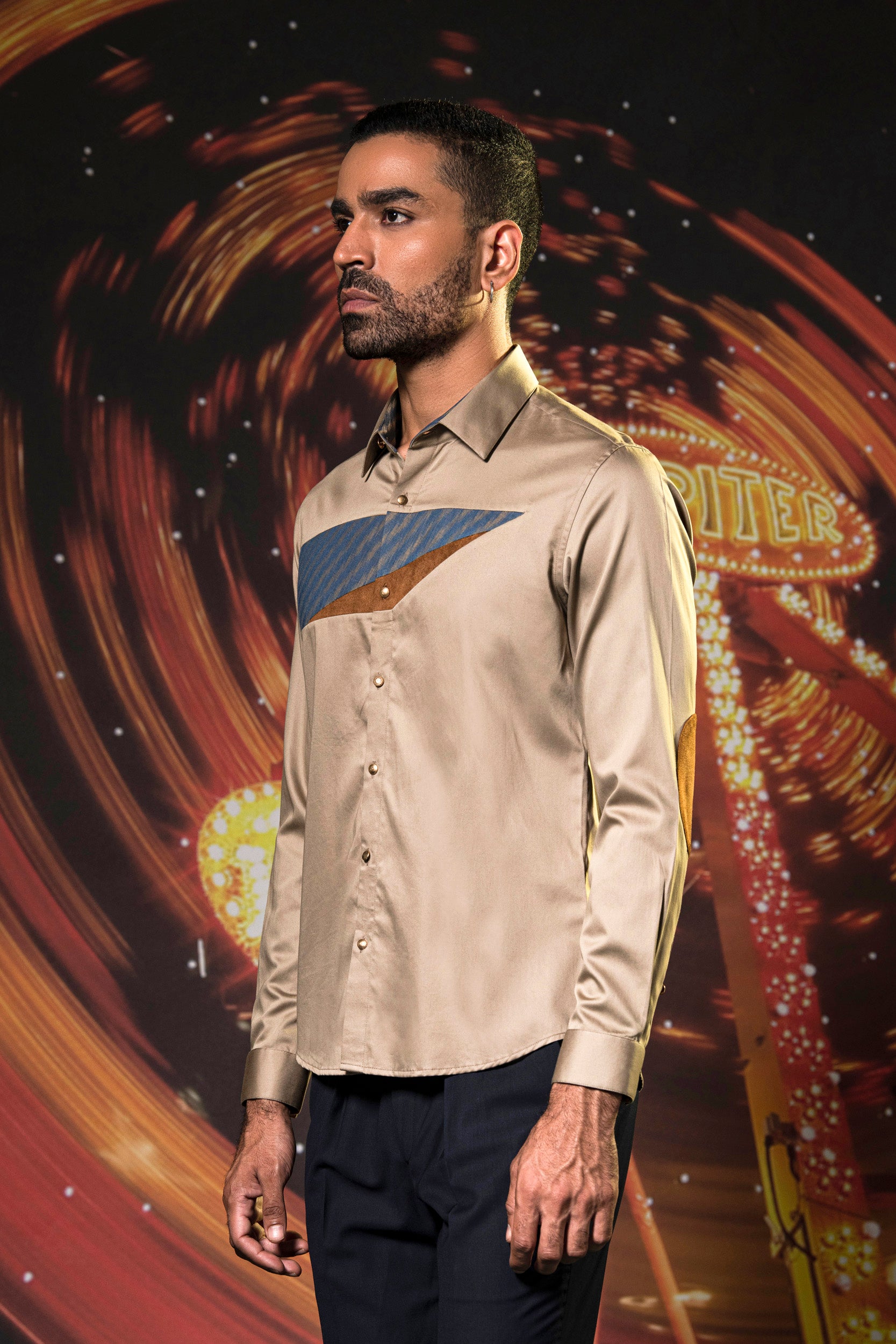 Featuring a brown shirt in cotton base with print and golden buttons detail. Perfect wear for parties and cocktail ceremonies.