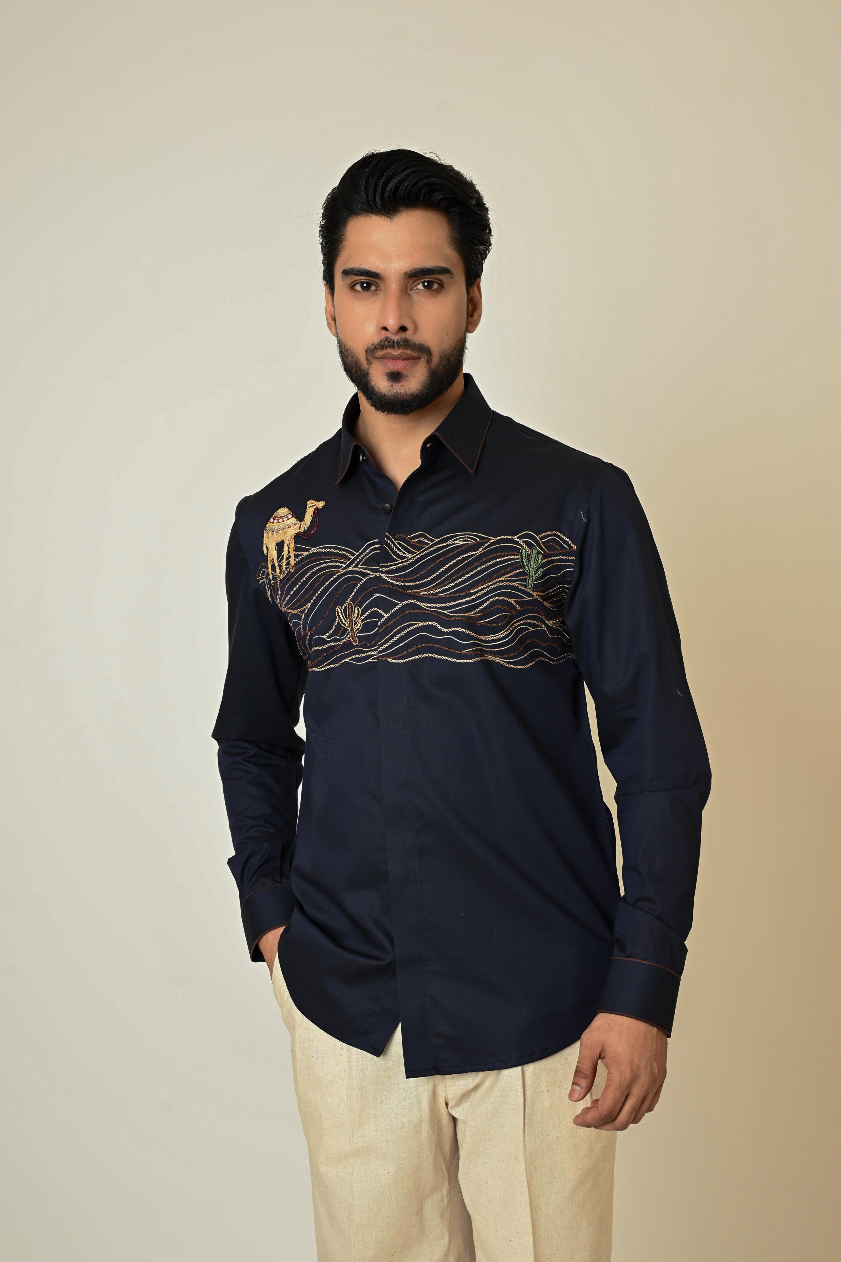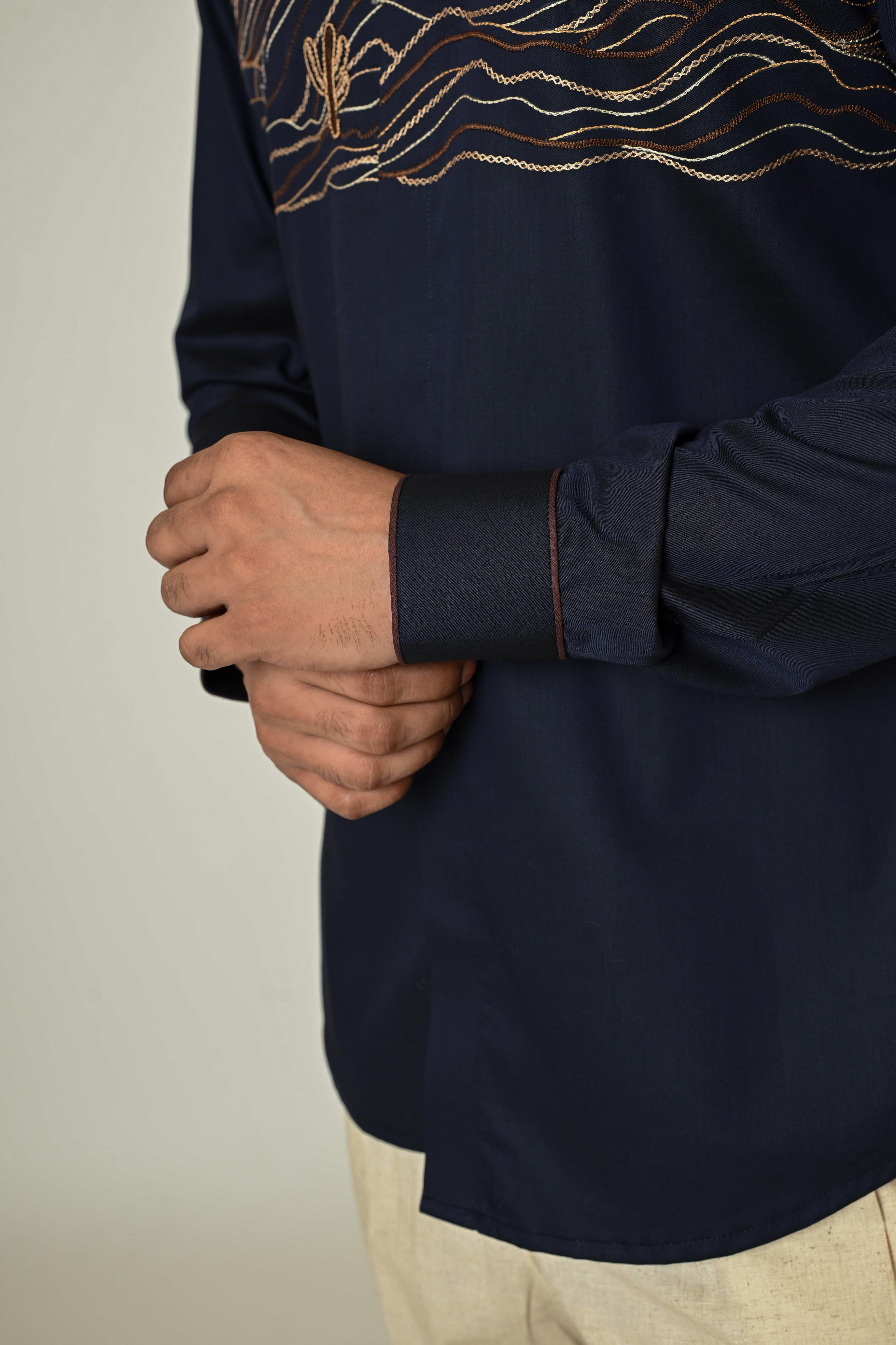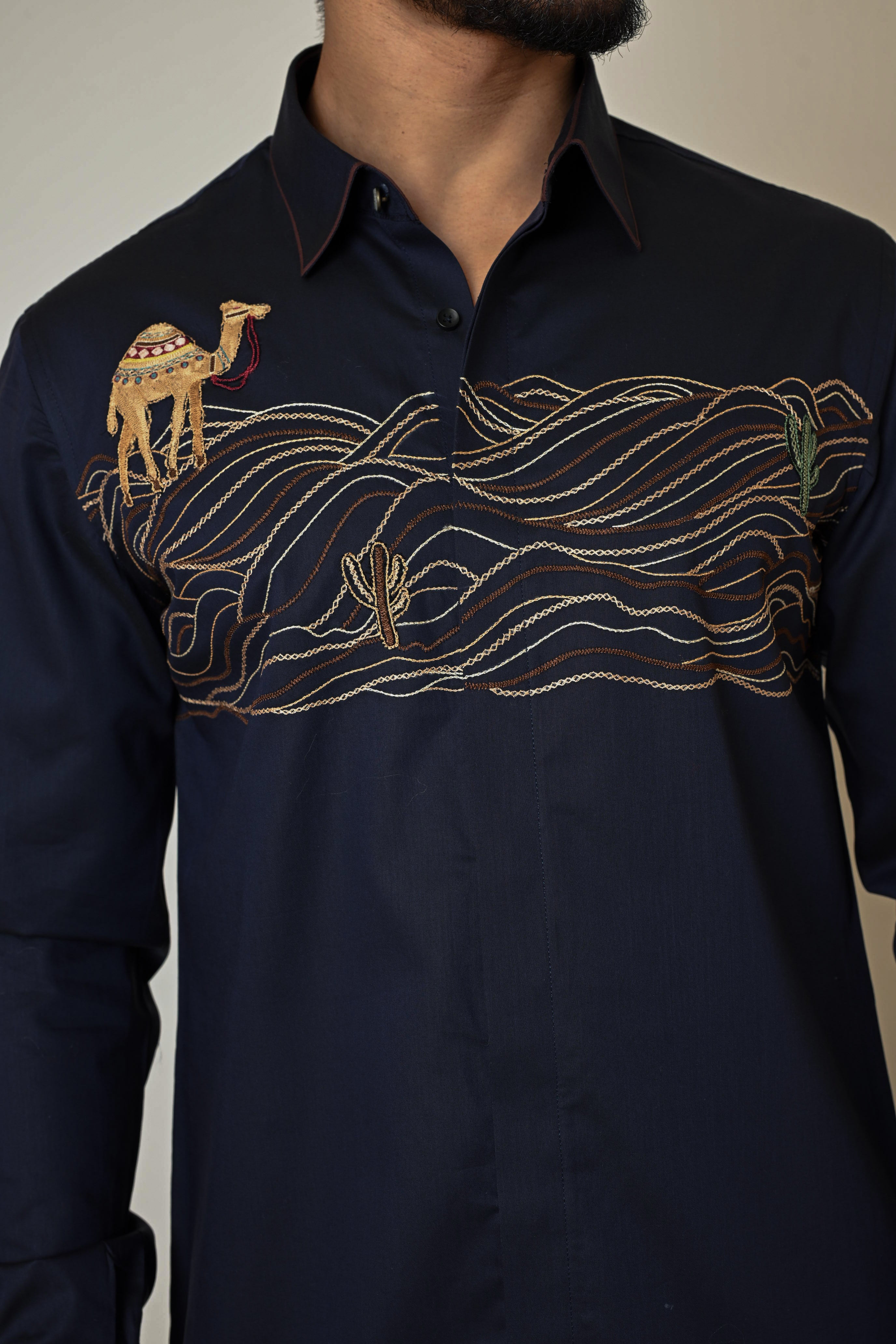 | A navy blue cotton shirt with intricate threadwork of complex techniques depicting sand dunes with warm thread tones |