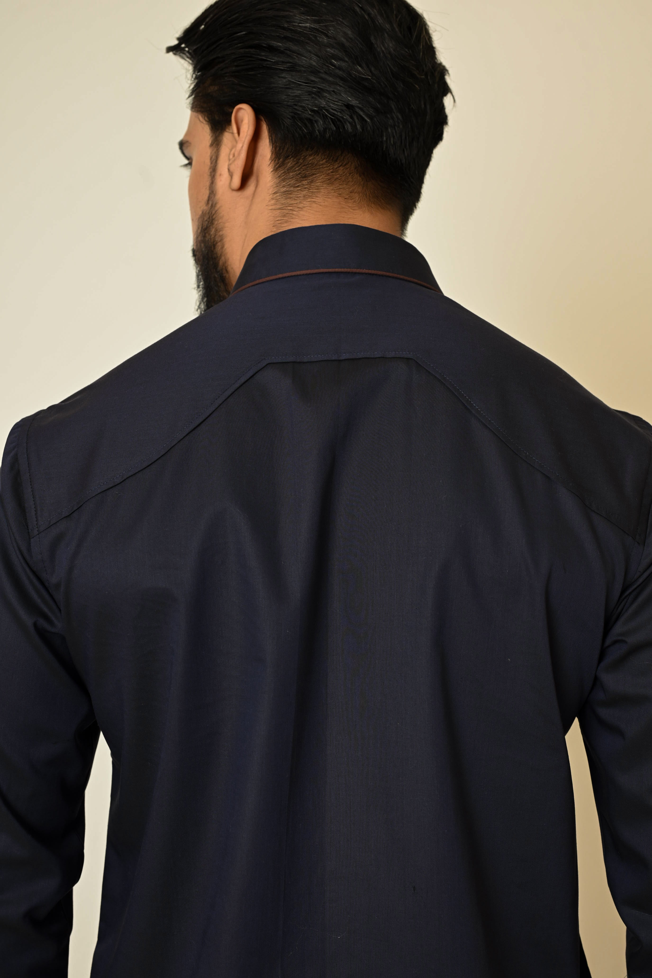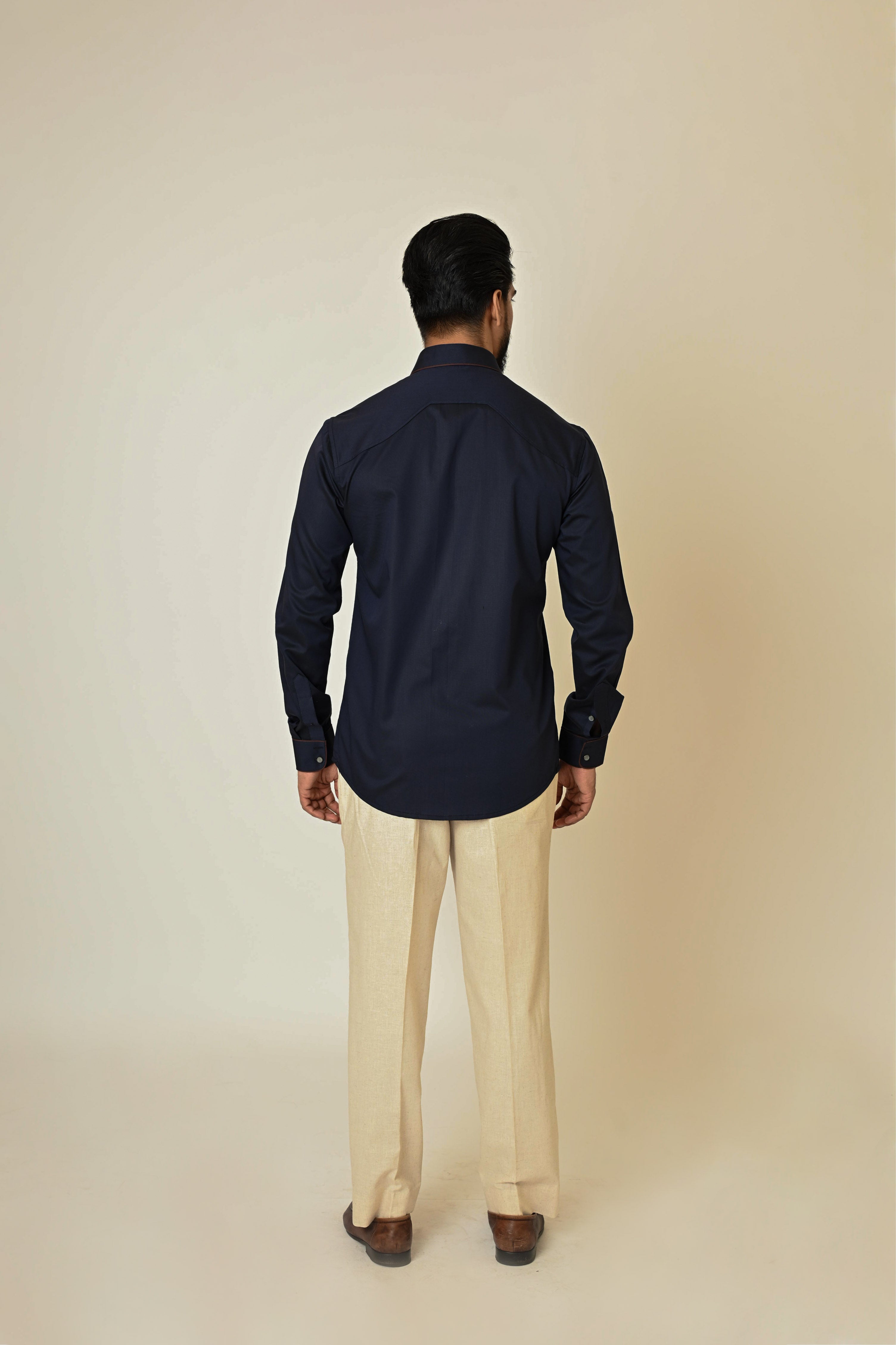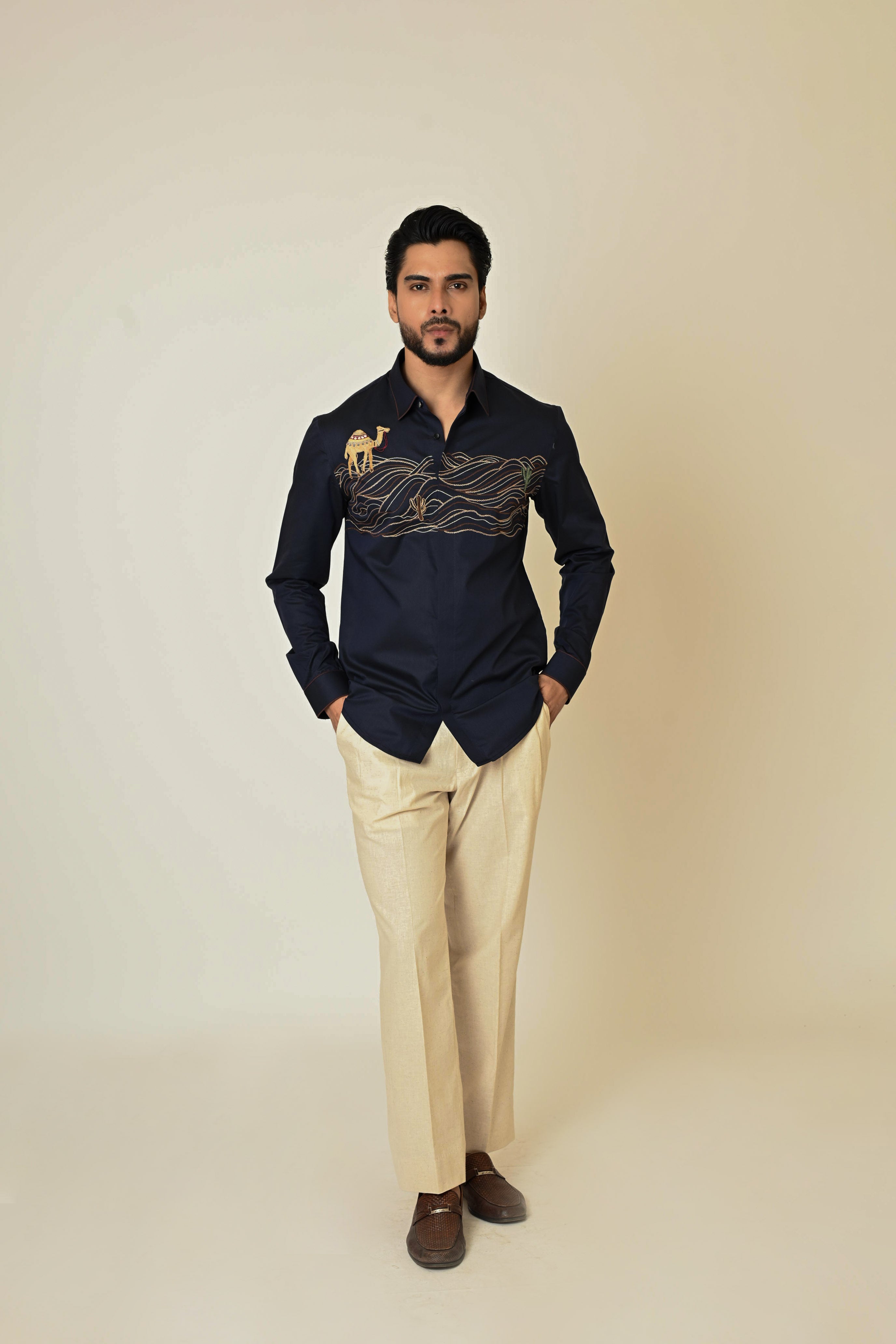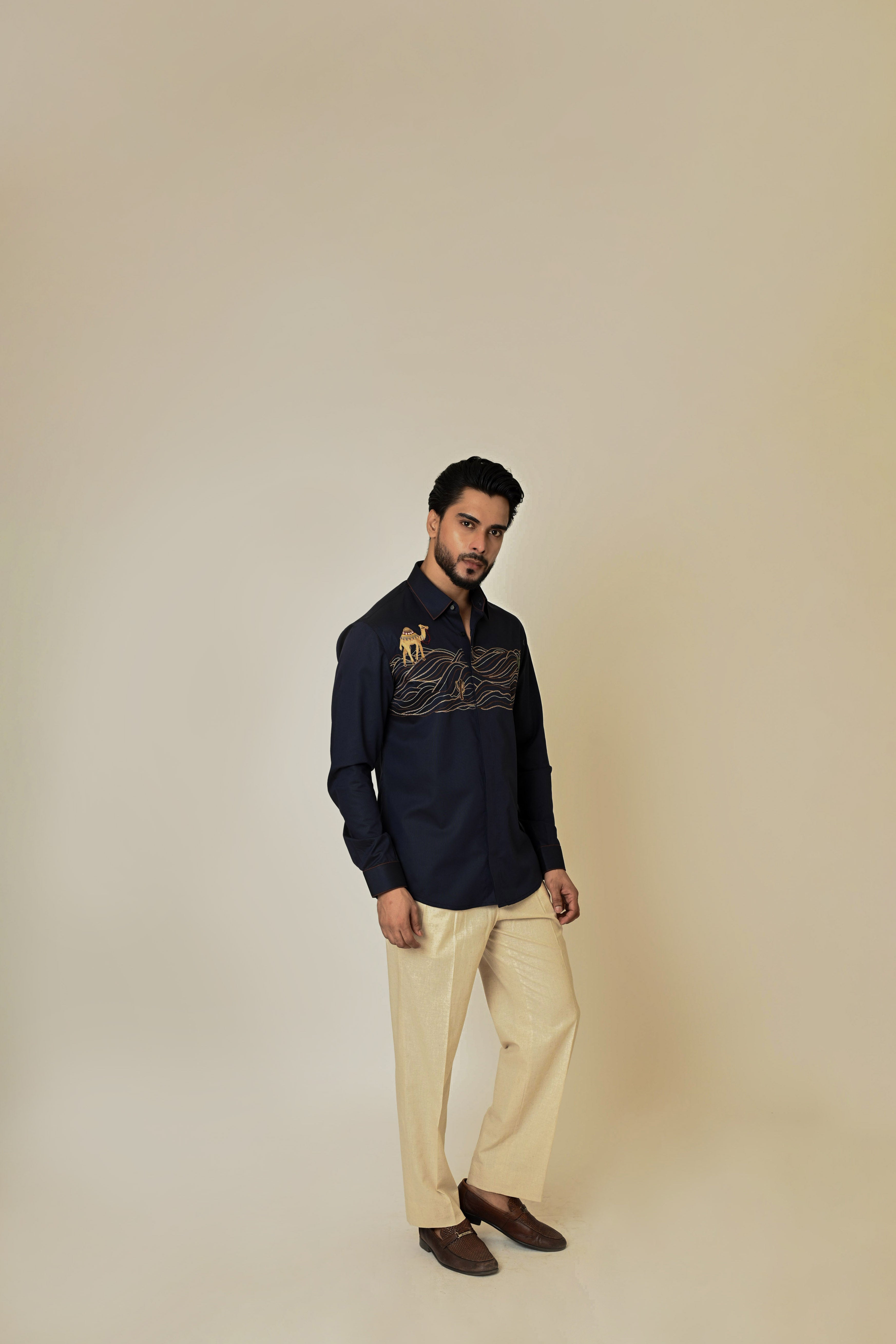 | A navy blue cotton shirt with intricate threadwork of complex techniques depicting sand dunes with warm thread tones |