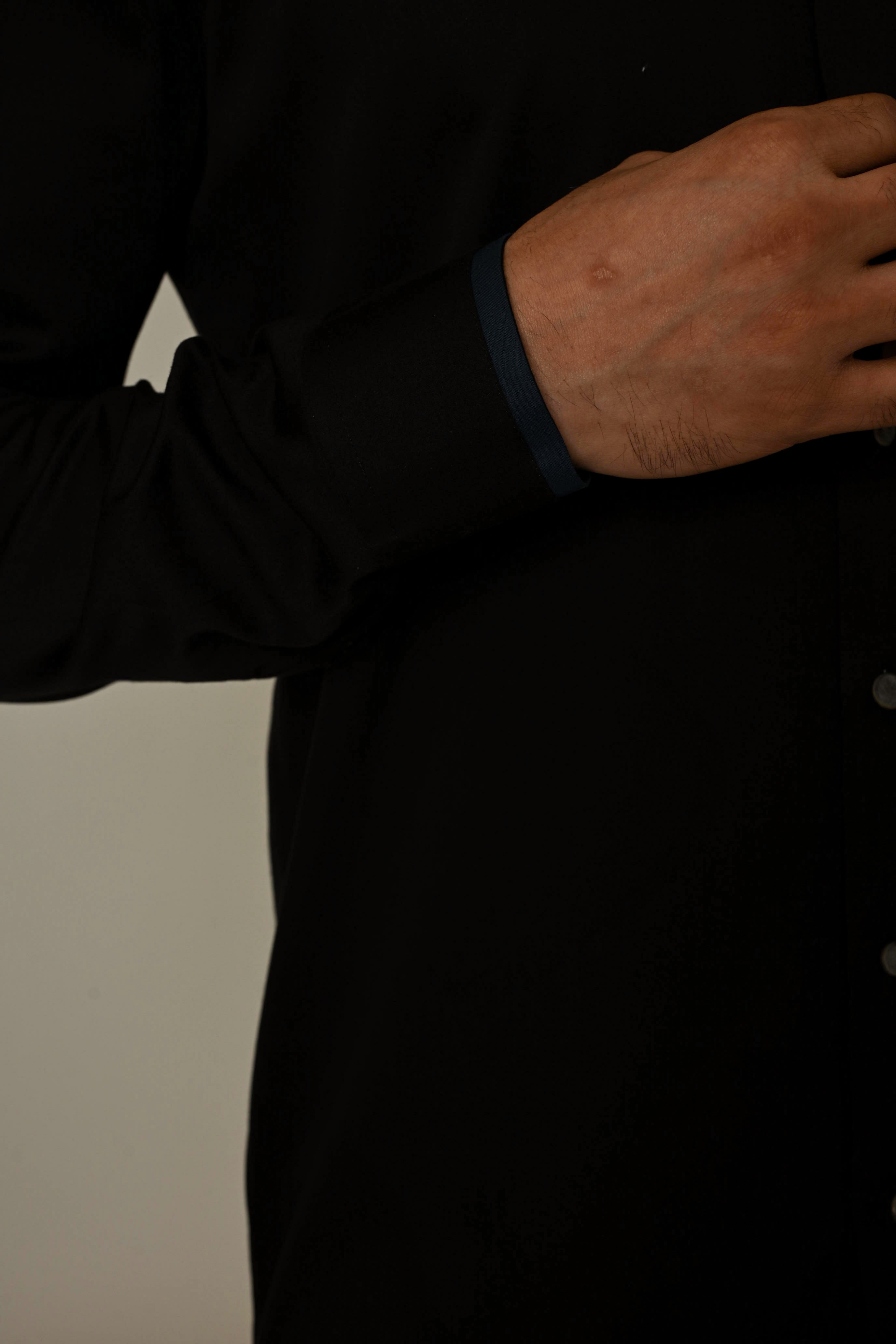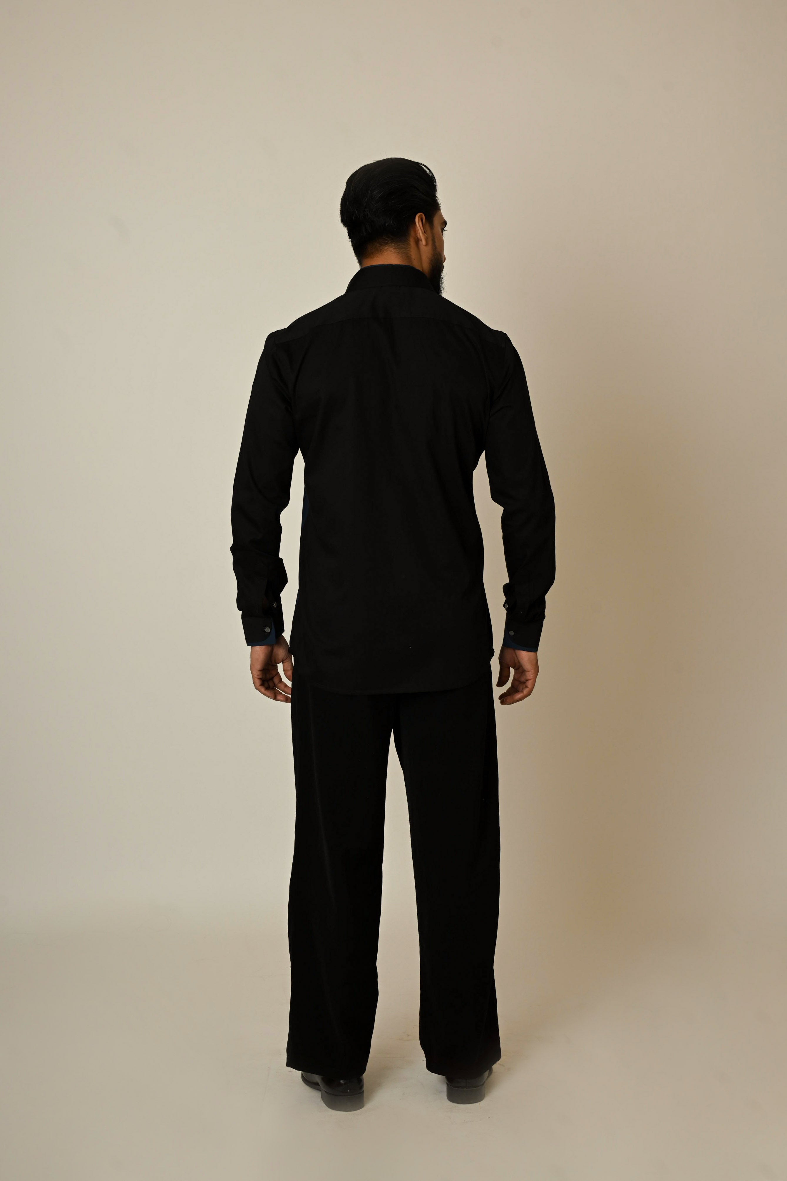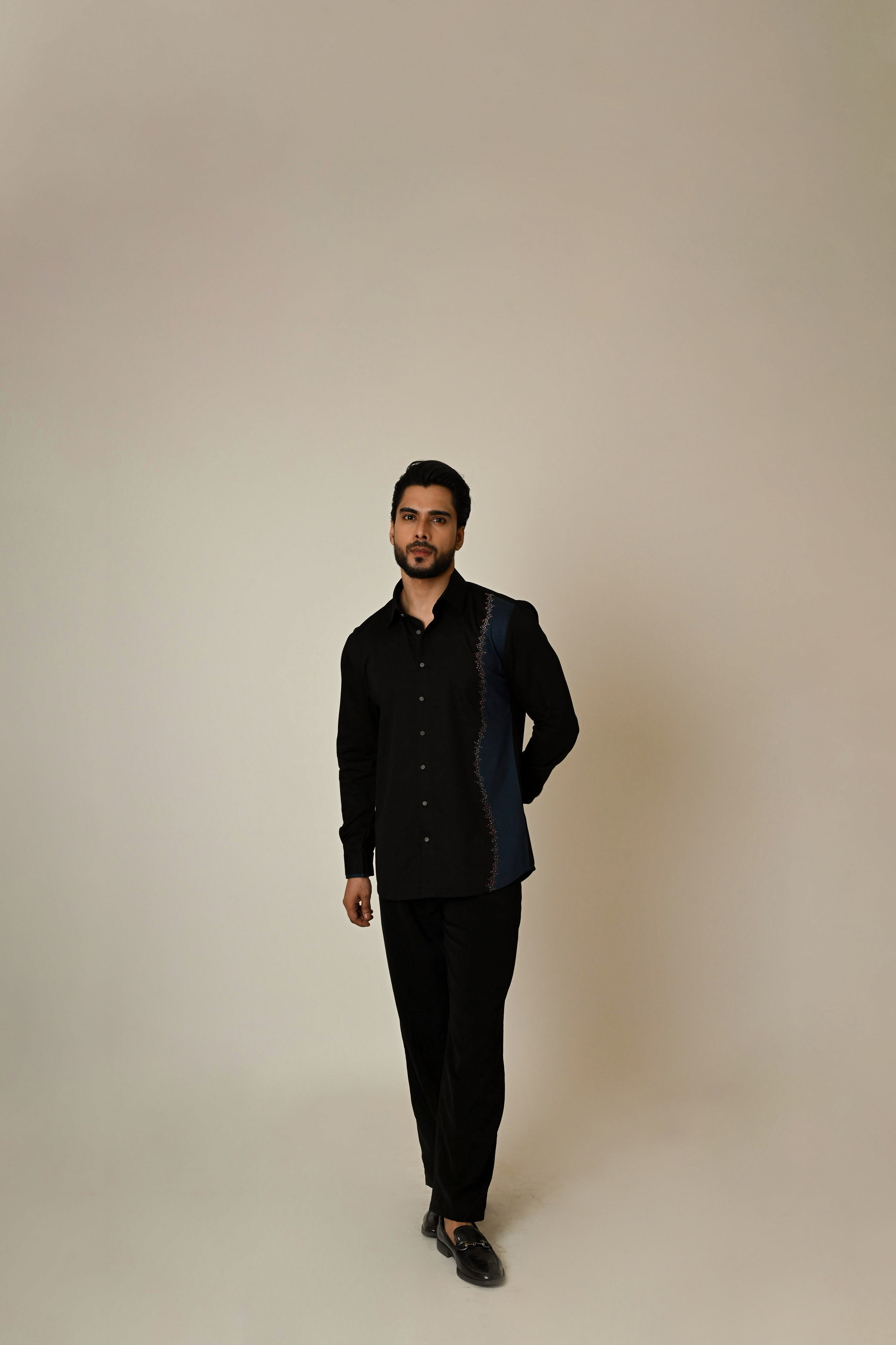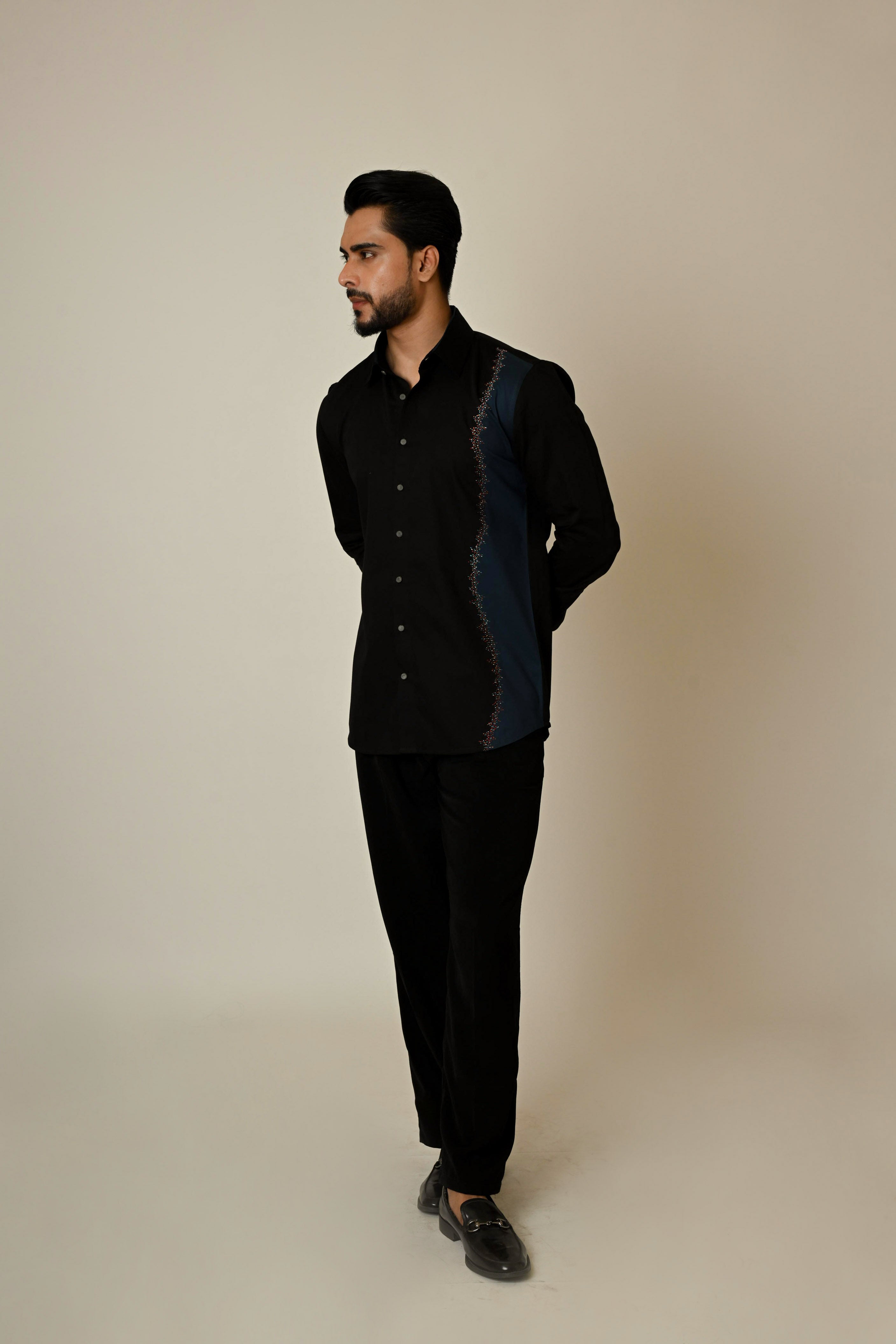 A black and teal colour blocked shirt with abstract threadwork of poppy colours to enhance the look and ornamented with mother of pearls buttons