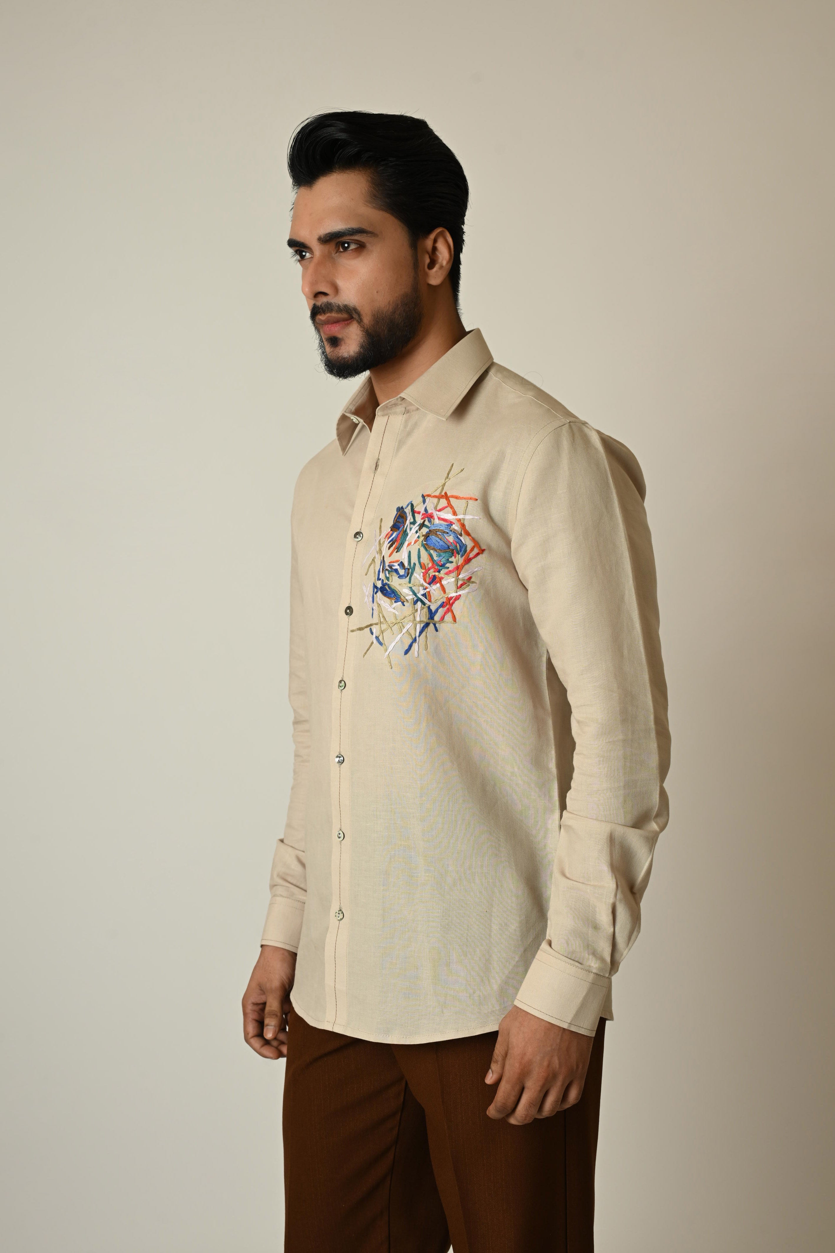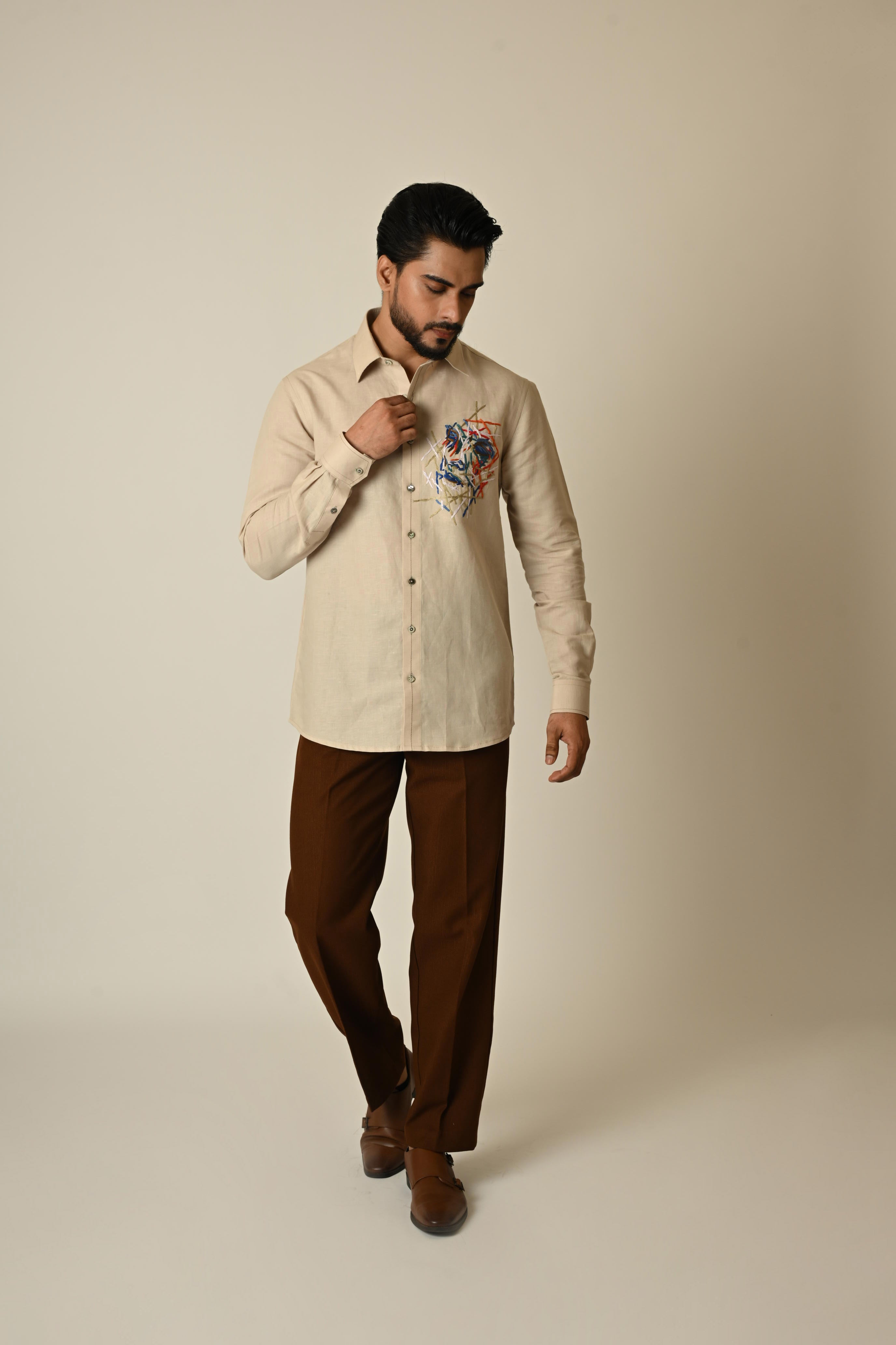 A beige linen shirt with abstract embroidery using anchor threads..
