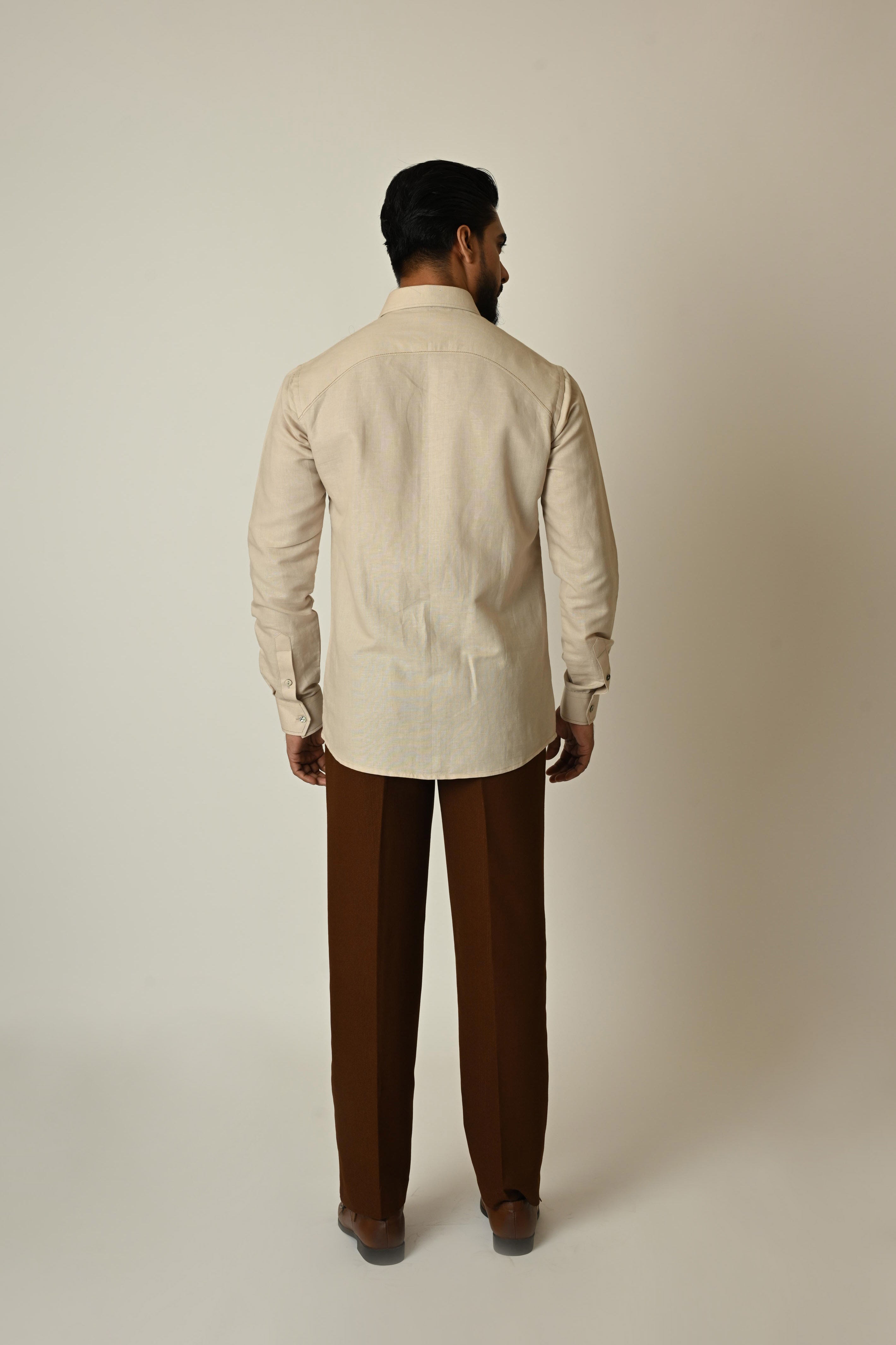 Beige is a versatile neutral color that pairs well with other earthy tones. Consider pairing your cross-hatching beige linen shirt with olive green, rust brown, or charcoal gray bottoms for a harmonious look.