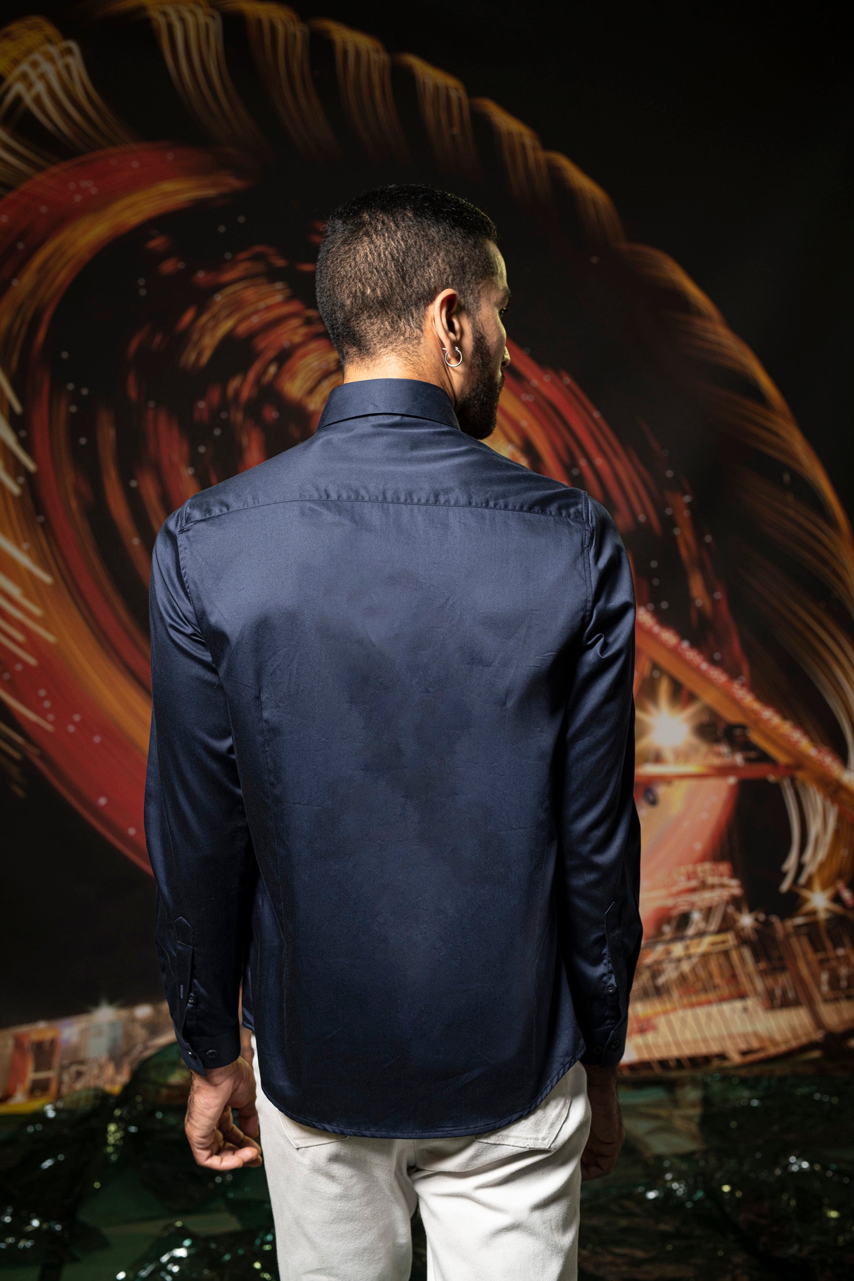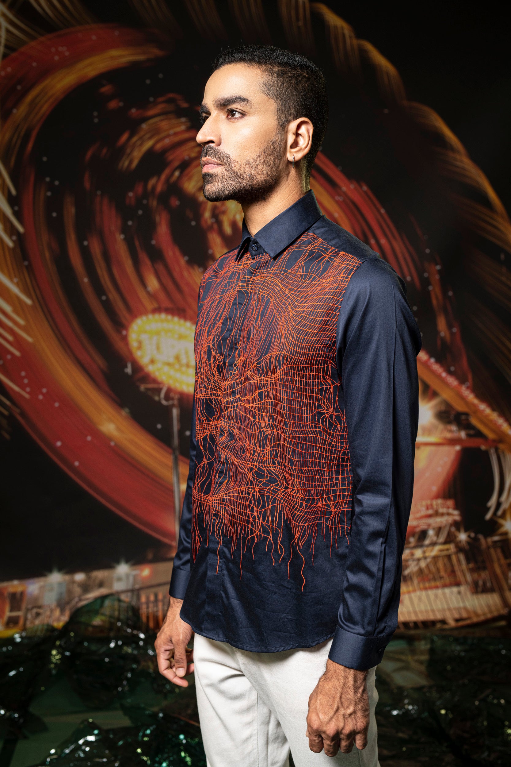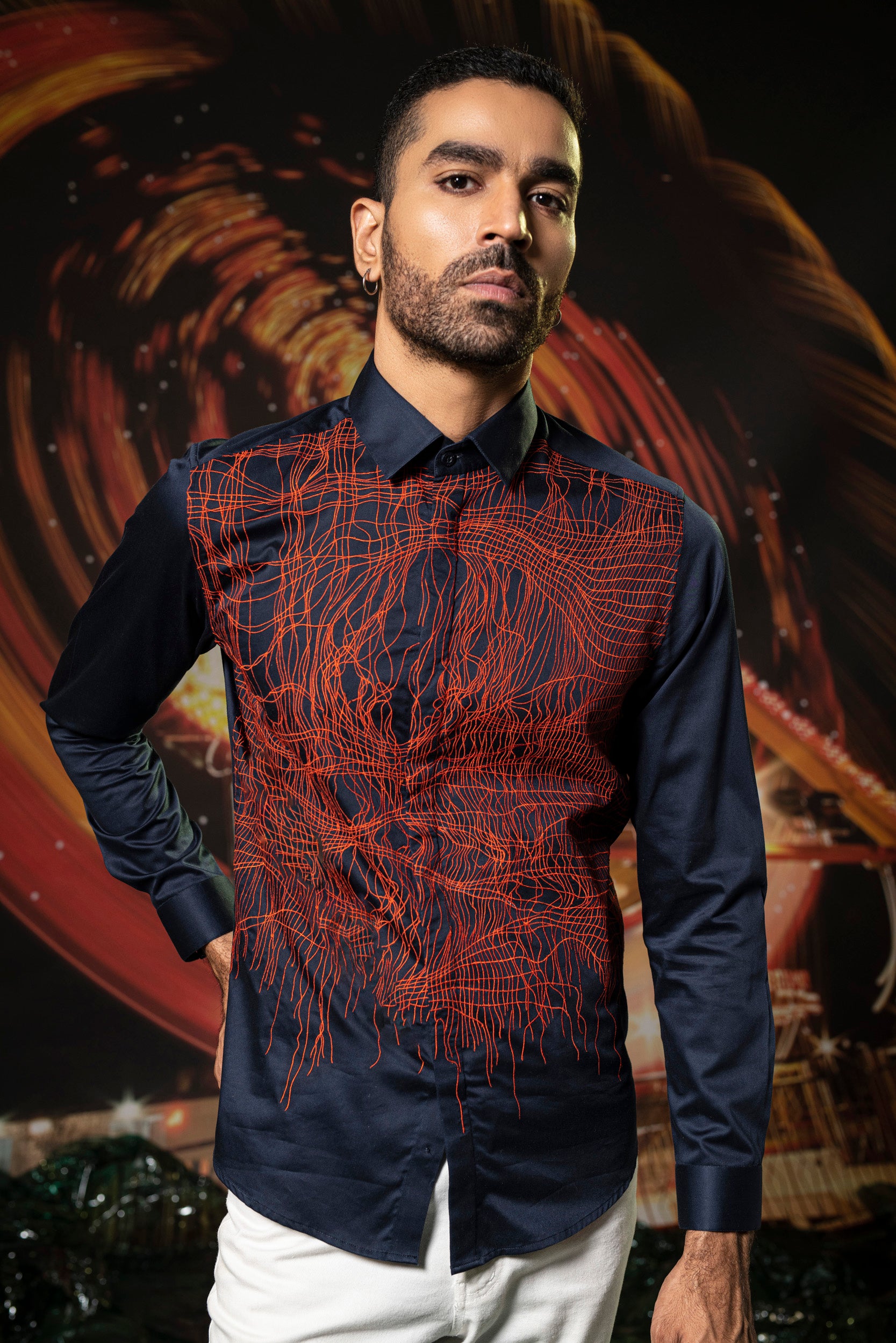 Featuring a deep navy shirt in cotton base with concealed plackets and embroidery. Perfect wear for parties and cocktail ceremonies.