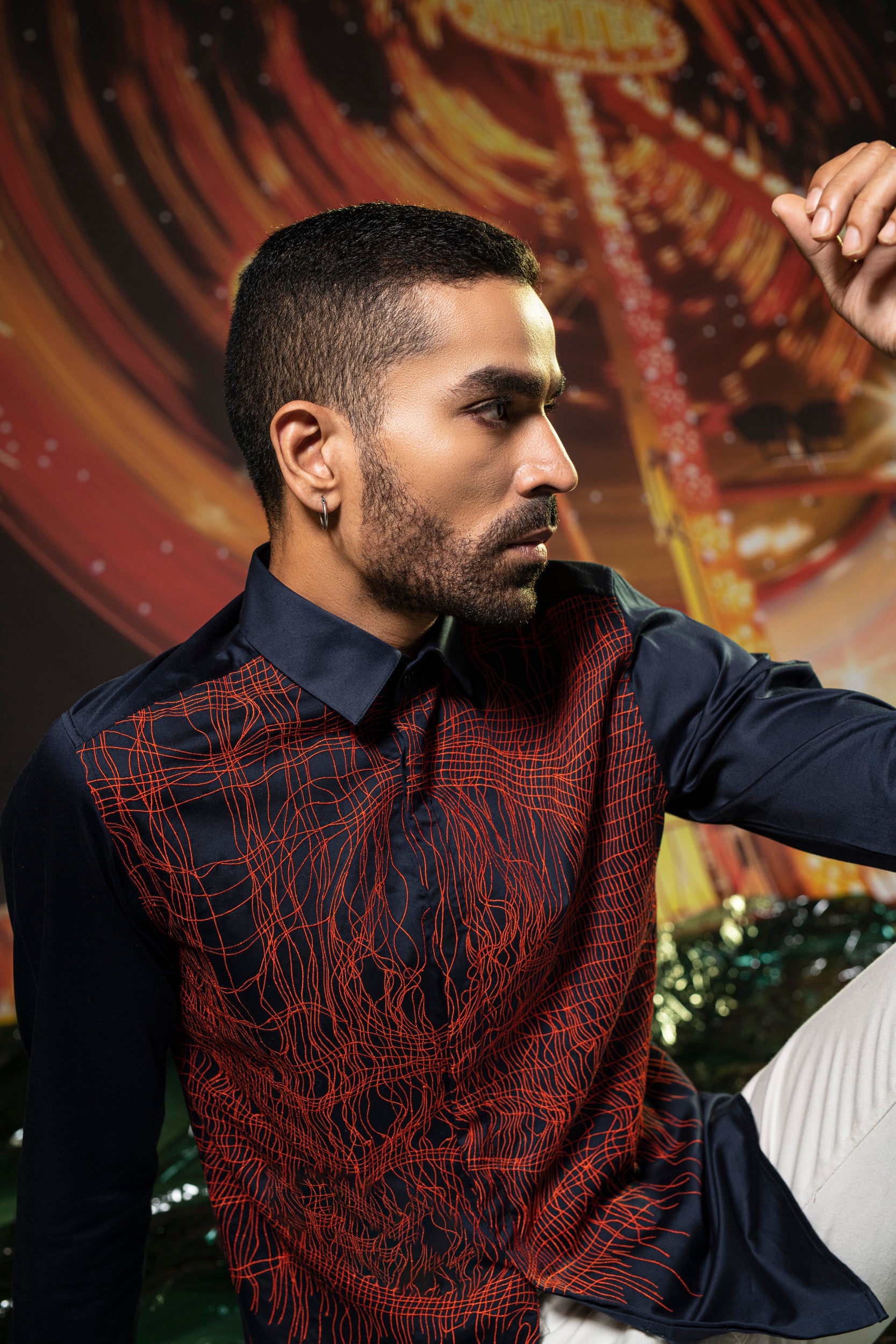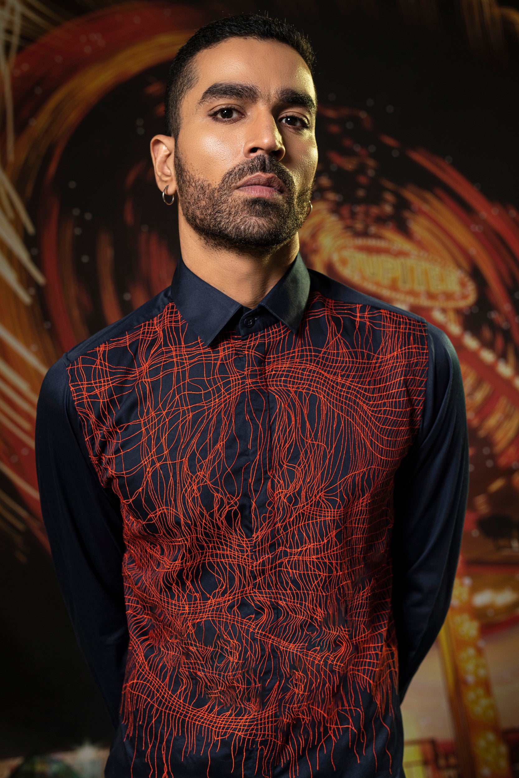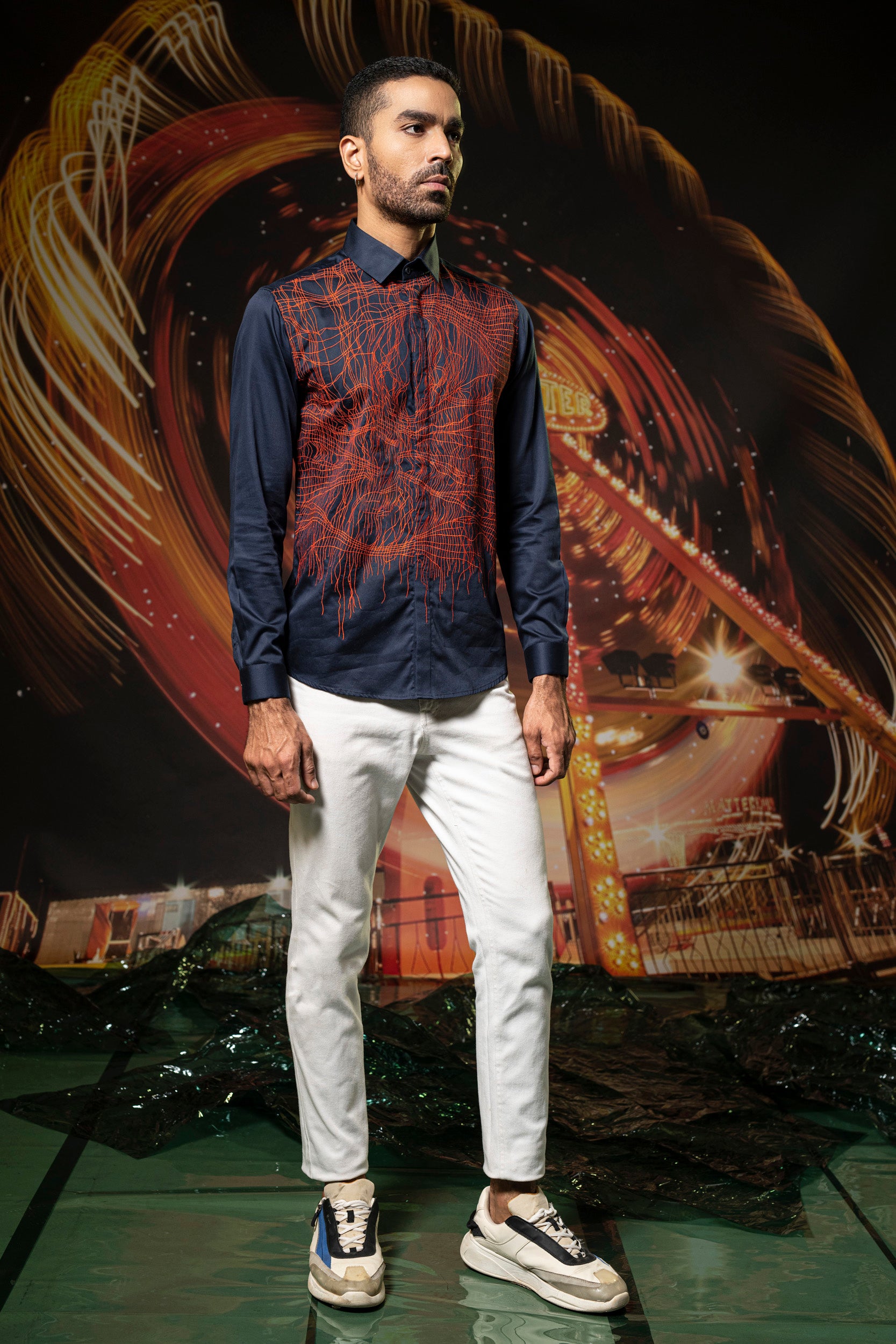 Featuring a deep navy shirt in cotton base with concealed plackets and embroidery. Perfect wear for parties and cocktail ceremonies.