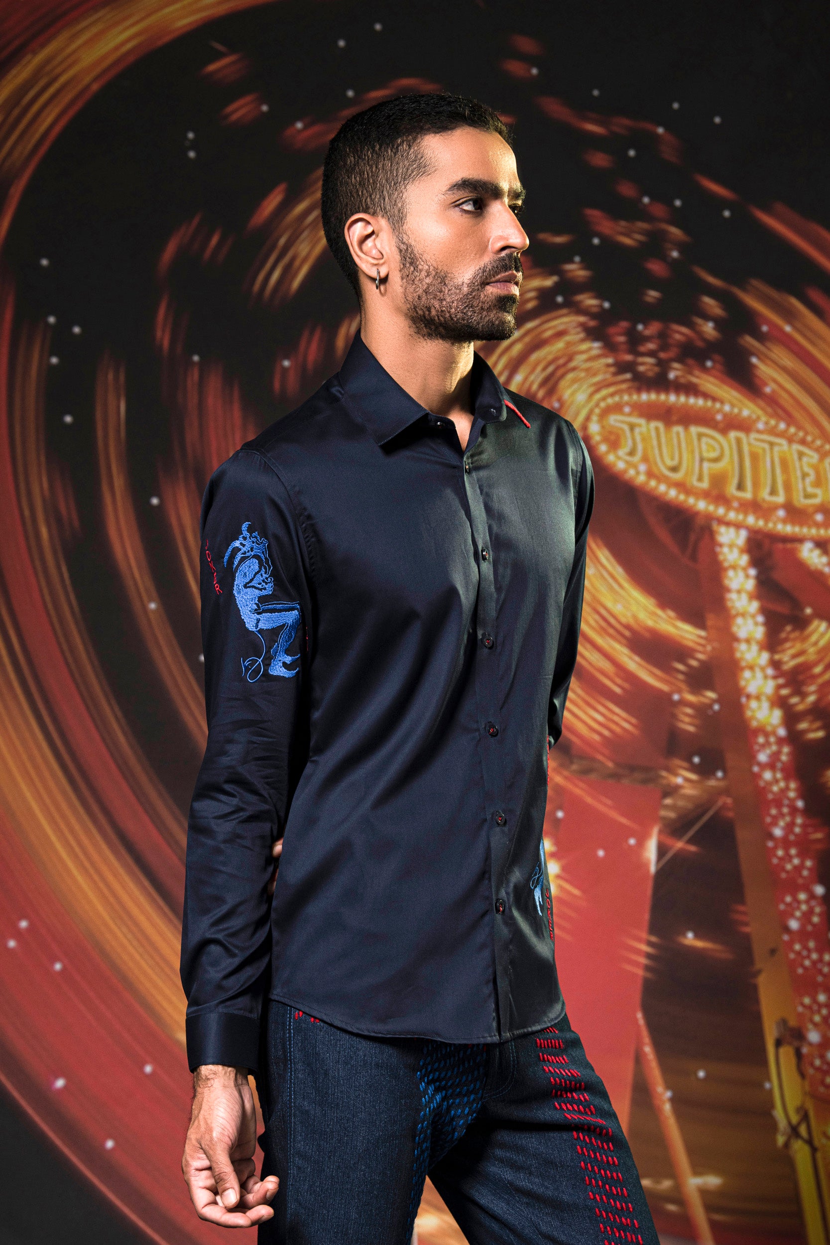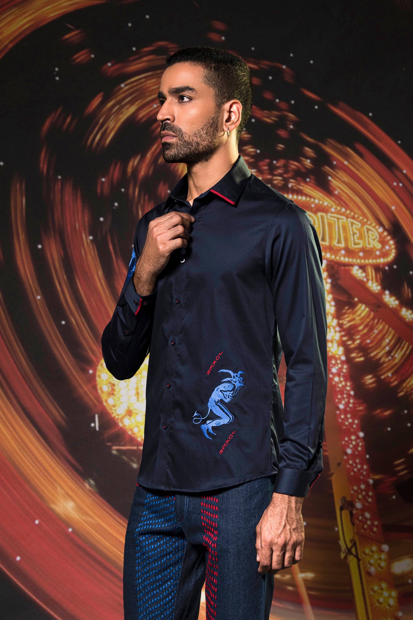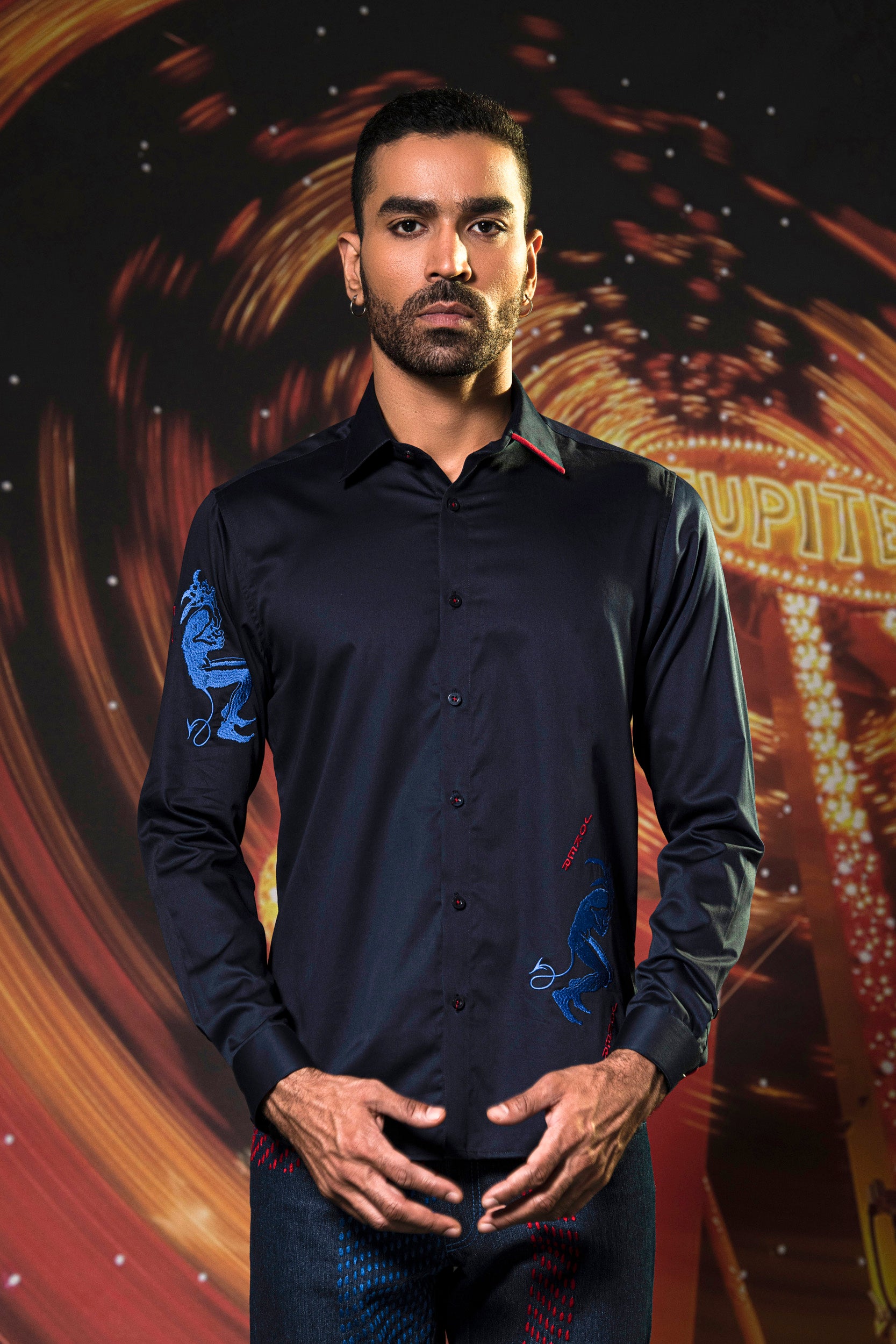 Featuring a deep navy shirt in cotton base with motif embroidery. Perfect wear for parties and cocktail ceremonies.