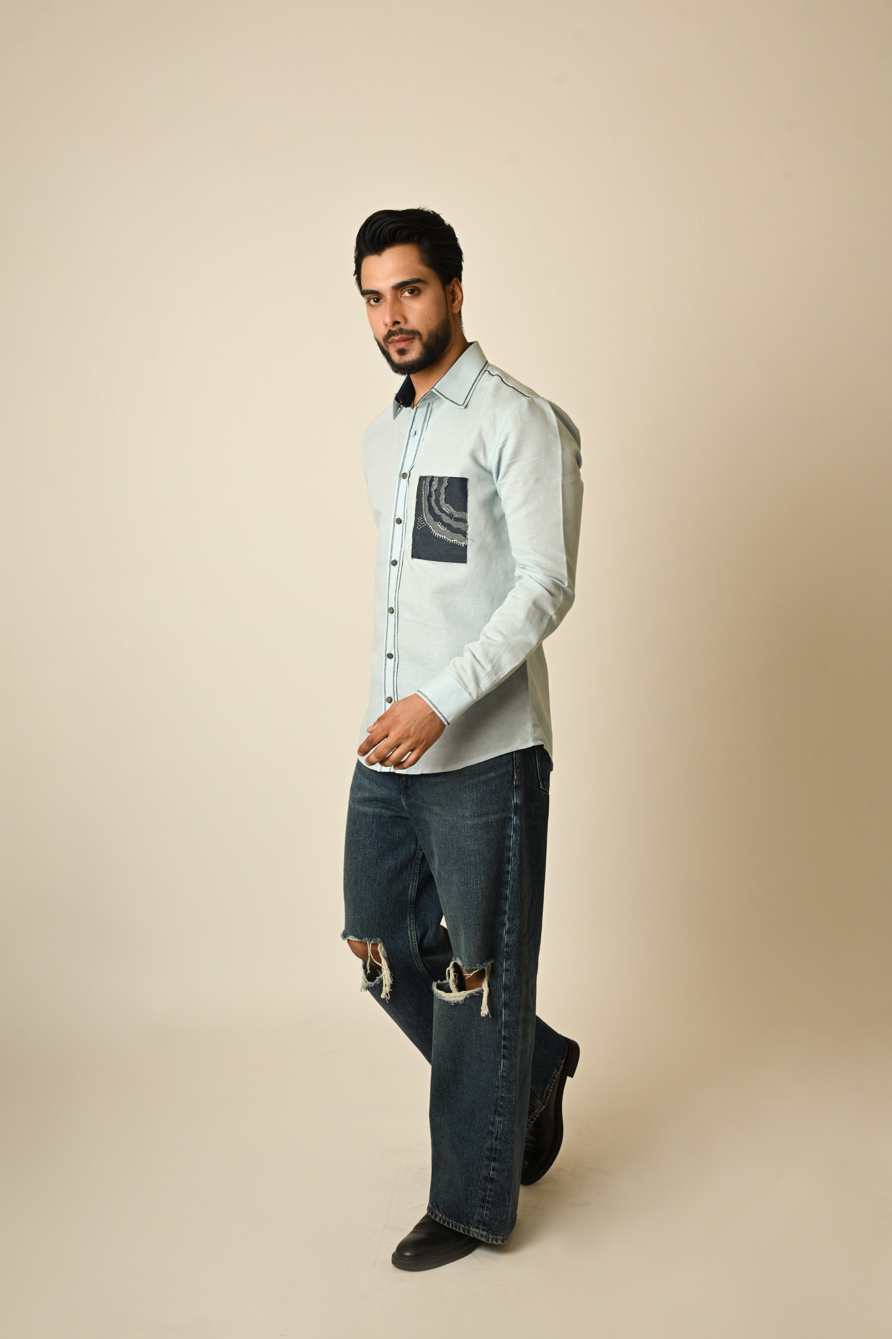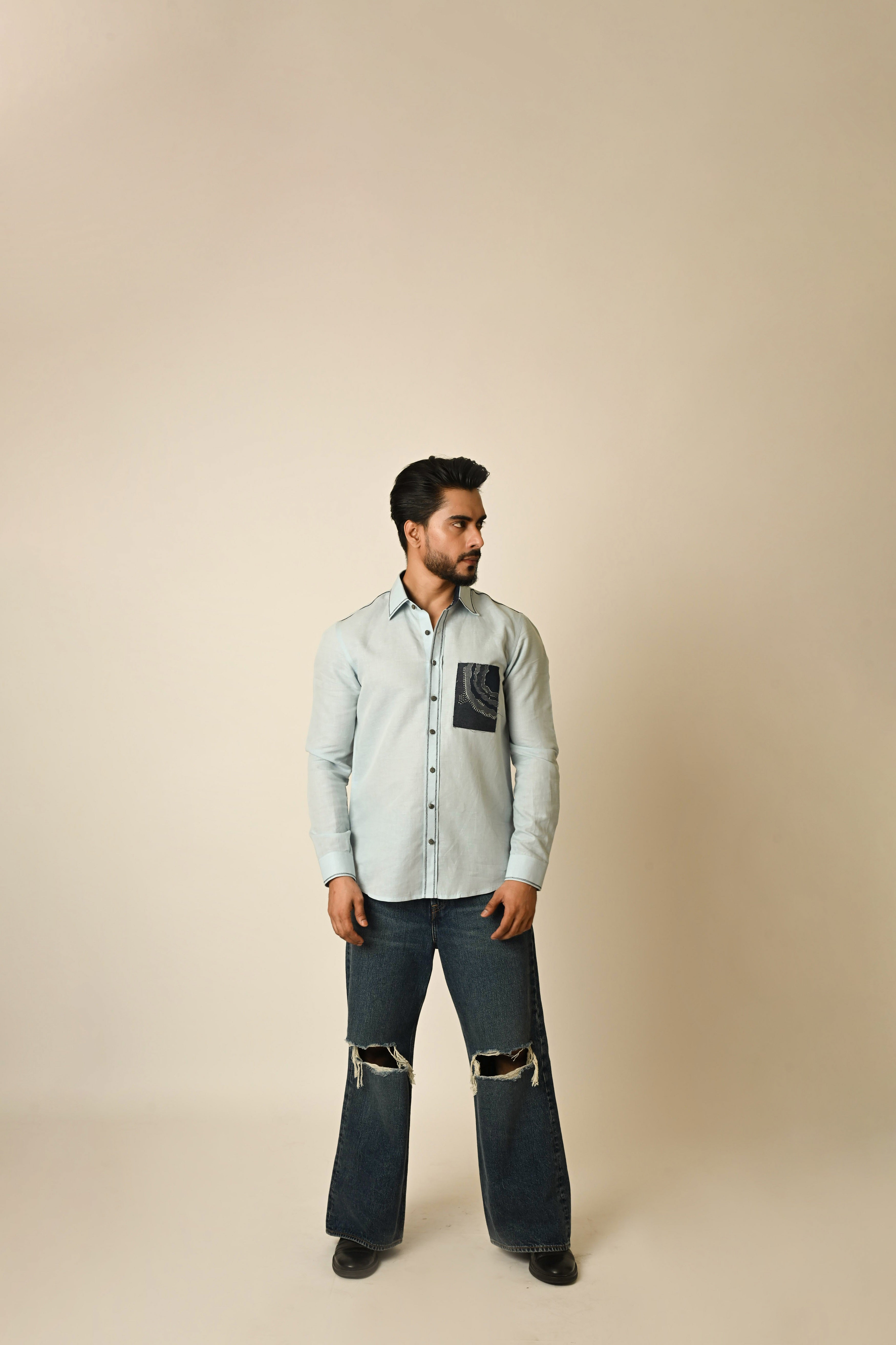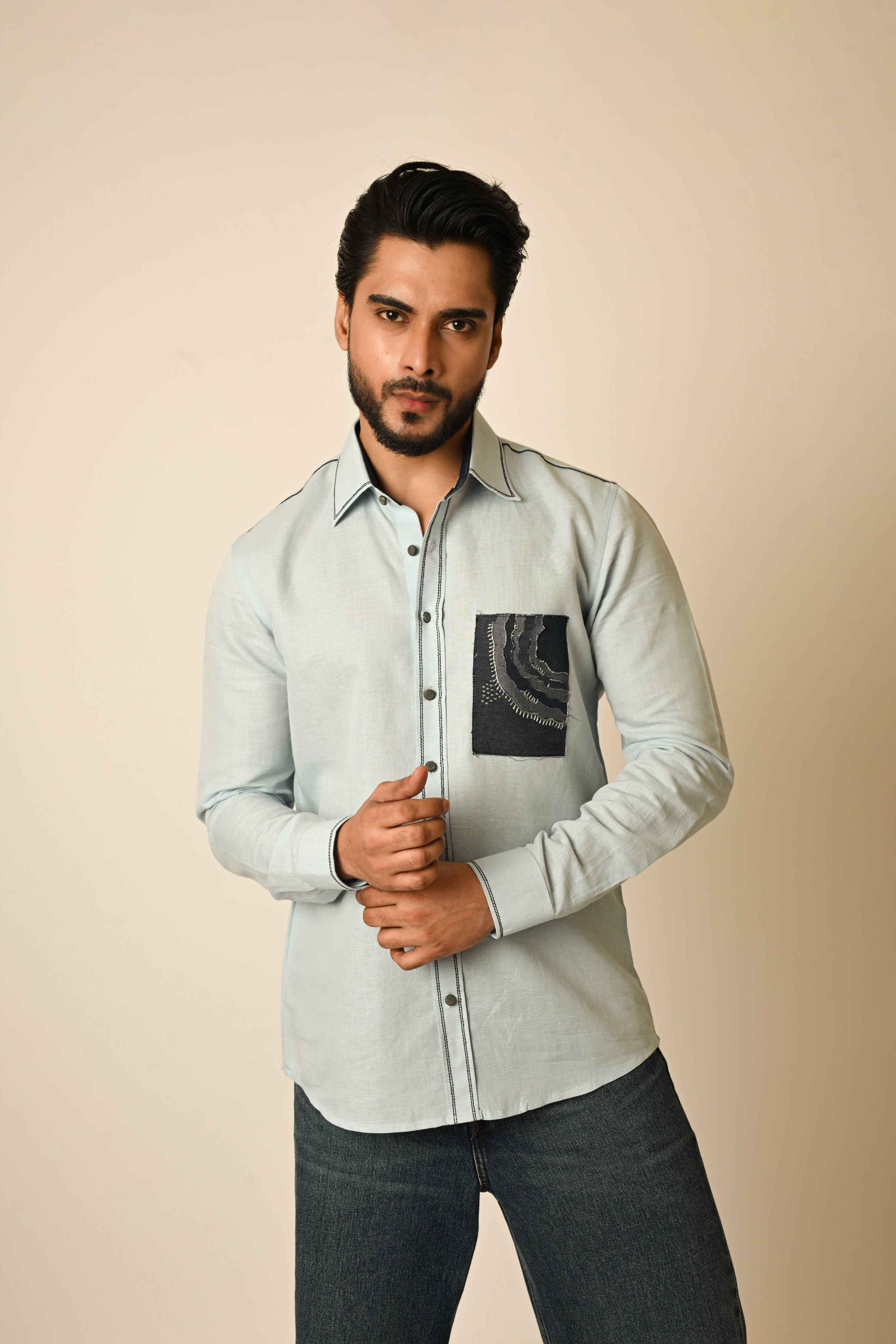 A powder blue linen shirt with chest pocket detail using fabric manipulation technique showing the depth of something along with minimal thread highlights