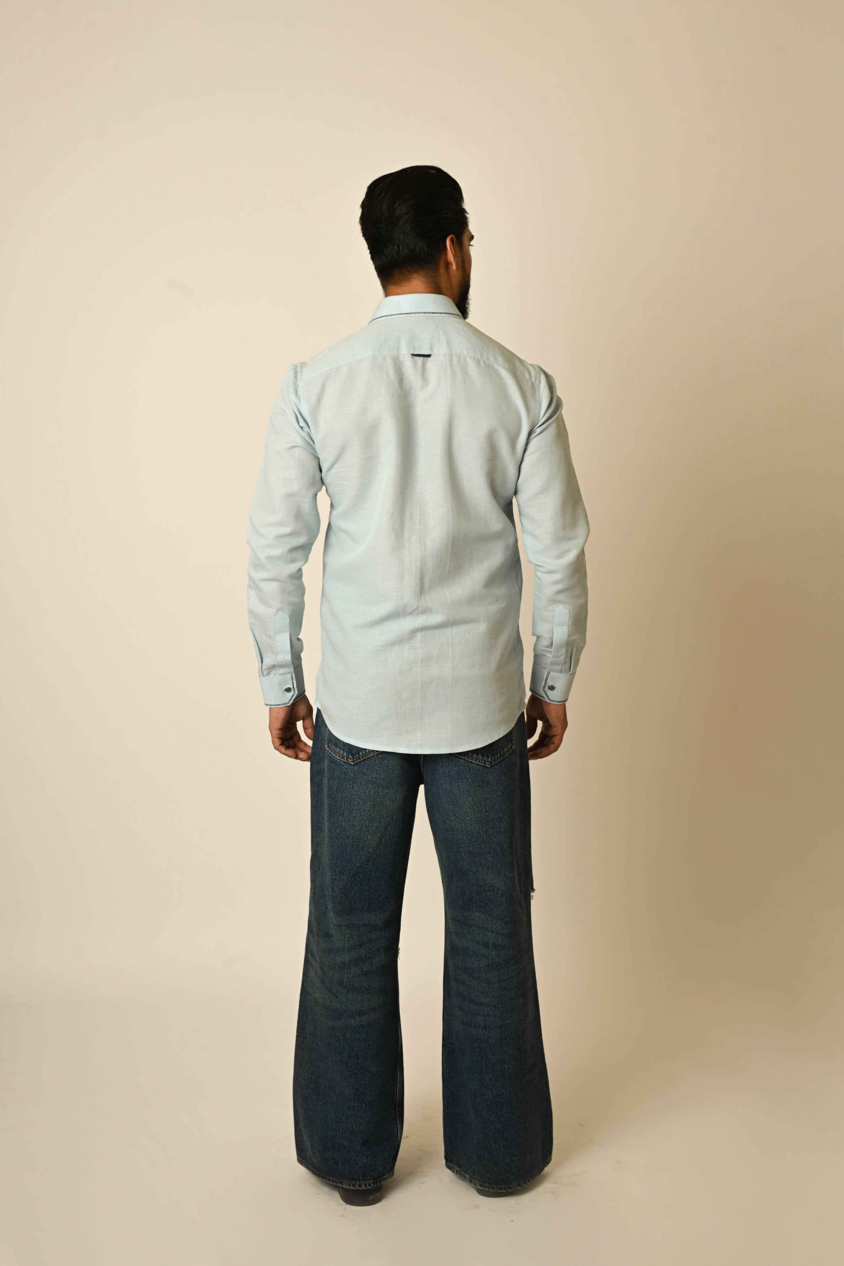 Pair your depth powder blue linen shirt with white or light beige chinos for a timeless casual look