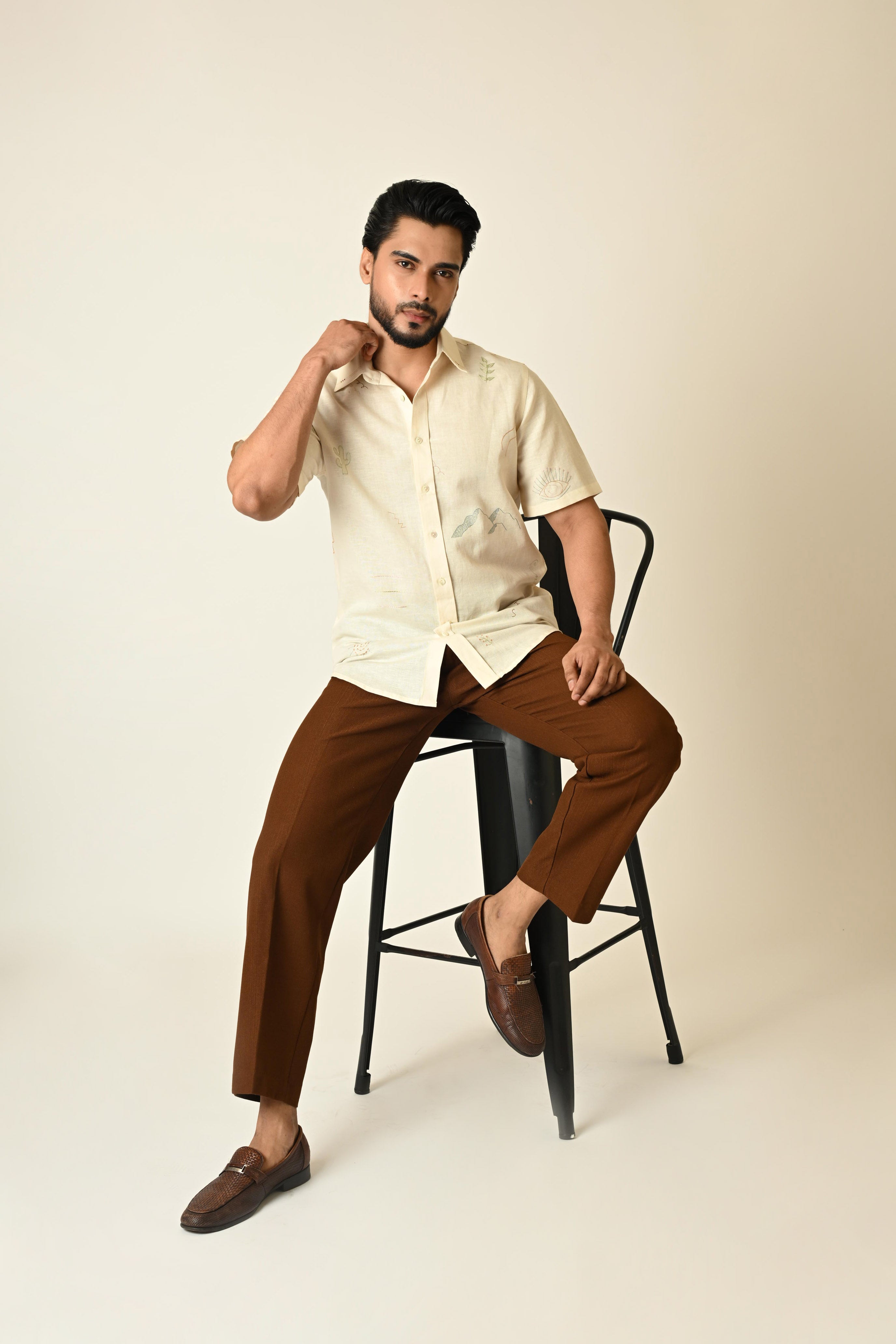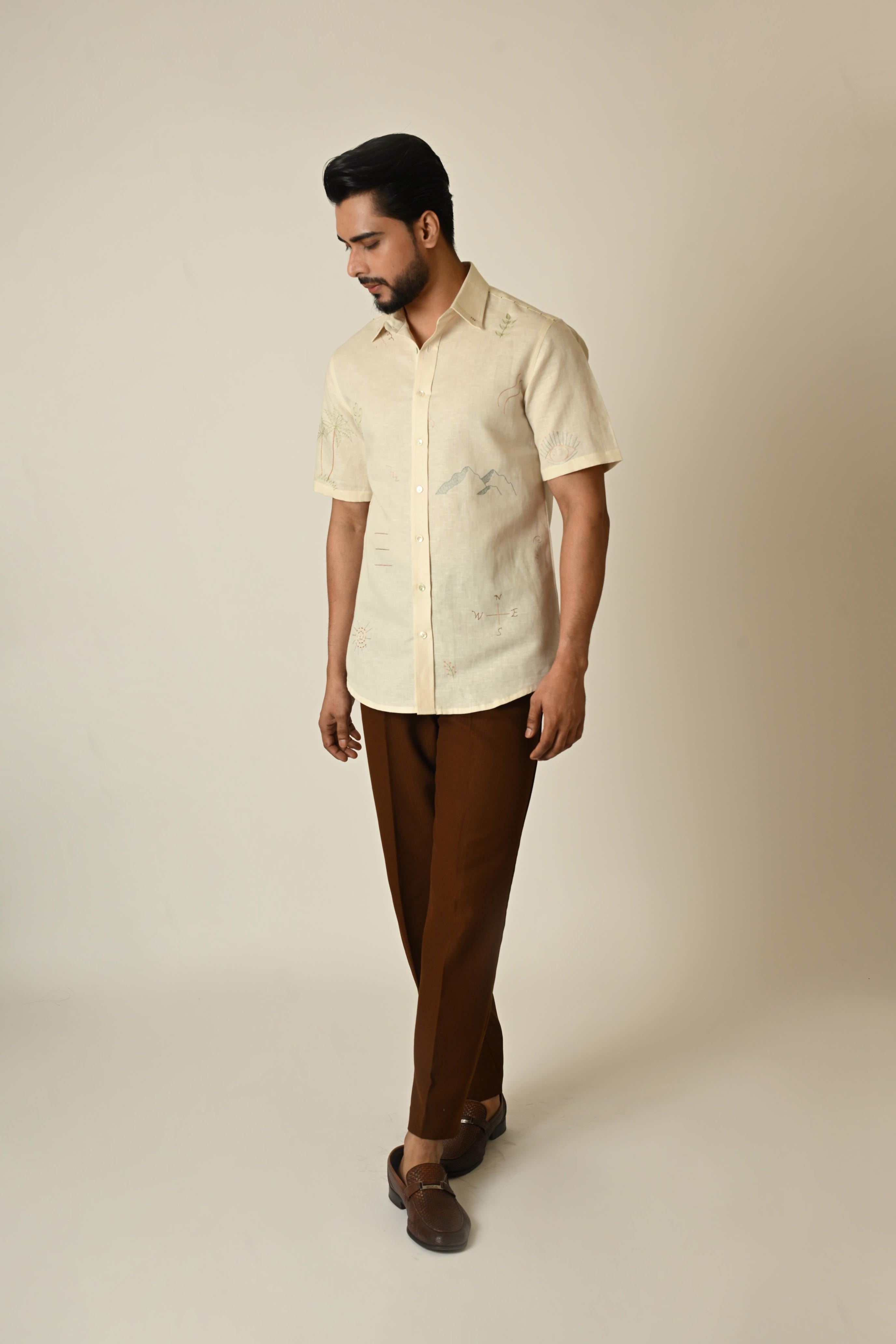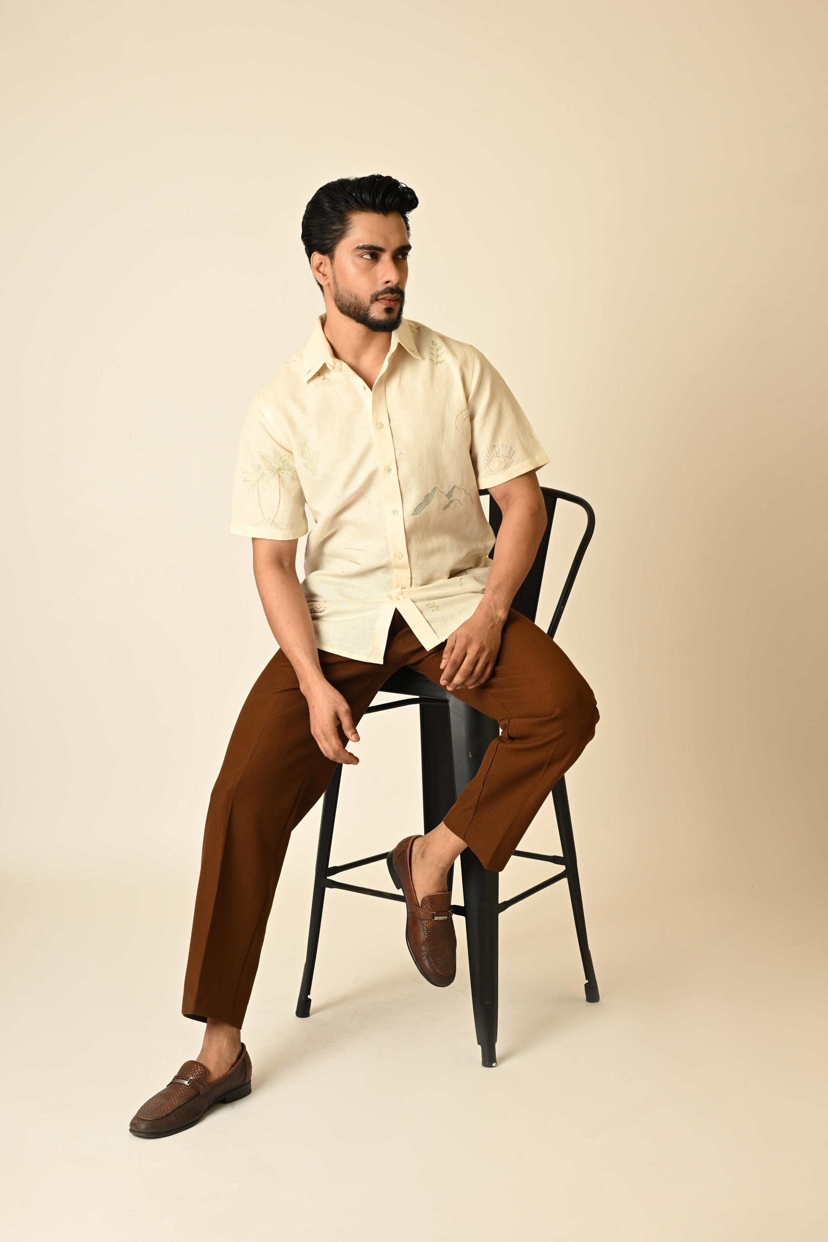 Paired your cream colour pure linen shirt with brown trouser for enhance your look.