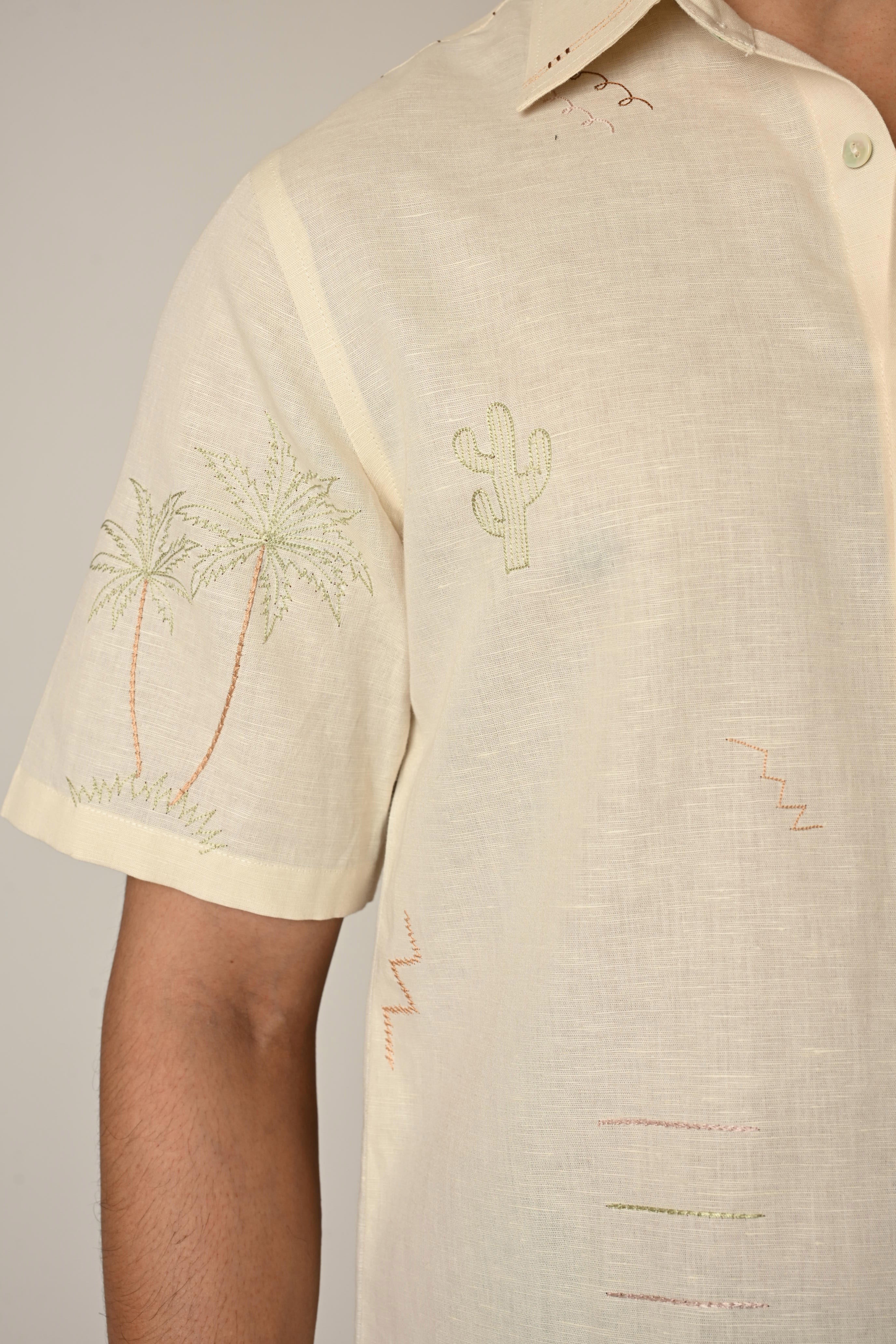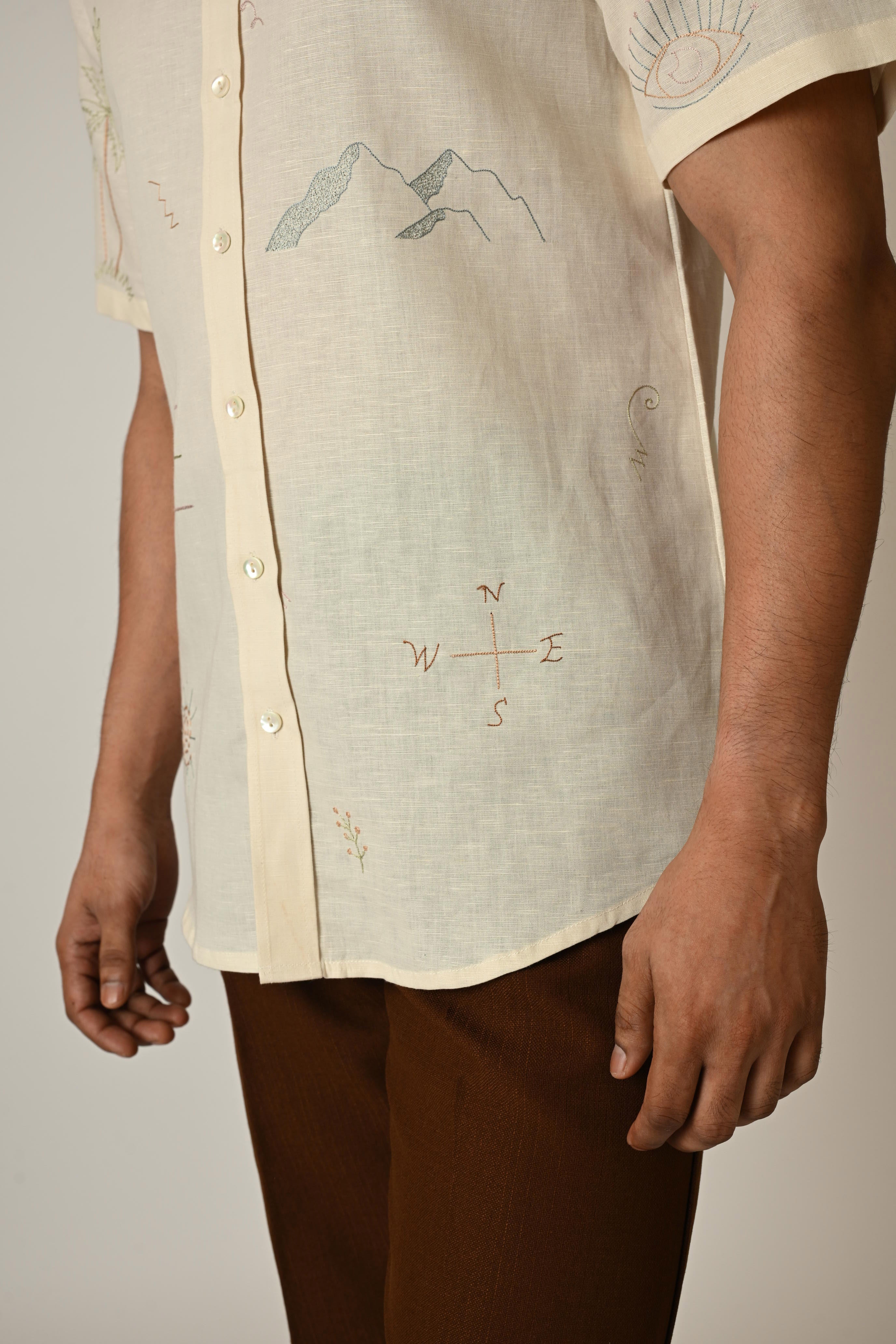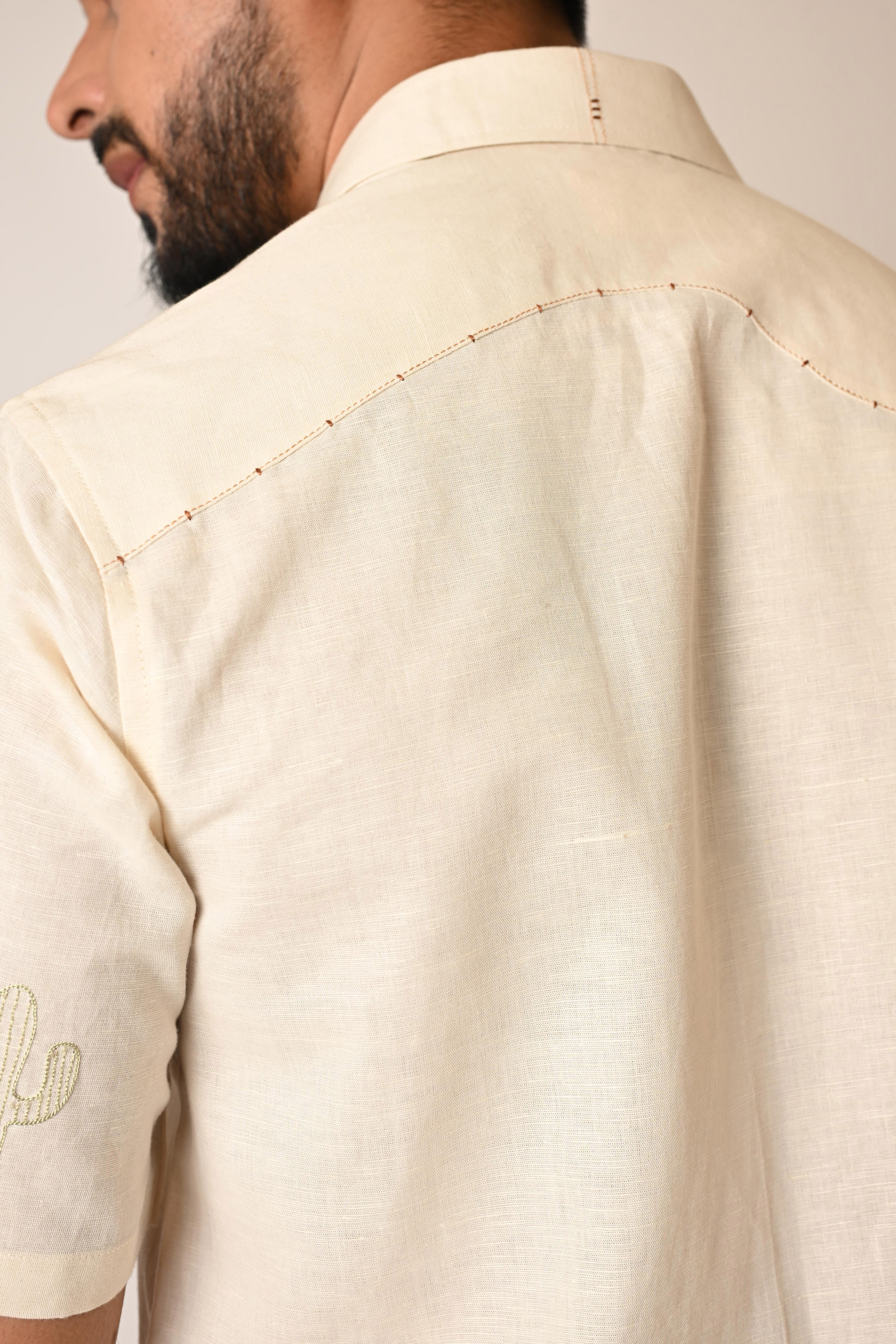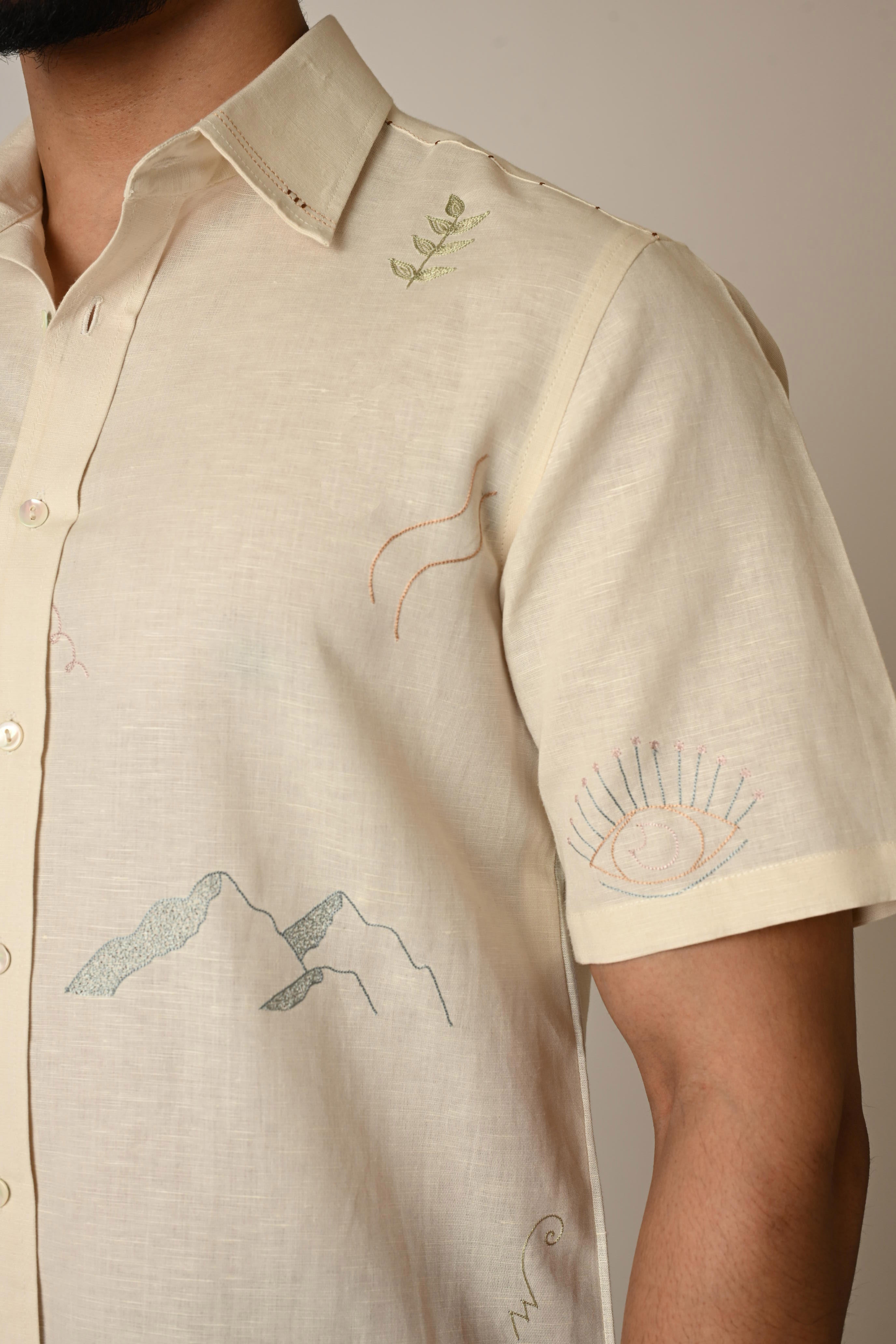 | A cream half sleeved shirt in pure linen with thread embroidery done in small doodle motifs using pastel tones. It also has a curved shaped back shoulder with minimal detailing. |