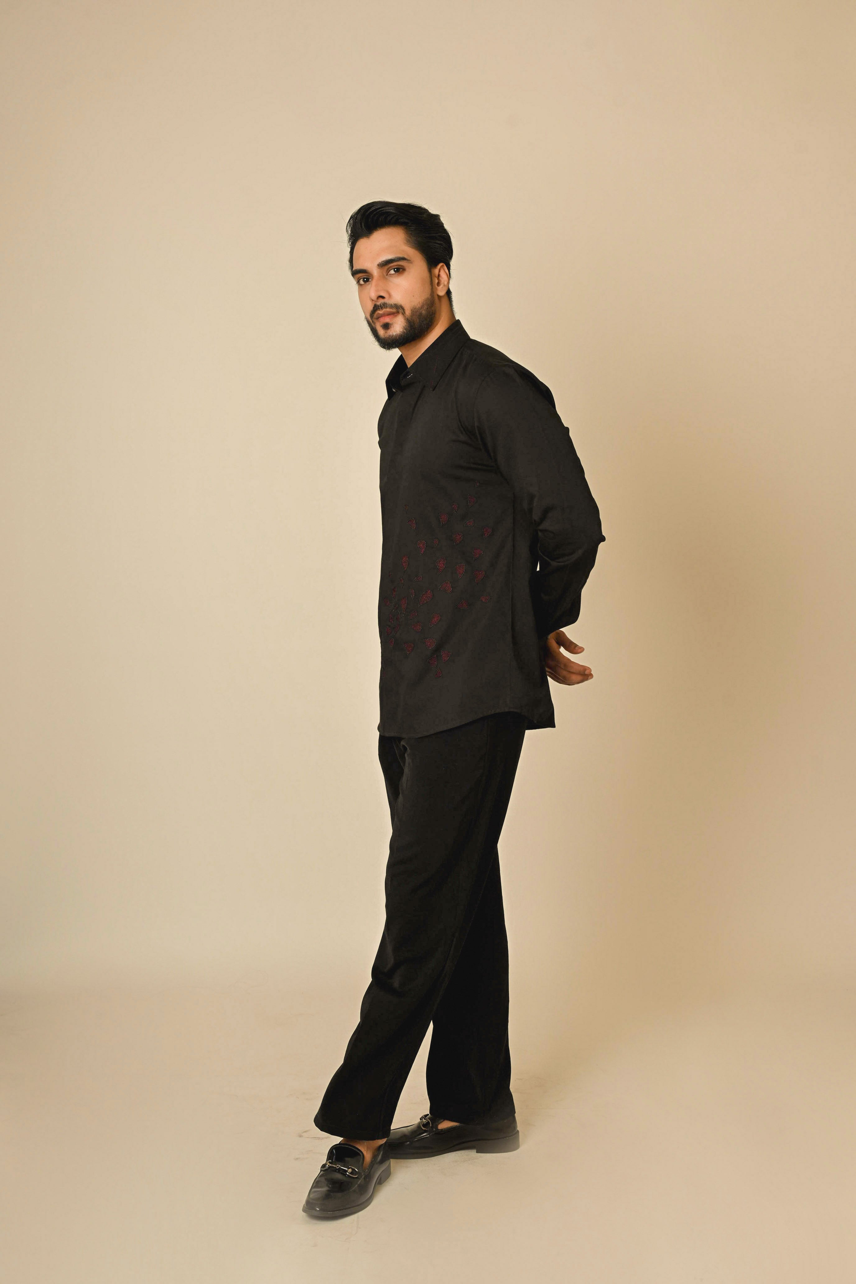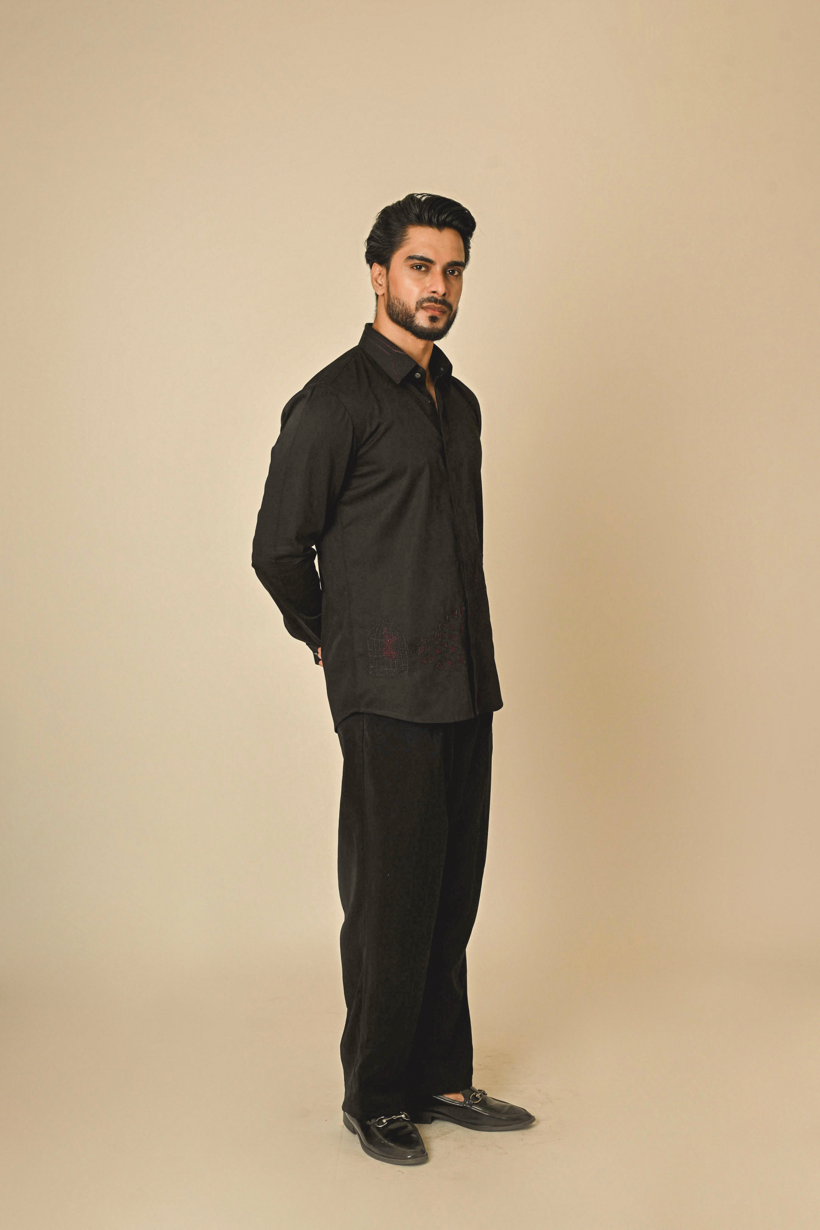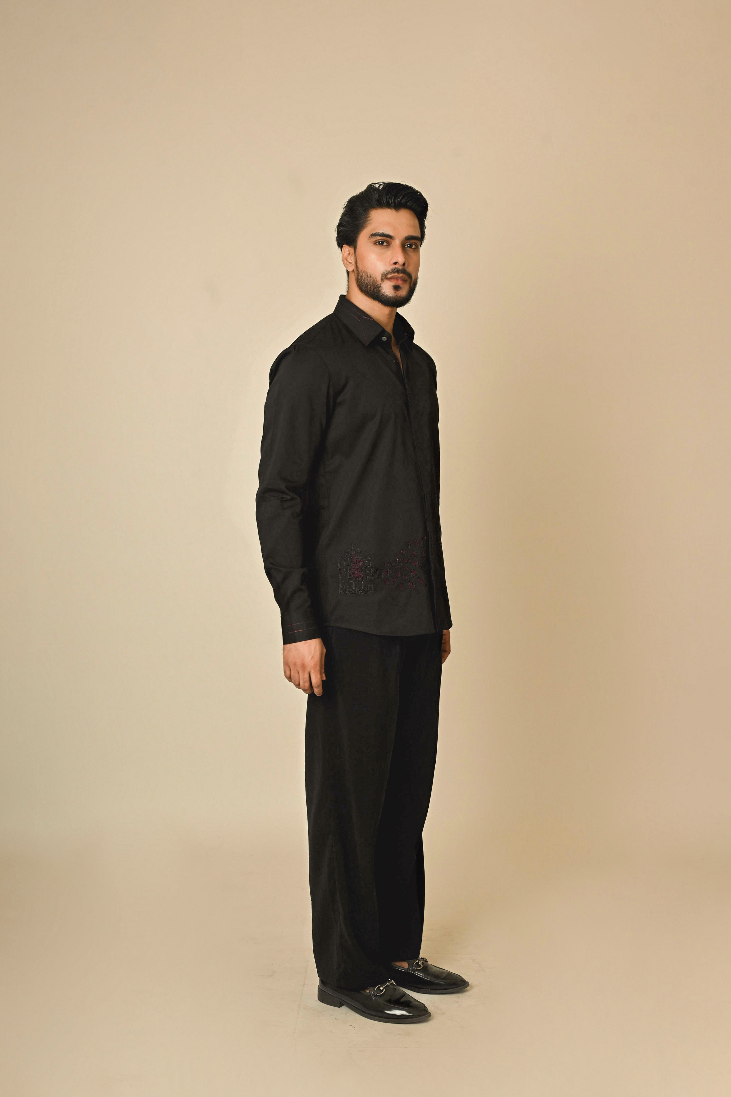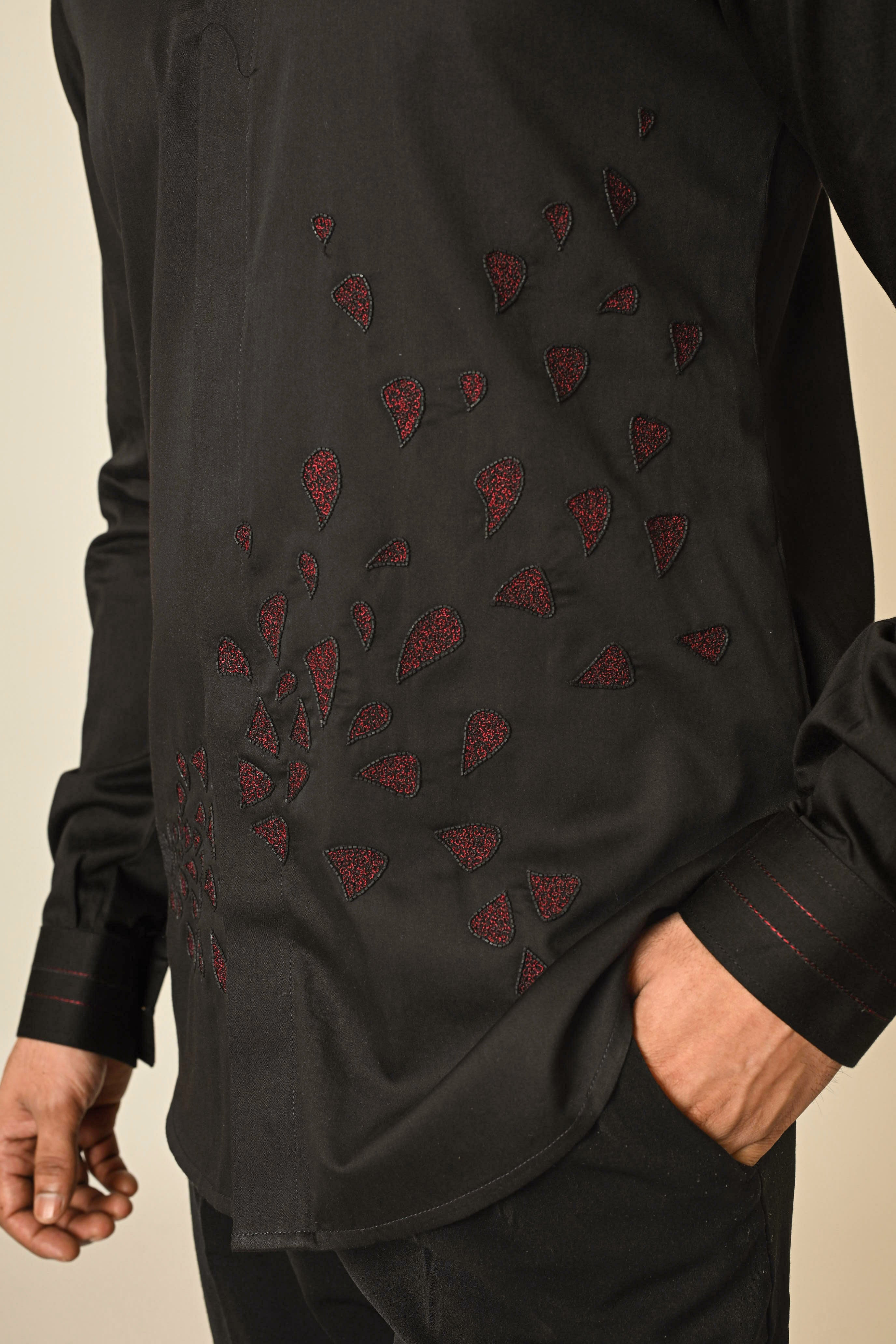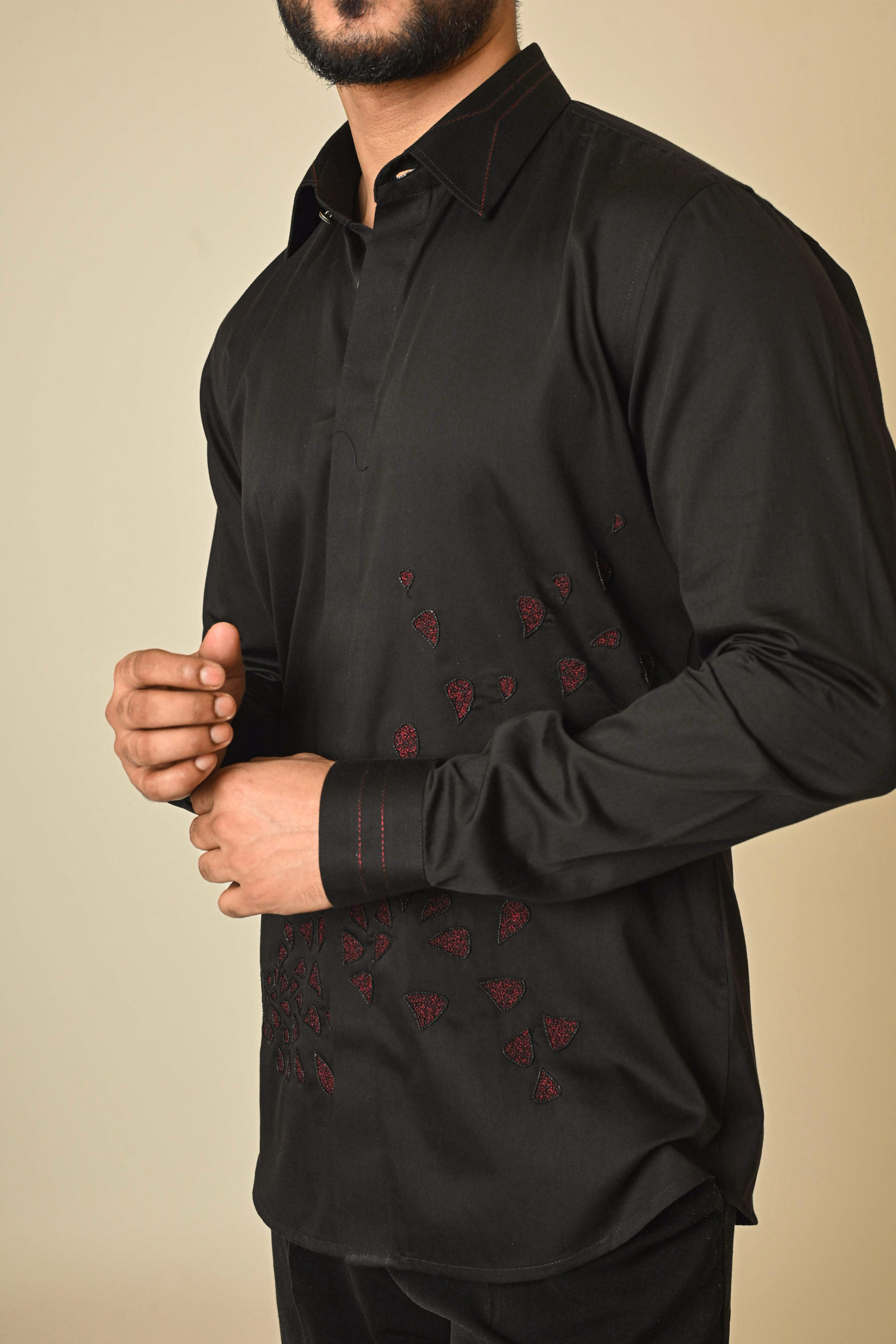 A black cotton shirt embellished with the use of matte katdana and threadwork depicting an emotion of freedom; an escape from the cage